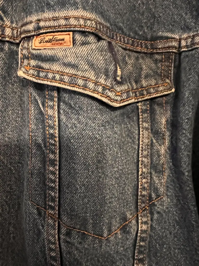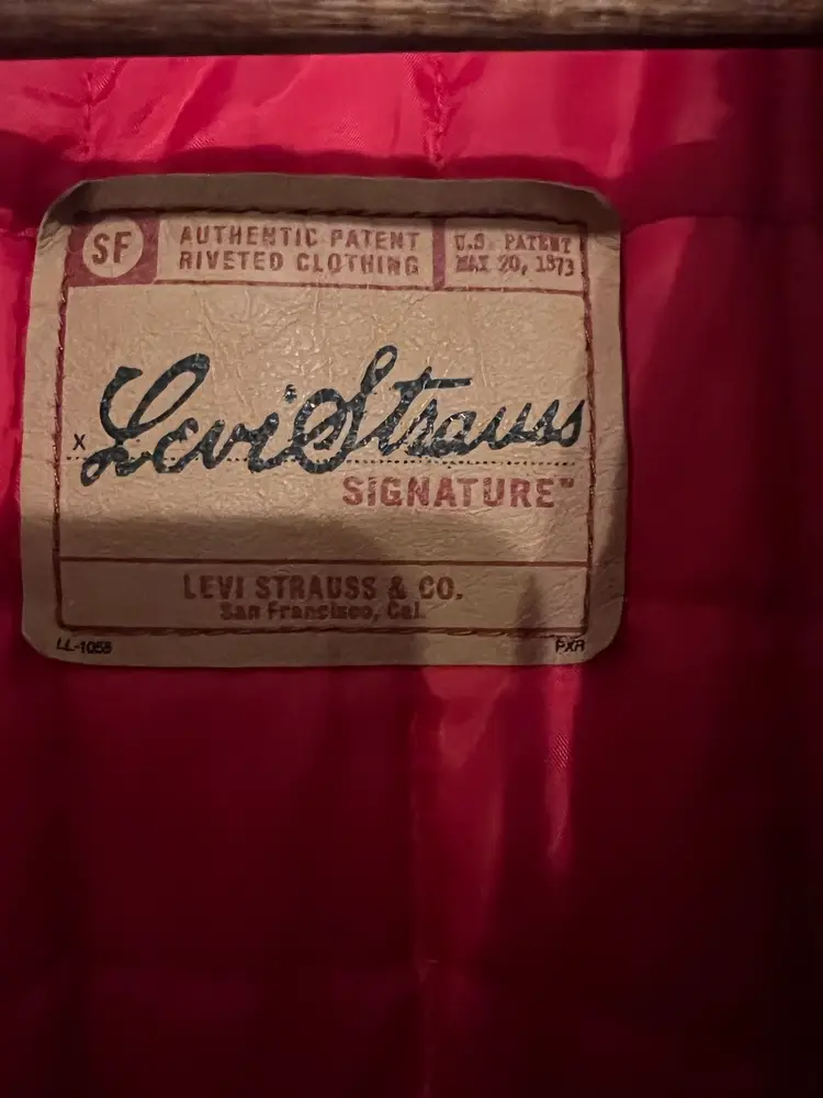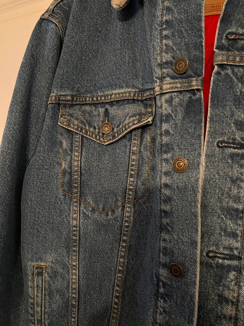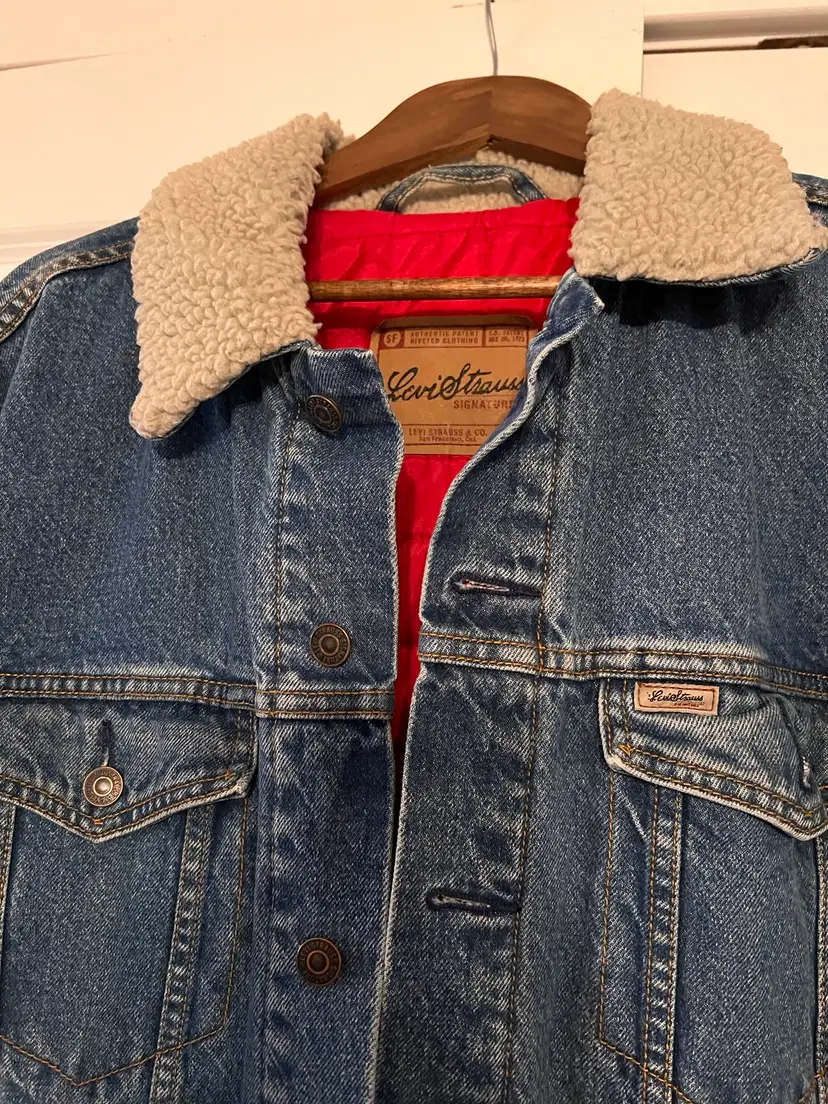 Jacket has Sherpa collar and red quilted lining. Measurements as follows: 20” shoulder to shoulder 44” Chest 40” waist 24” shoulder to wrist