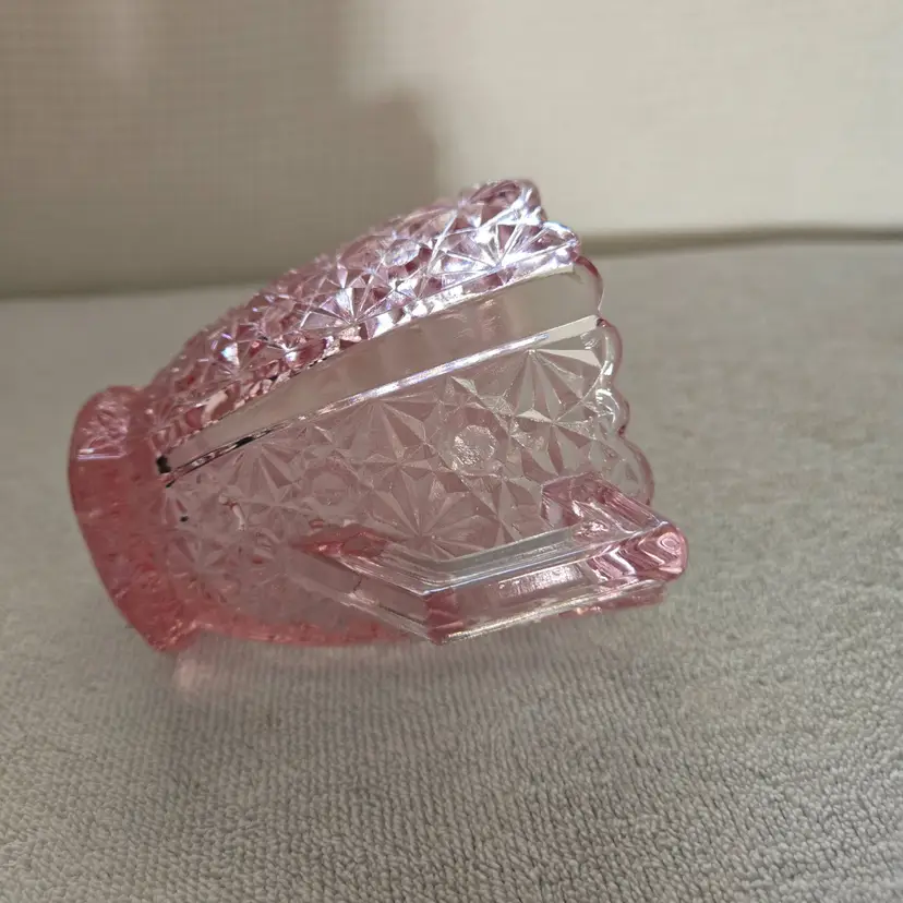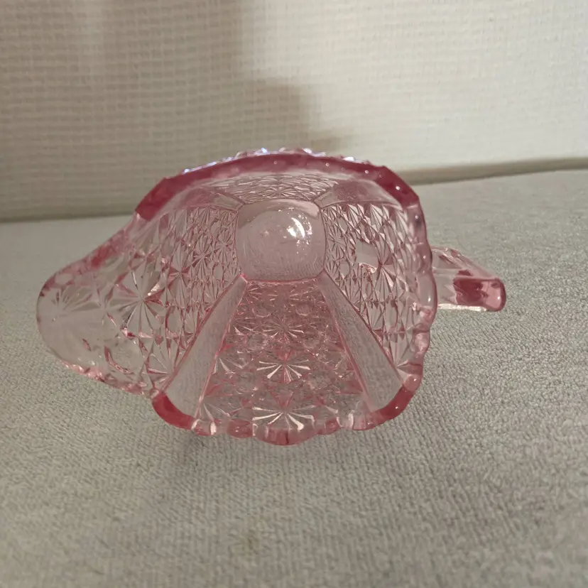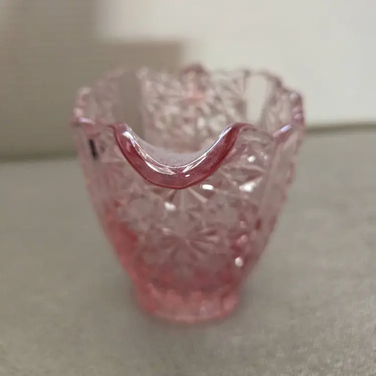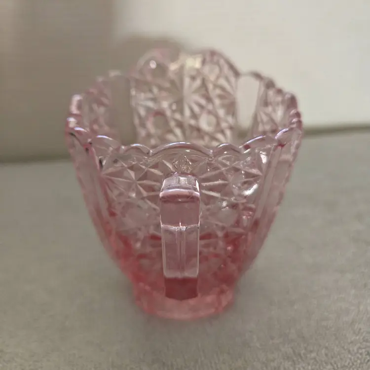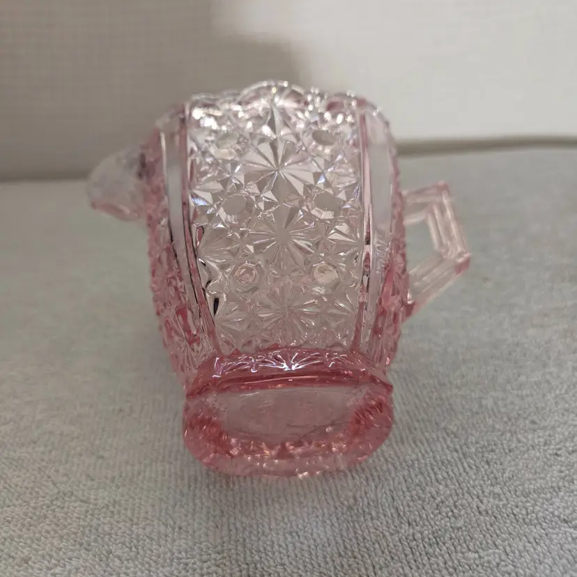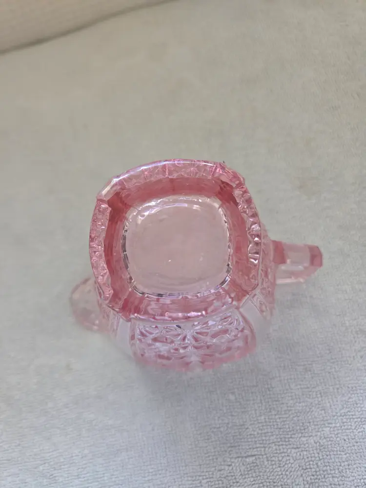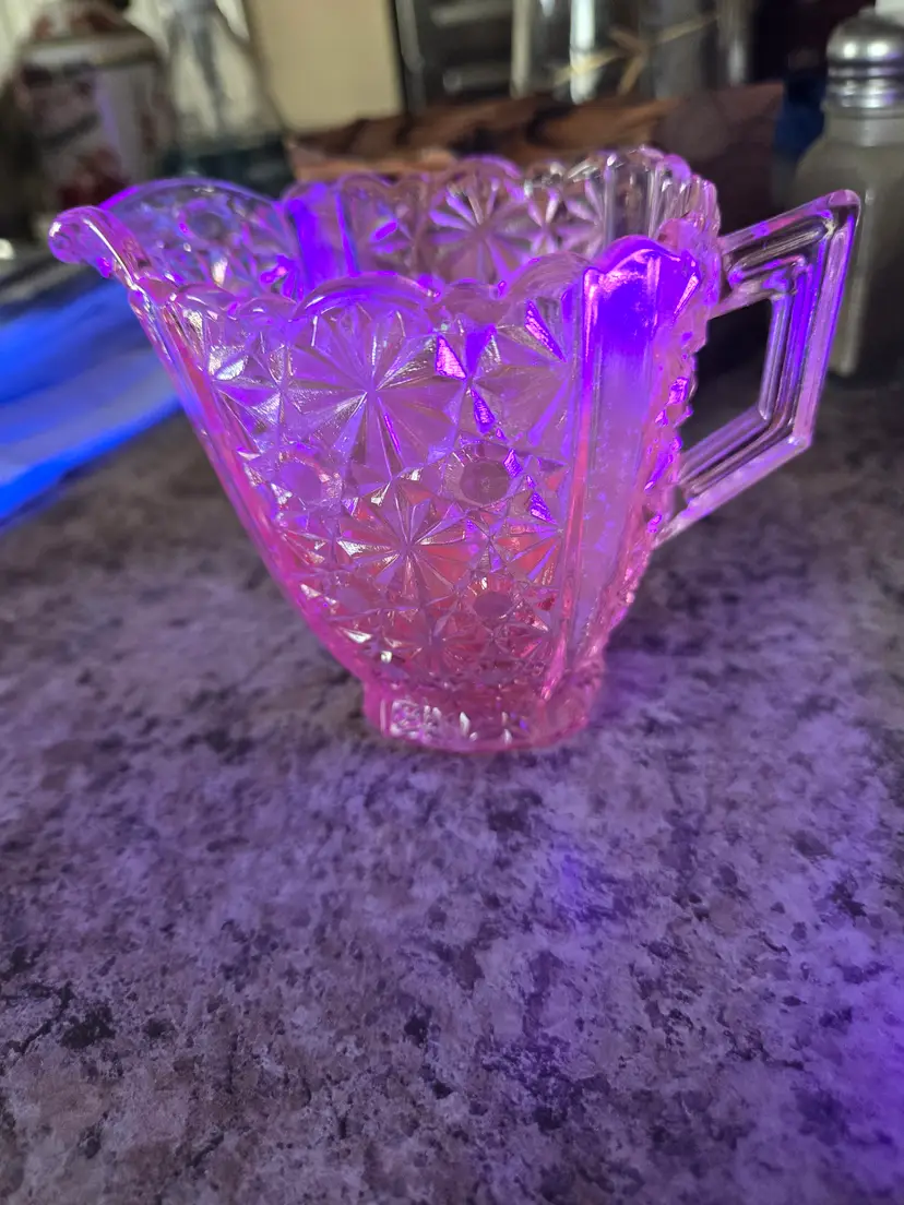 Pressed glass creamer with a scalloped edge. Very well crafted and has a beautiful orange glow. Measures 3 3/4" tall 4 3/4" from spout to handle. 2 " across the bottom. Beautiful addition to your depression glass. No chips, cracks, or repairs.