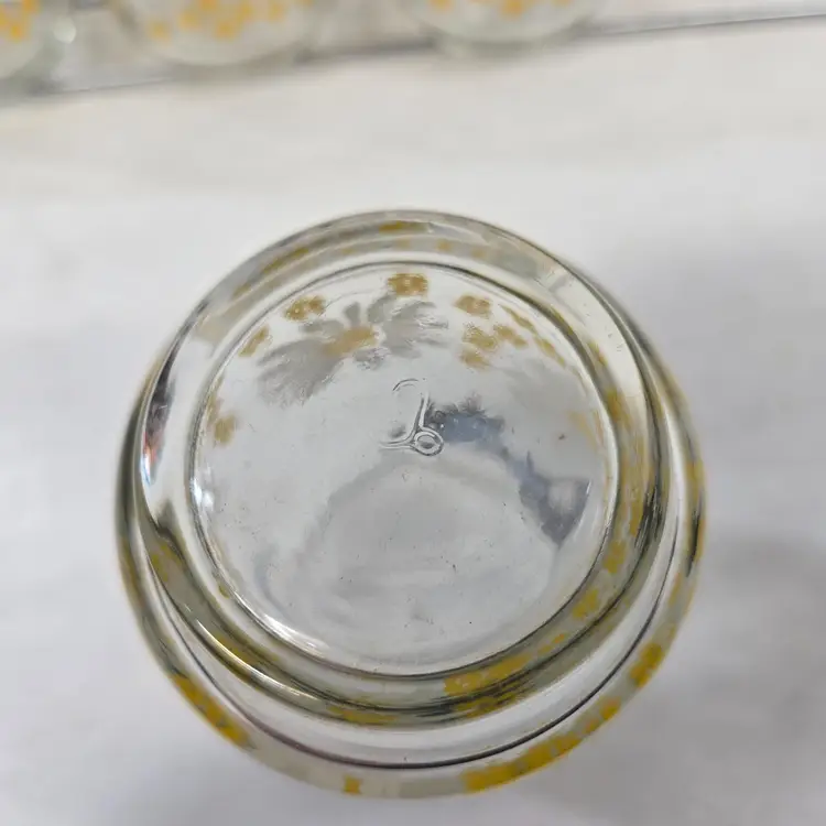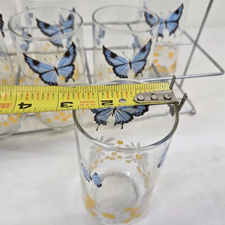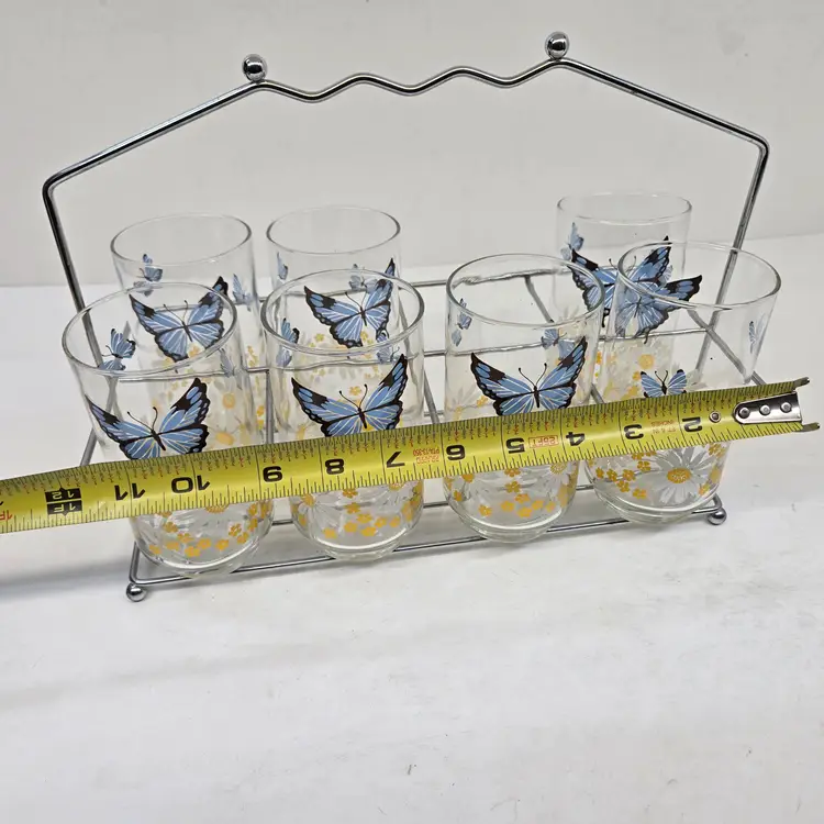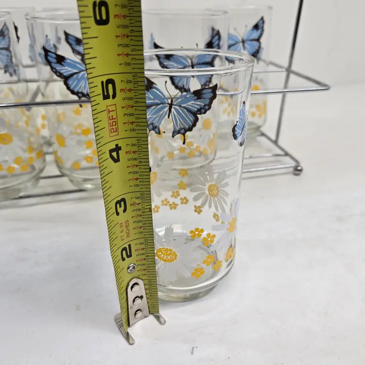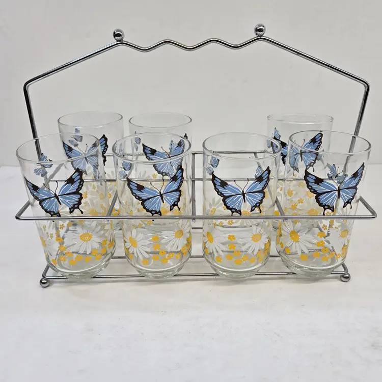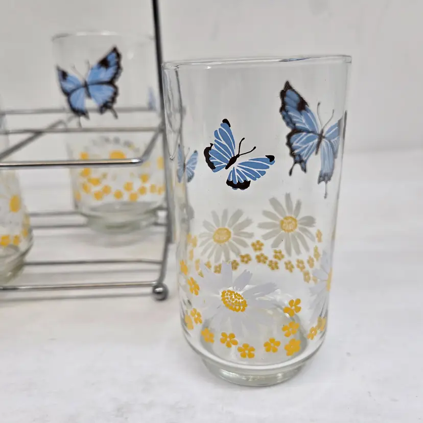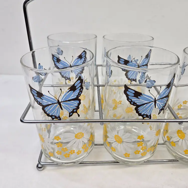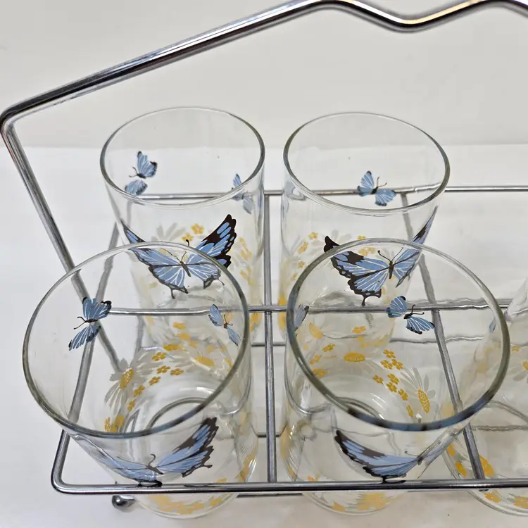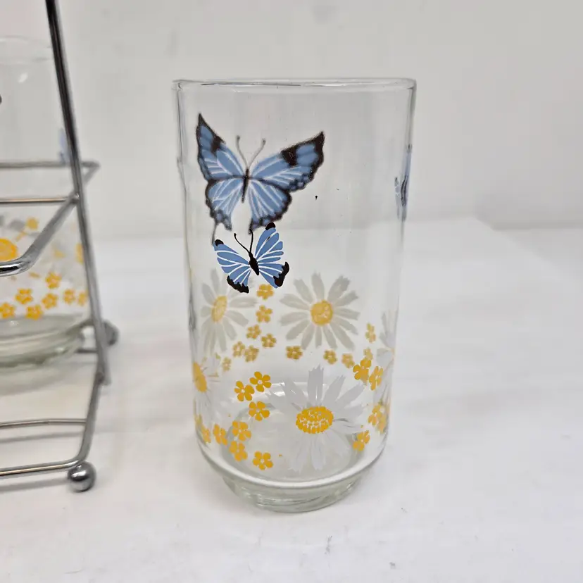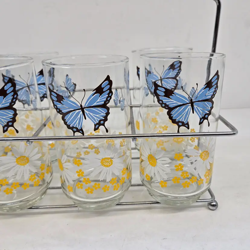Vintage Libbey Blue Butterfly Daisy Floral Drinking Glasses Set of 7 Carry Rack