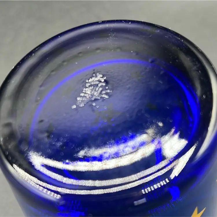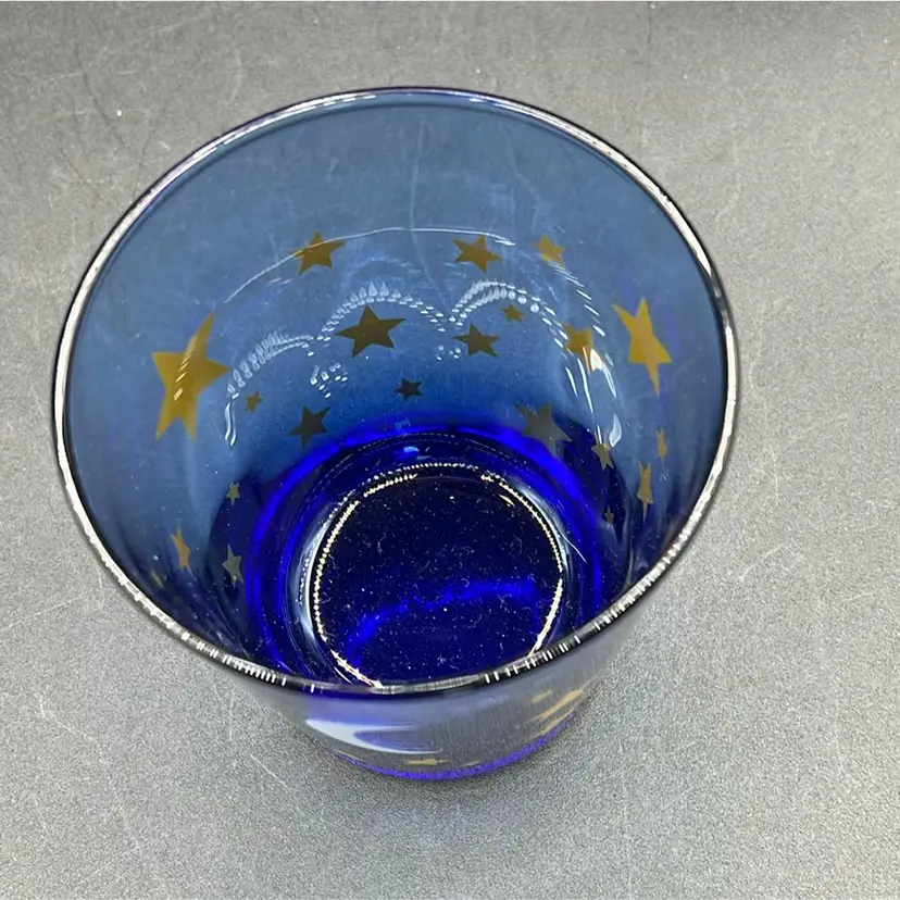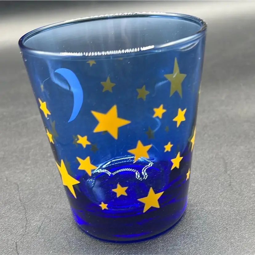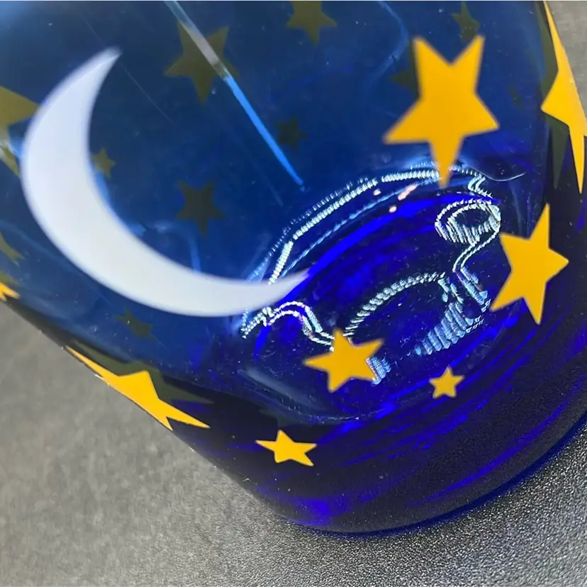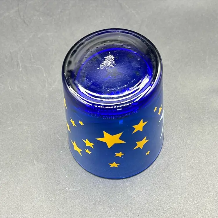 Manufacturer: Libbey Glass Company. Design: Cobalt blue glass with a printed pattern of stars and a crescent moon. Type: Double Old Fashioned tumbler or drinking glass. Era: Vintage, commonly attributed to the 1990s.