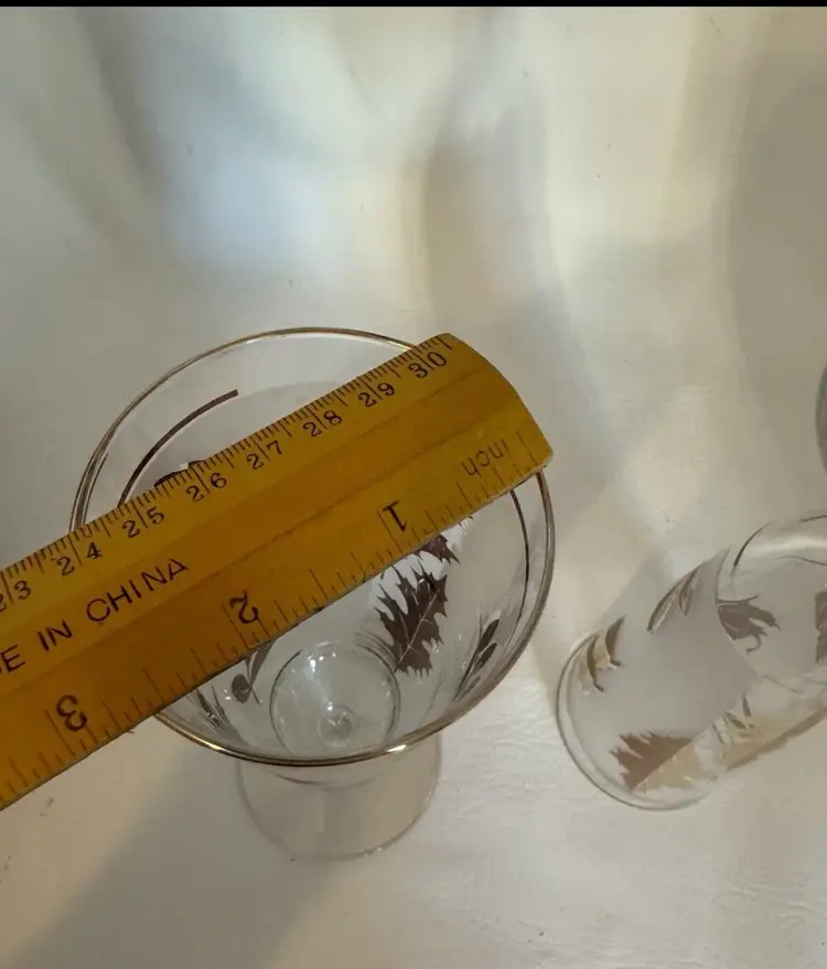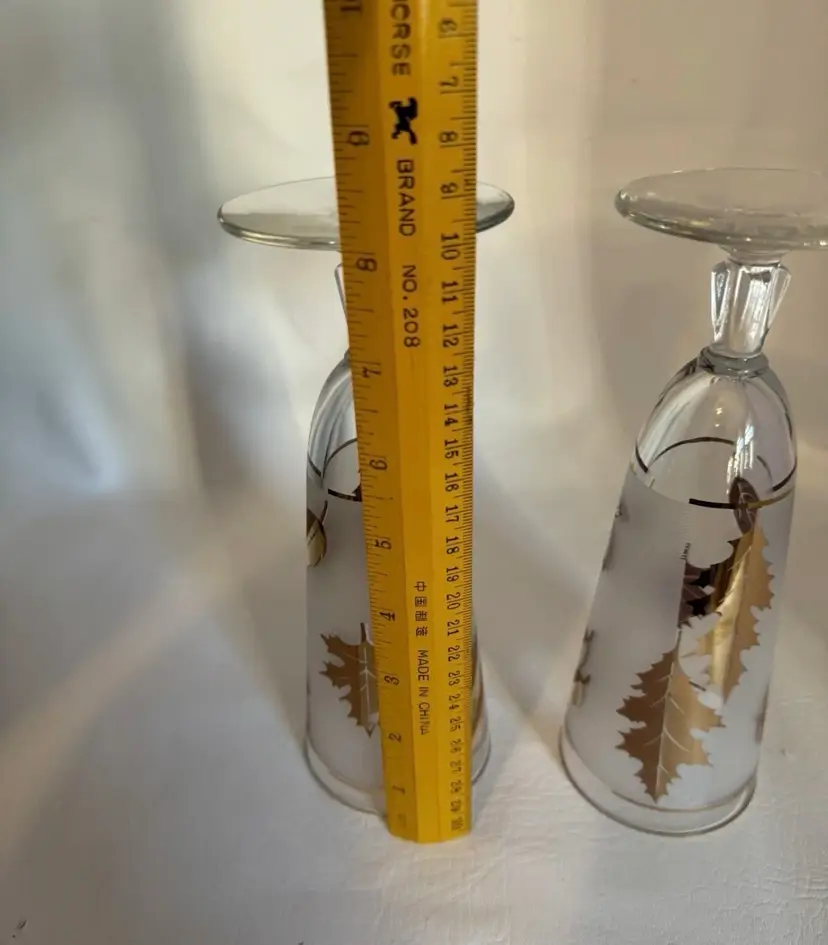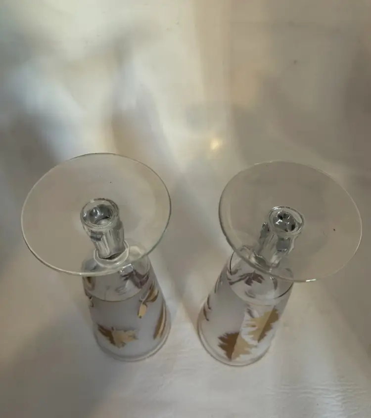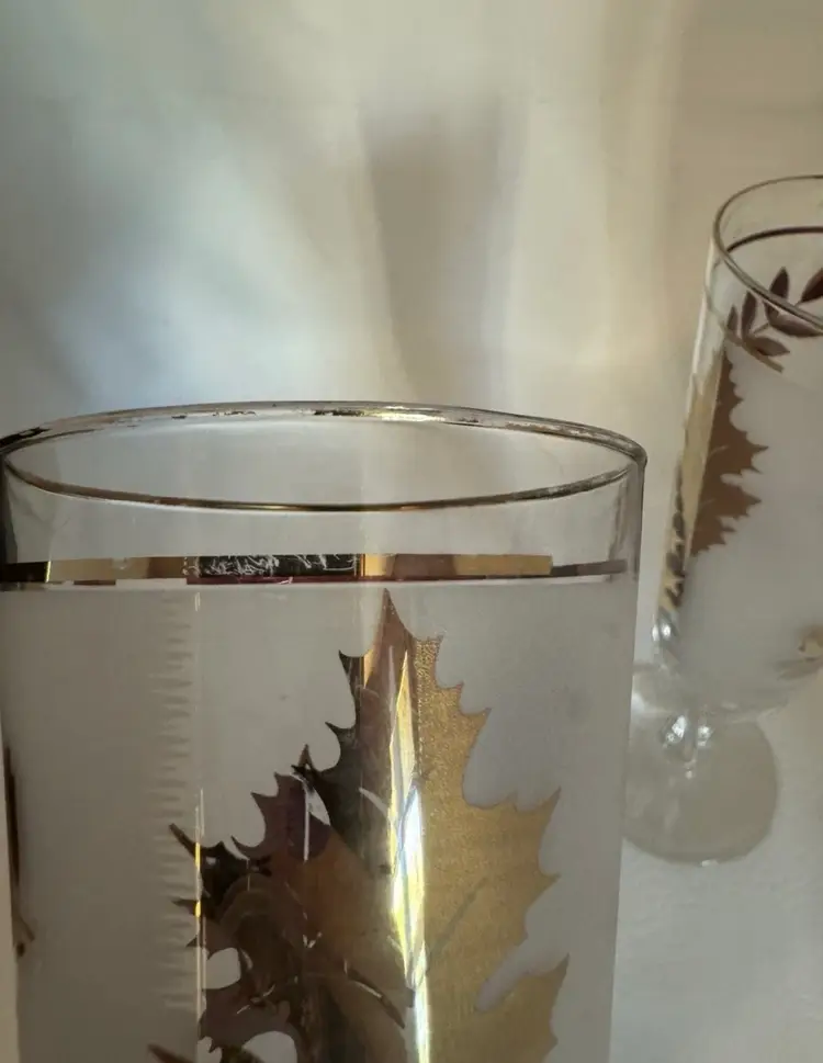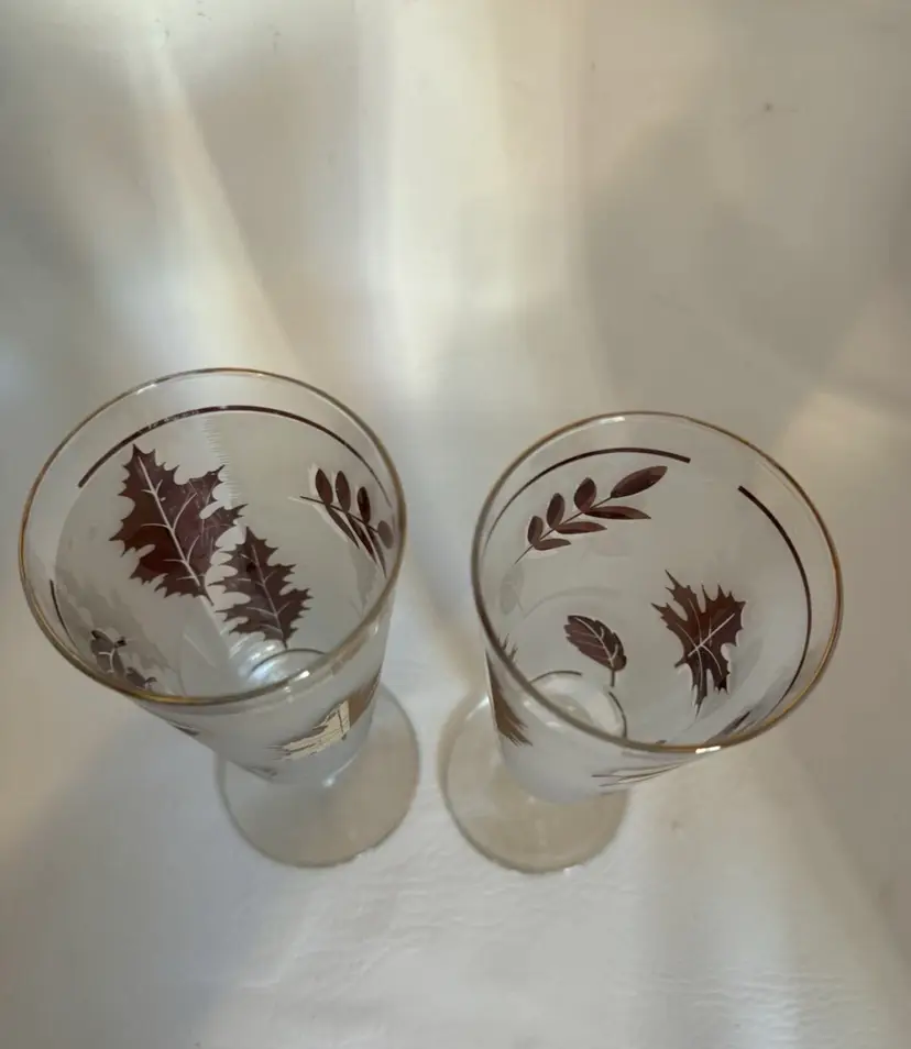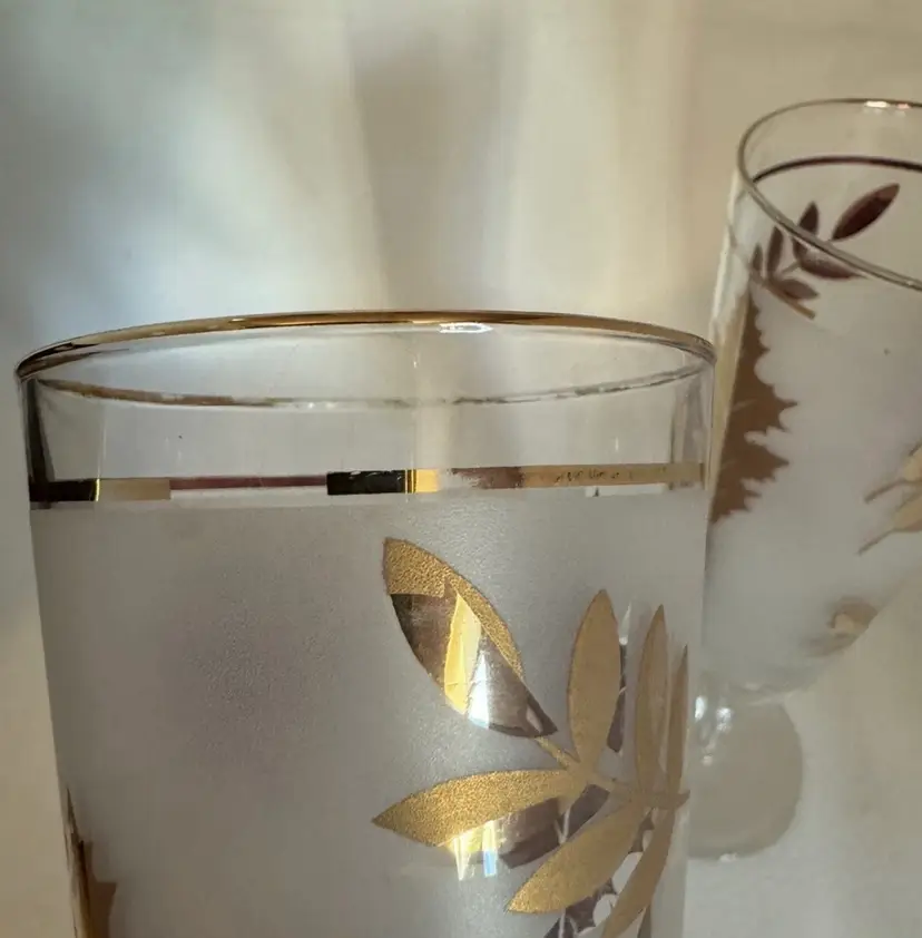 Elevate your barware collection with this vintage set of two Libbey Frosted Gold Leaf Pilsner Glasses. The glasses feature a beautiful gold color and a unique leaf pattern that adds a touch of elegance to any cold beverage. Perfect for a MCM-themed home bar or for collectors of vintage glassware.