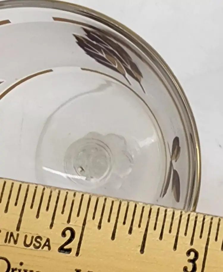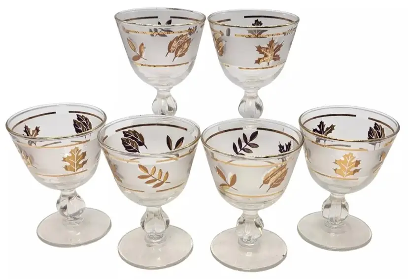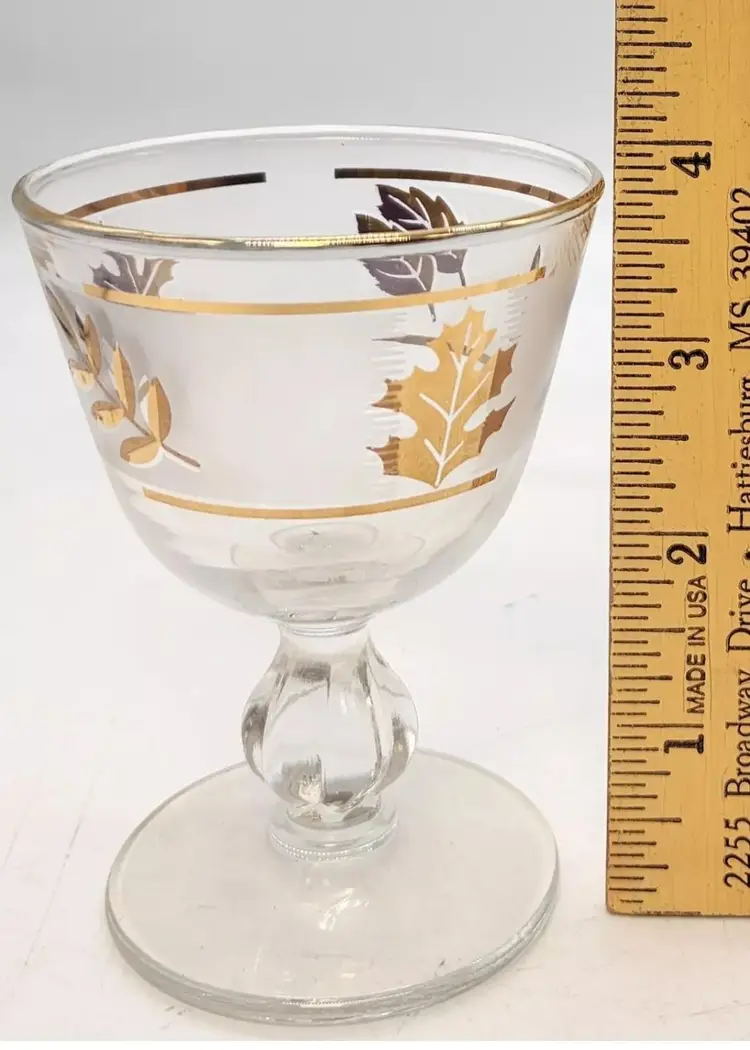 Add a touch of elegance to your drinkware collection with this set of six vintage Libbey sherry glasses. The glasses feature a beautiful golden foliage pattern and a unique footed stem design. Perfect for all occasions, these glasses are sure to impress your guests and elevate your drinking experience. Crafted from high-quality glass and etched with precision, these glasses are both durable and stylish. With a height of 3 7/8 inches, they are perfect for serving sherry, dessert wine, or any other beverage. These glasses are a true Mid-Century Modern gem and a must-have for any vintage drinkware collector.