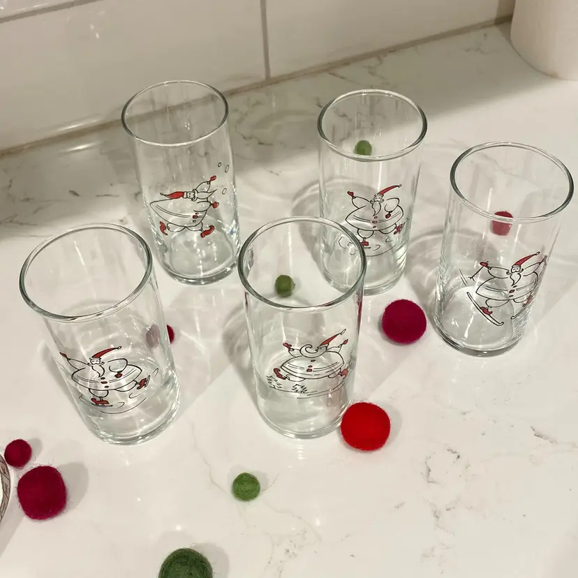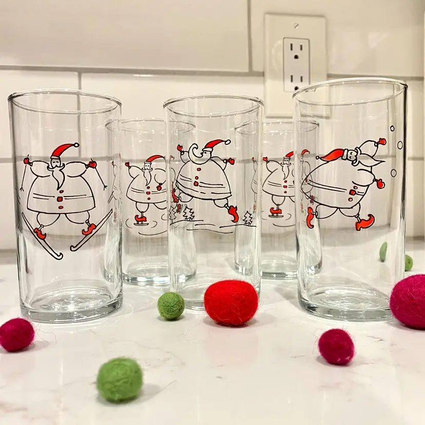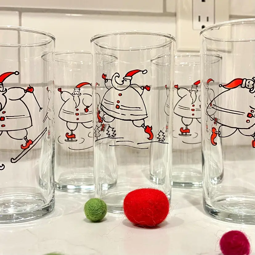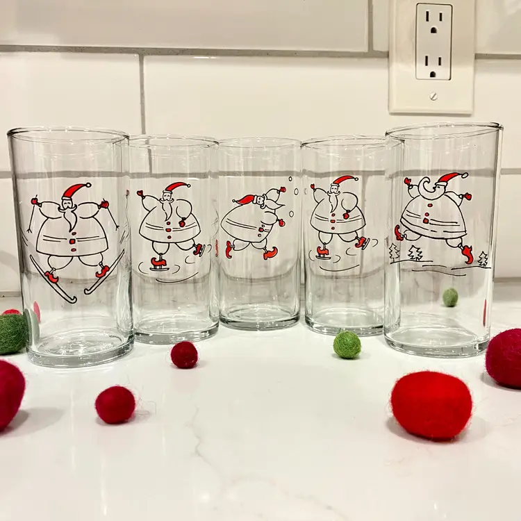Set of 5 vintage 8oz juice clear juice glasses each with a Santa enjoying an outdoor winter activity. There is one duplicate. Stamped with Libbey's L on the bottoms. In mint condition! 4.5" tall