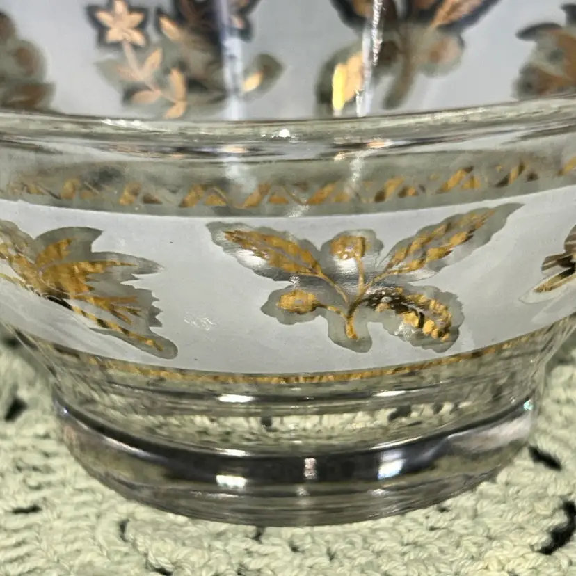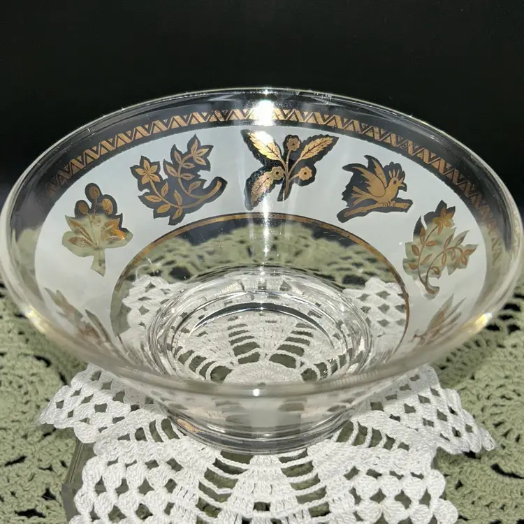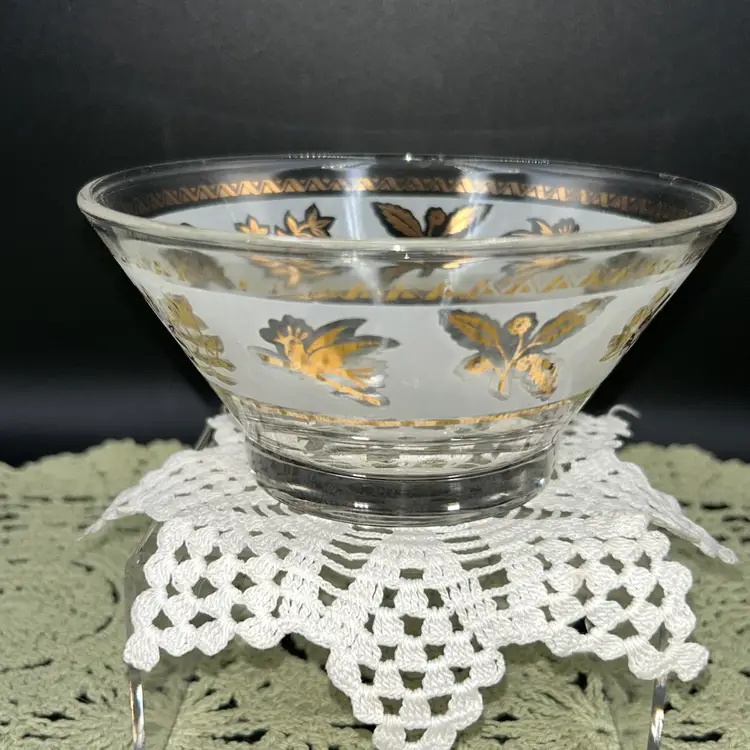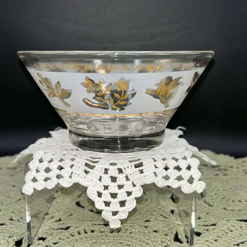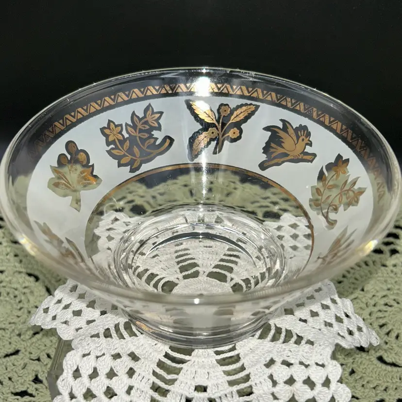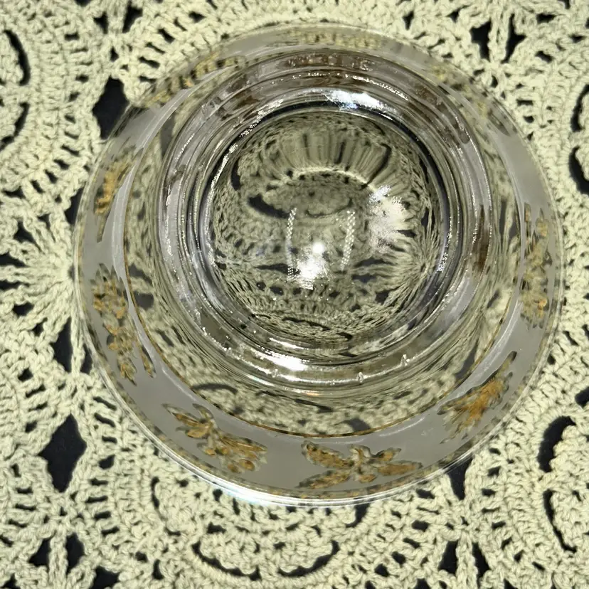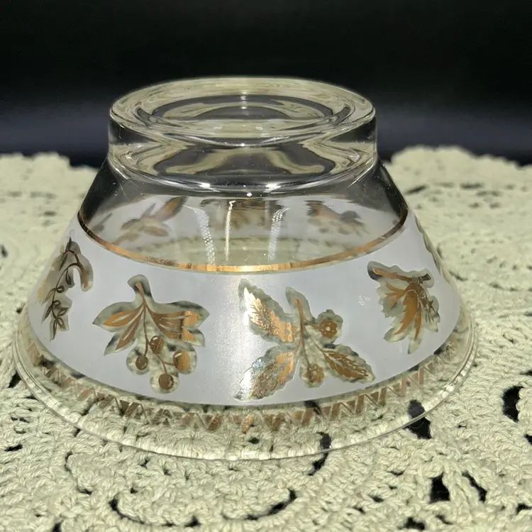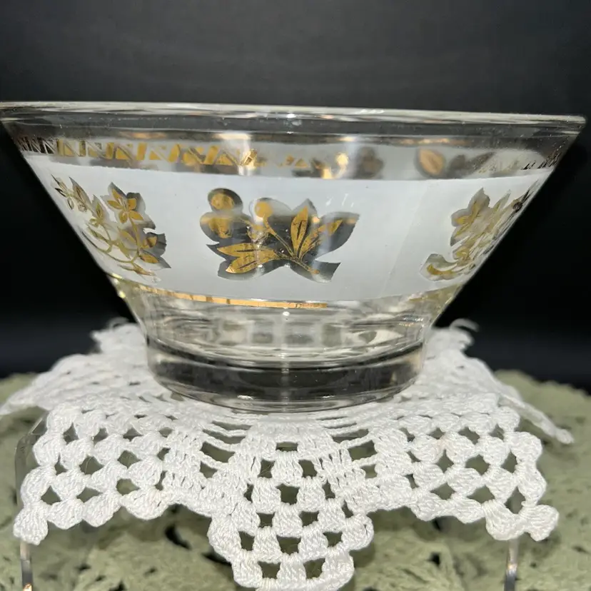 Dessert or berry bowl. 2.6” tall x 5” diameter top opening x 2.75” diameter base. Gold design shows signs of wear. Bowl itself is excellent condition; no chips or cracks.