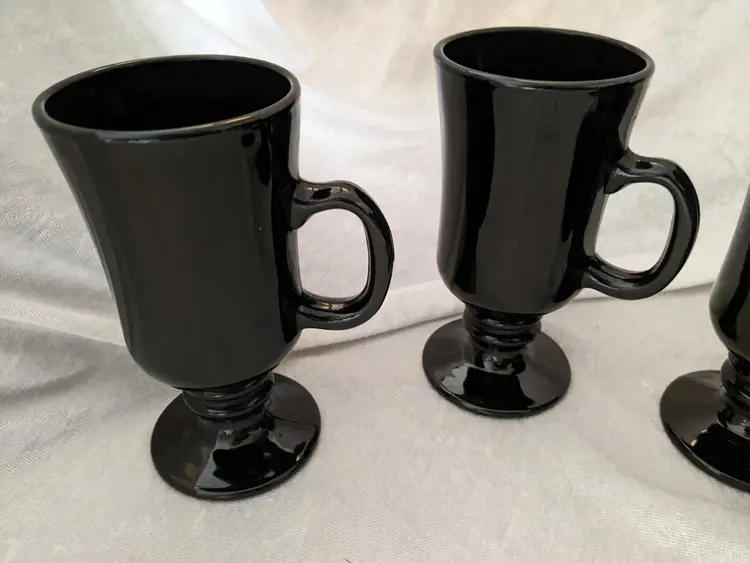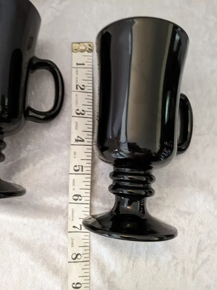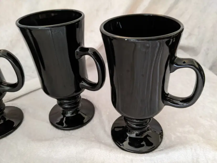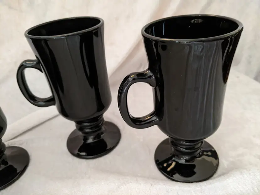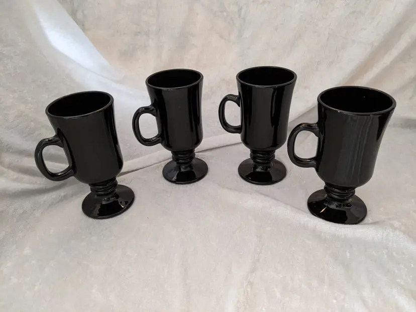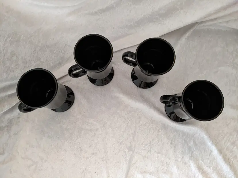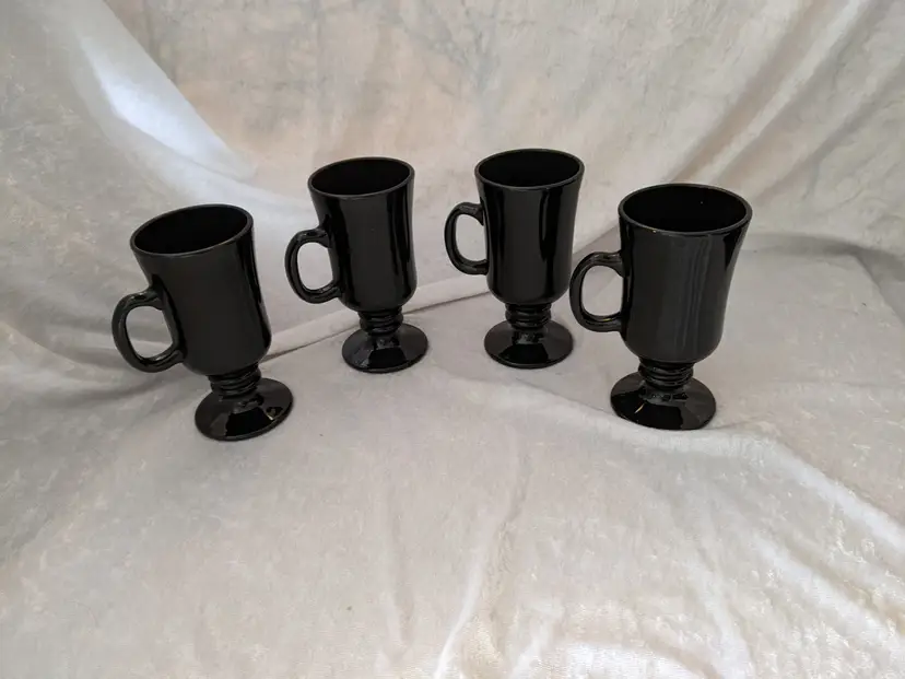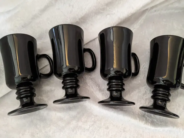 Set of 4 Vintage Libby Glass Black Footed Irish Coffee Mug 5 1/2" Tall Halloween Gothic Castlecore They are marked L. Perfect for any dark decor . All are in great condition no chips or cracks. Please check the photos for details.