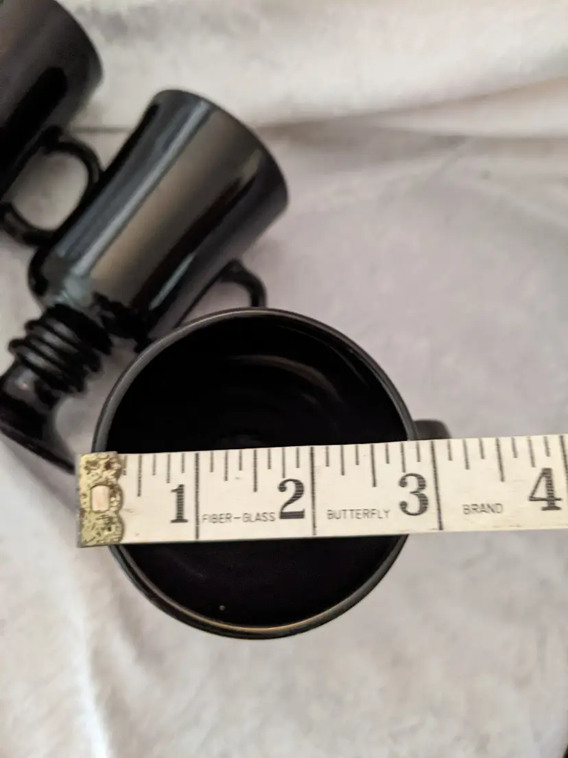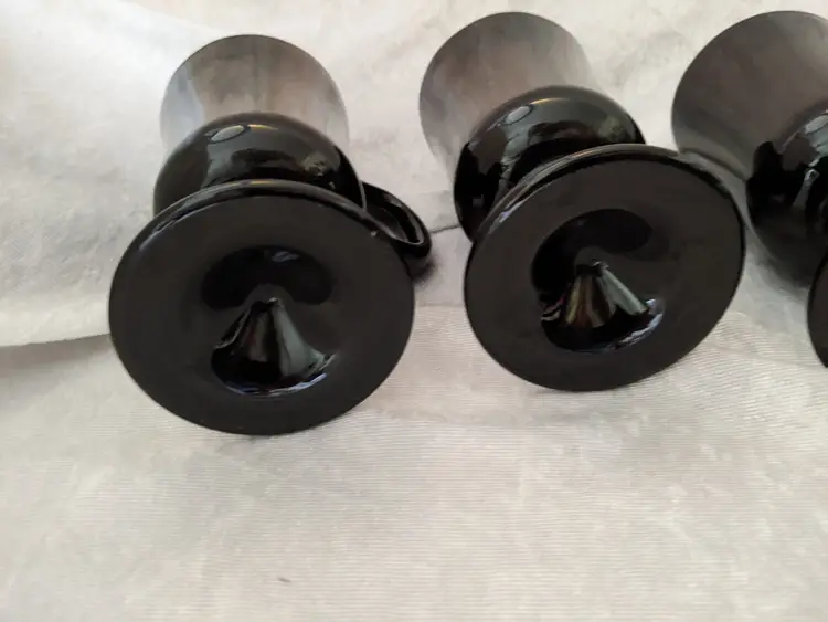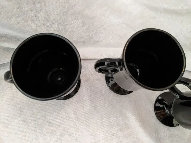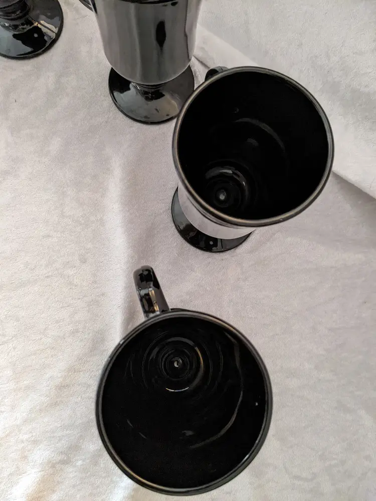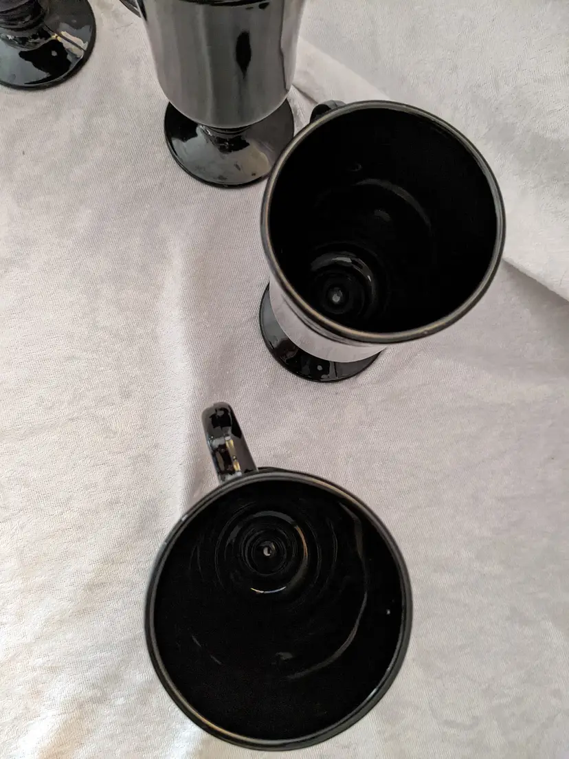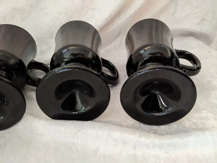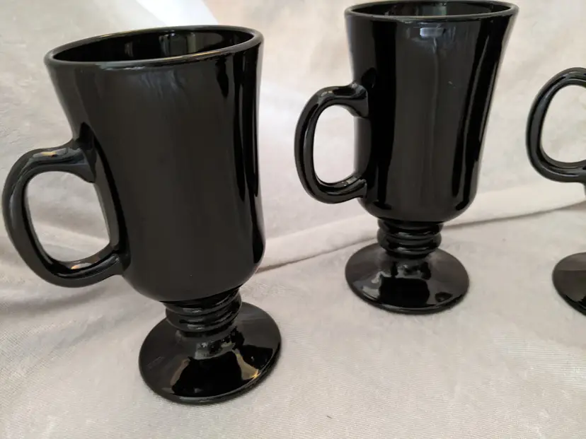 Set of 4 Vintage Libby Glass Black Footed Irish Coffee Mug 5 1/2" Tall Halloween Gothic Castlecore They are marked L. Perfect for any dark decor . All are in great condition no chips or cracks. Please check the photos for details.