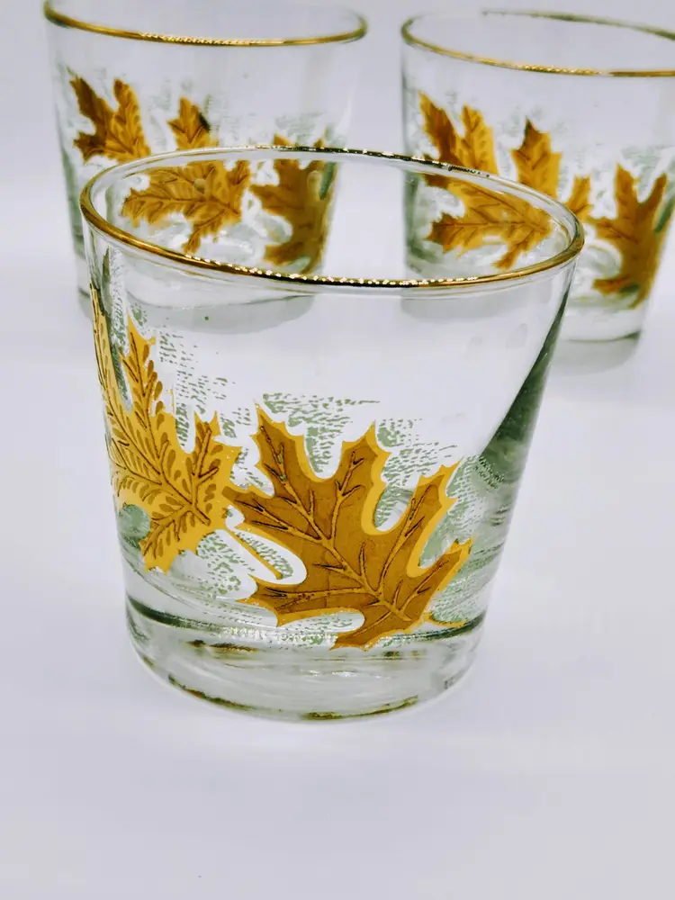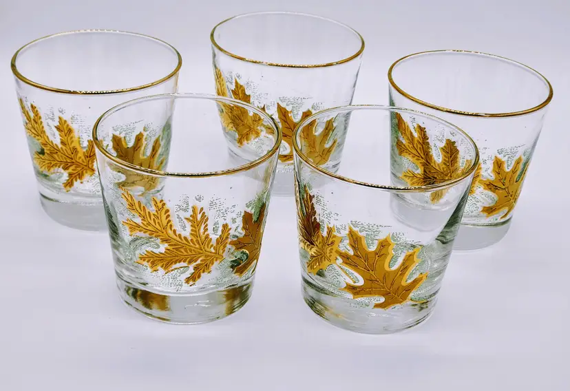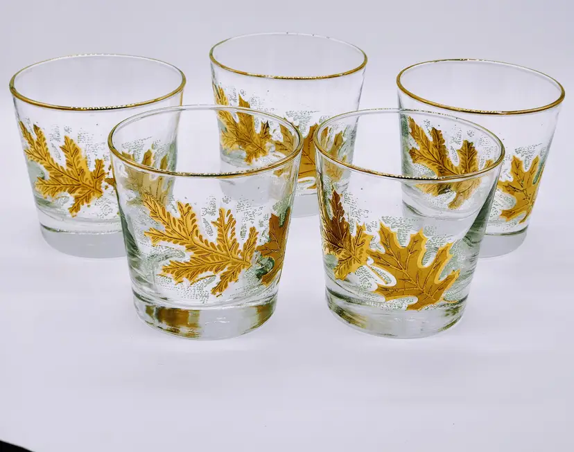 Set of 5 vintage Libby glass low ball tumblers featuring a beautiful leaf pattern with gold accents. They hold about 6oz each. Perfect for adding a touch of elegance to your drinkware collection. These glasses are in excellent condition with no chips or cracks.