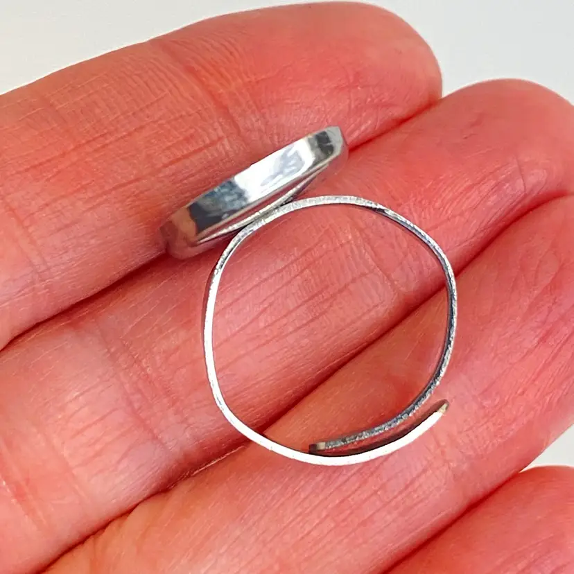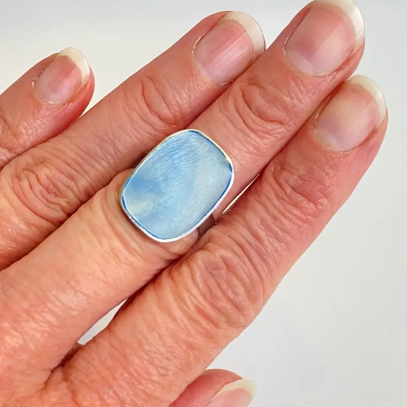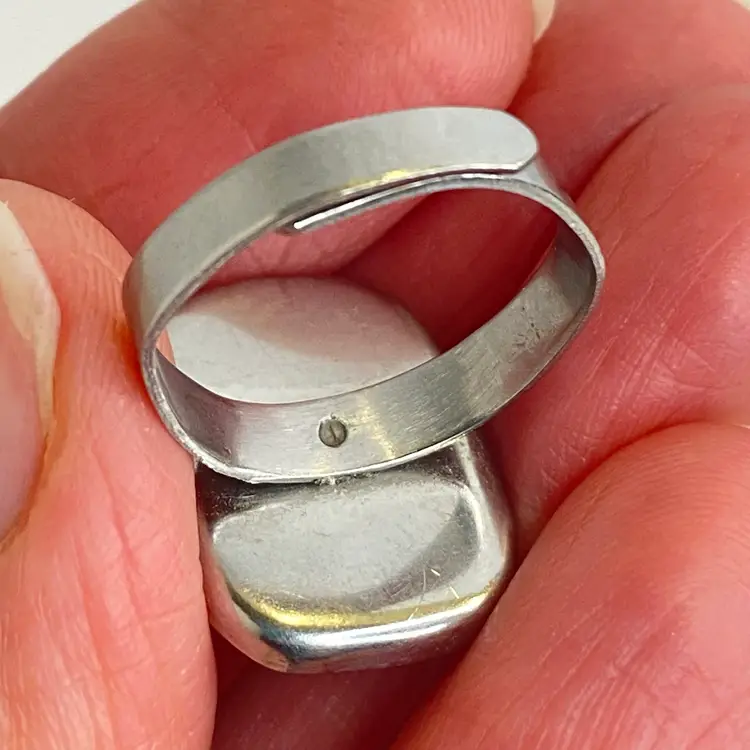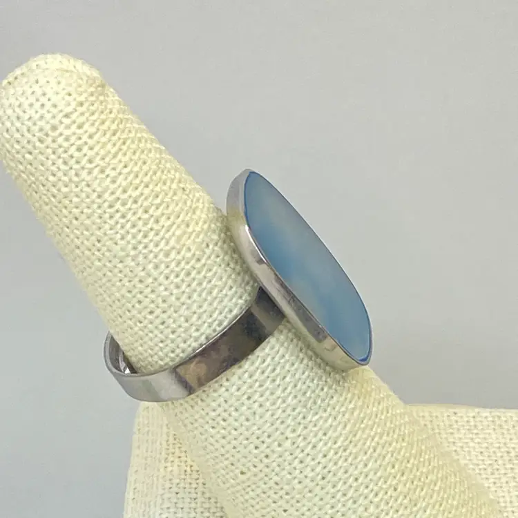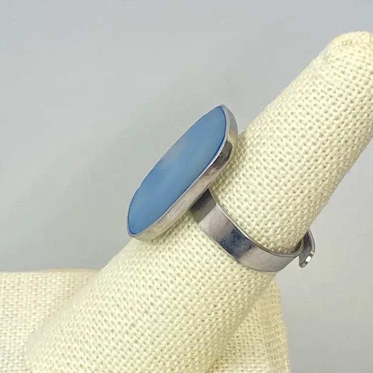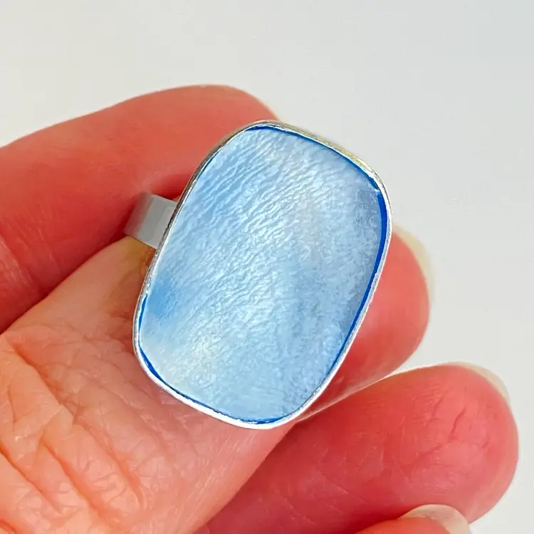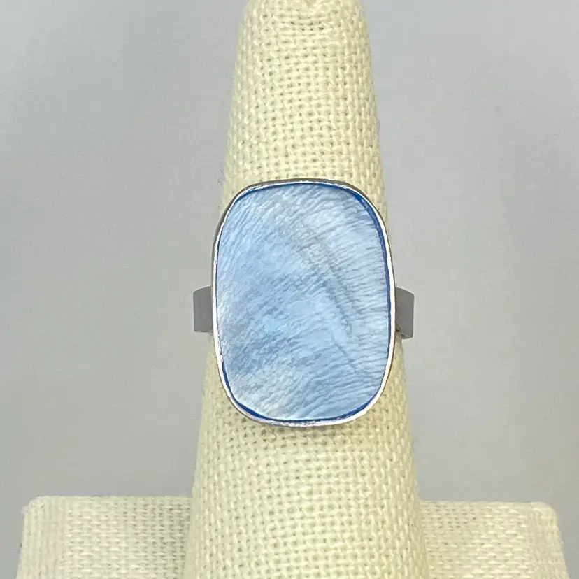 Vintage Light Blue Dyed Mother of Pearl Rectangle Silver Tone Adjustable Ring. Good vintage condition. Please see pictures for details. SMOKE FREE/PET FREE HOME This is a vintage silver tone ring featuring a rectangular light blue dyed Mother of Pearl centerpiece. The ring is adjustable and has a bezel setting style. It exudes a retro and bohemian vibe, perfect for those who appreciate beauty inspired by nature and the sea. It is a unique piece of jewelry that evokes a sense of vacation and beach vibes.