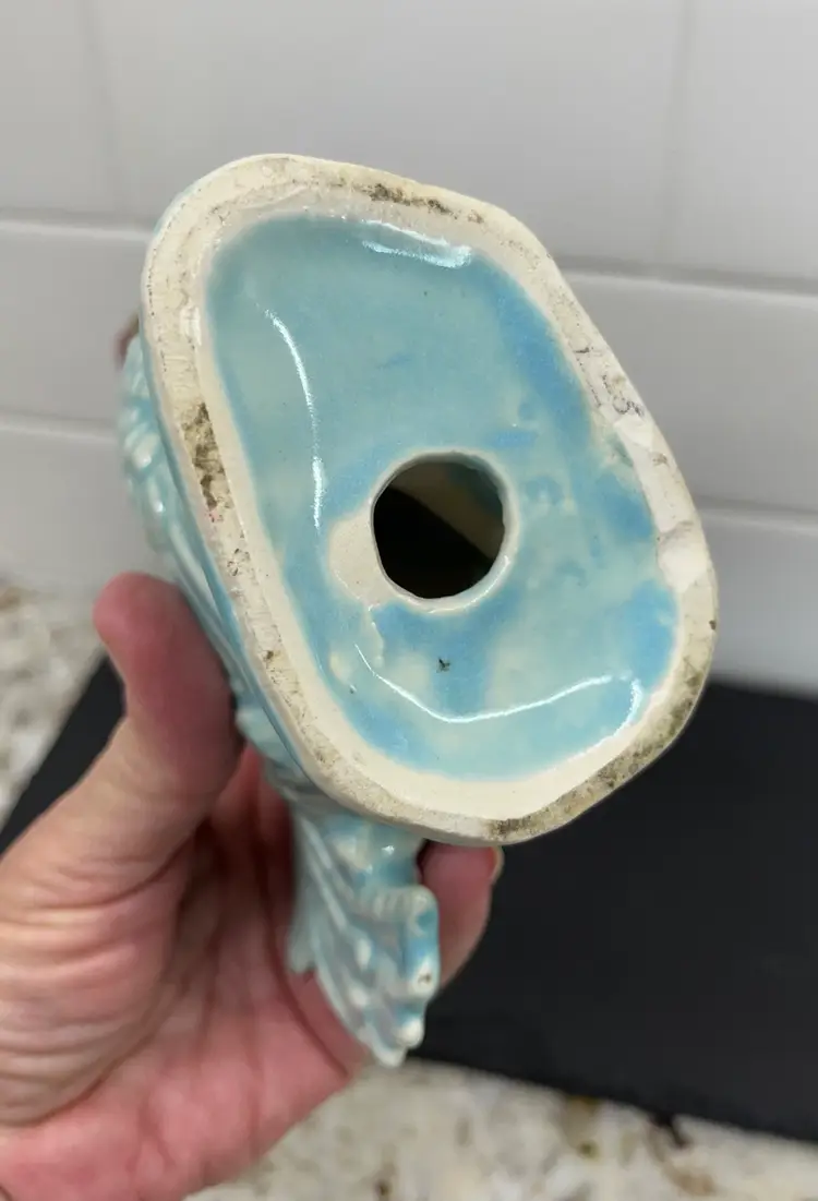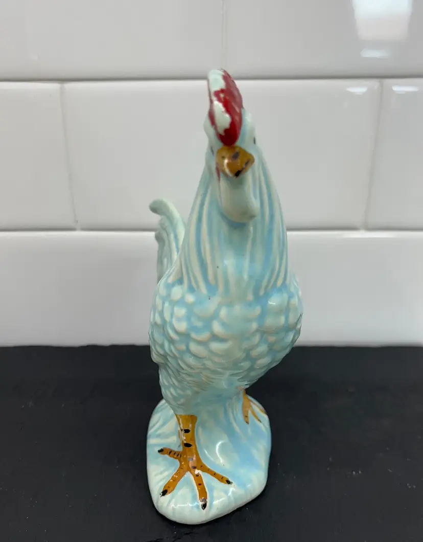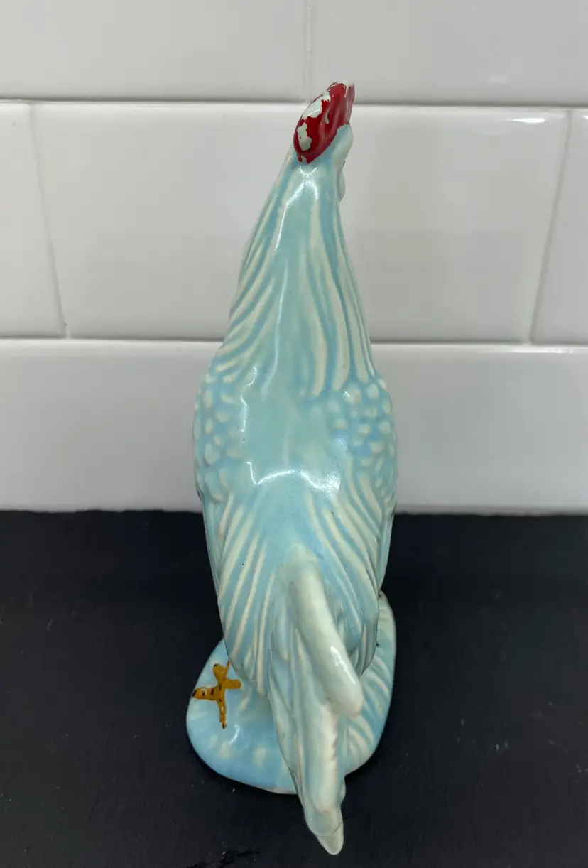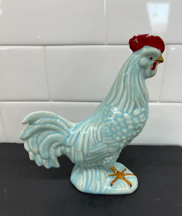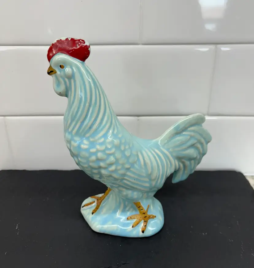 Vintage blue rooster, some paint missing on comb & foot. 6.5” tall. Only one chip on bottom. Looks like a marking on bottom, n it can’t make it out. Possibly 531. So cute!!