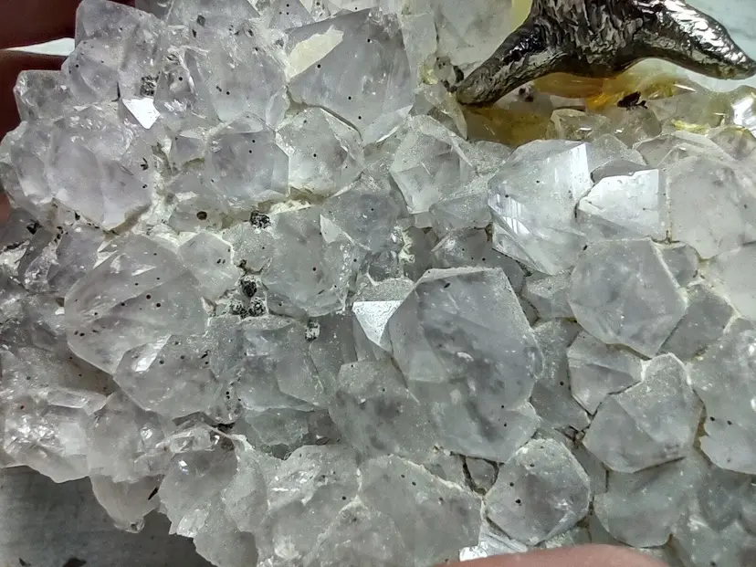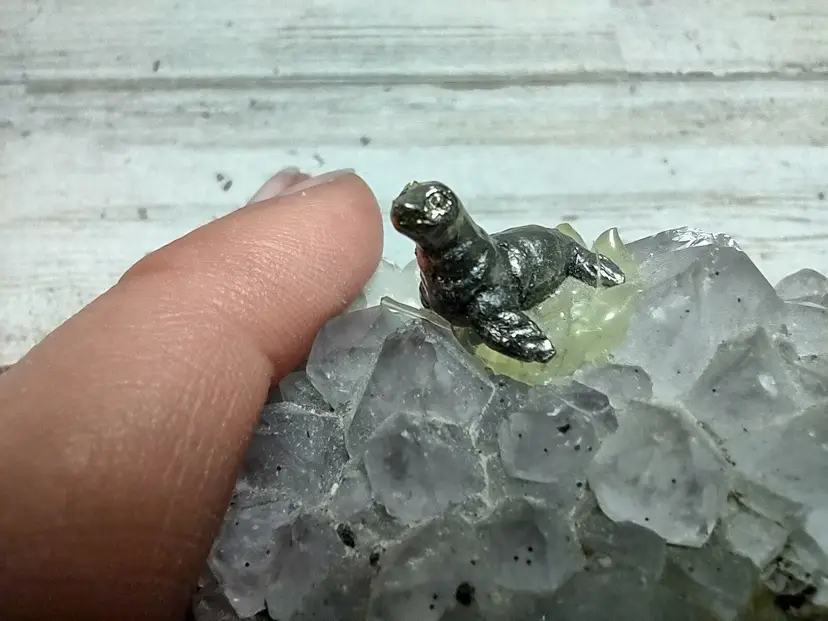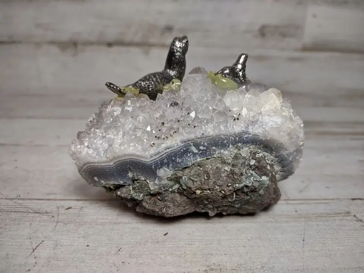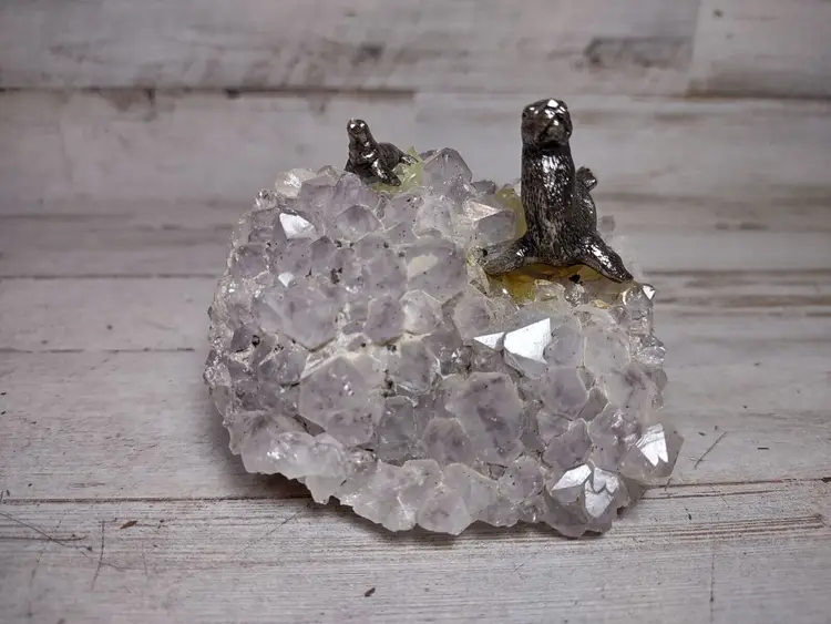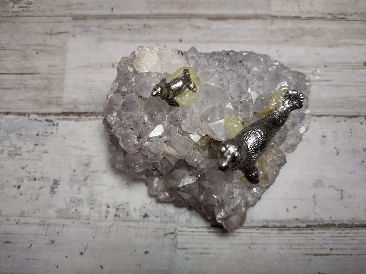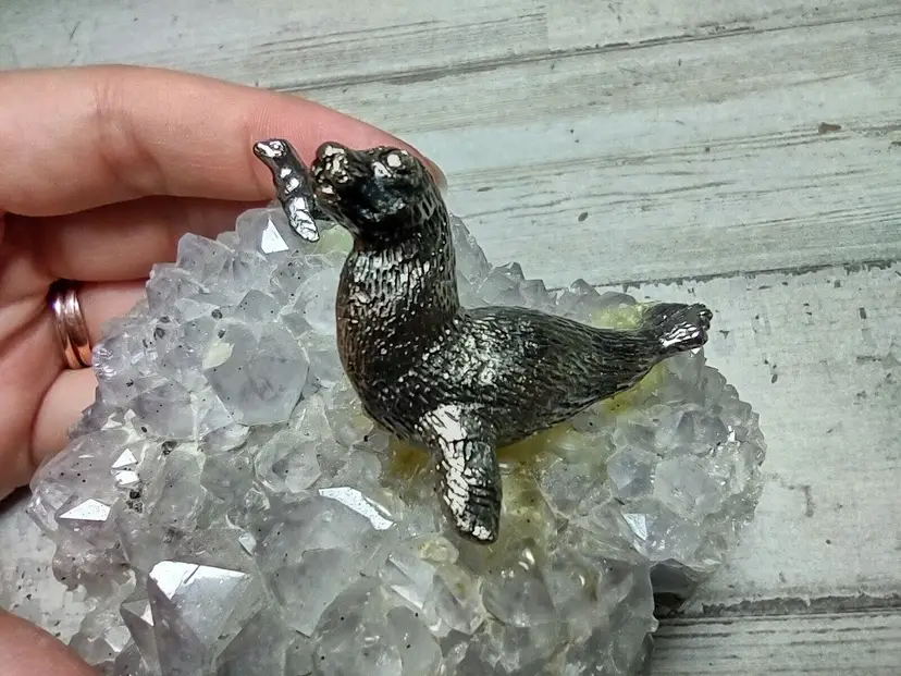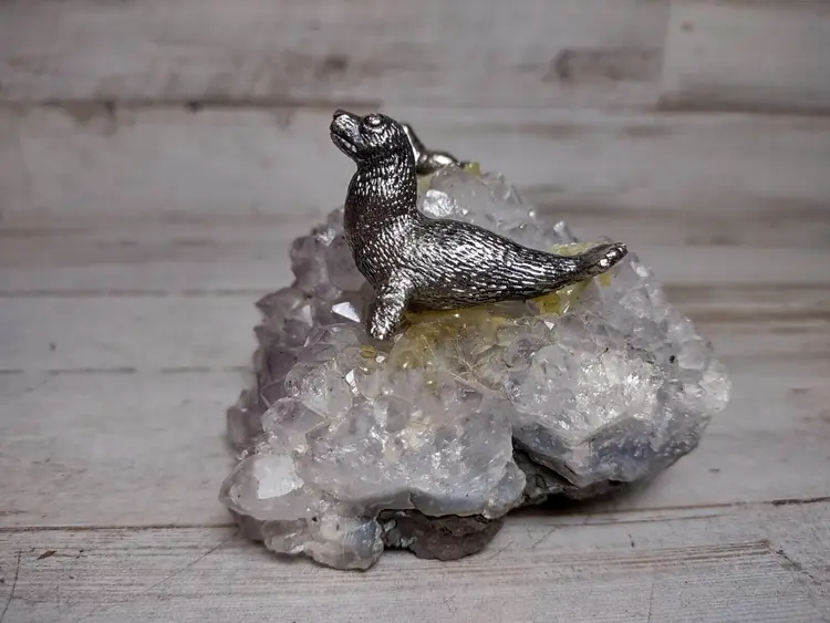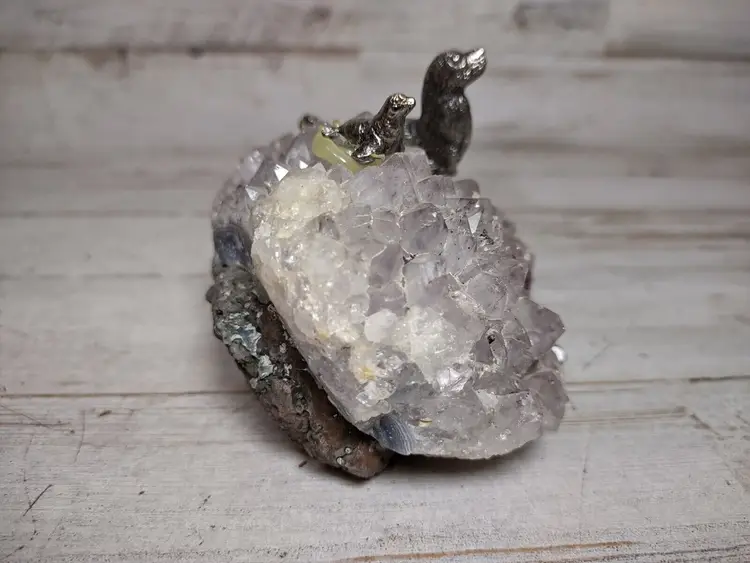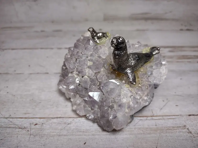 Used vintage condition with some wear. Seals have visible glue drips and marks. Mineral appears to be colored lightly purple. Piece measures approximately 3.5" long by 3" wide by 2.5" tall (including height of the seals). See photos for more detail.
