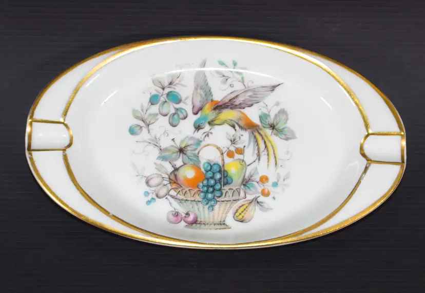 Vintage Limoges Bird of Paradise w/ Fruit Porcelain Ashtray Trinket Dish 6". In good condition. 3-3/8" wide x 6" long x 1/2" tall.