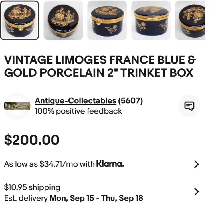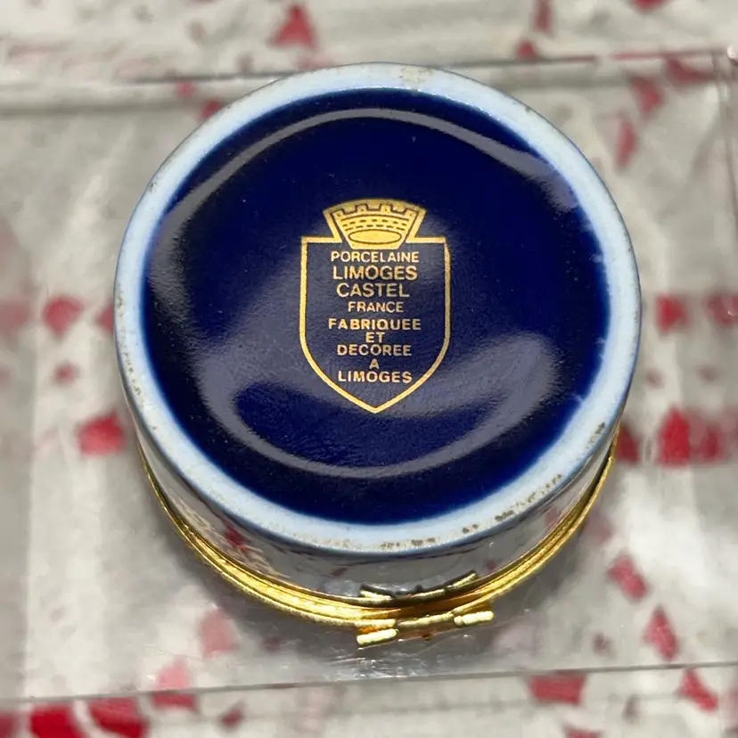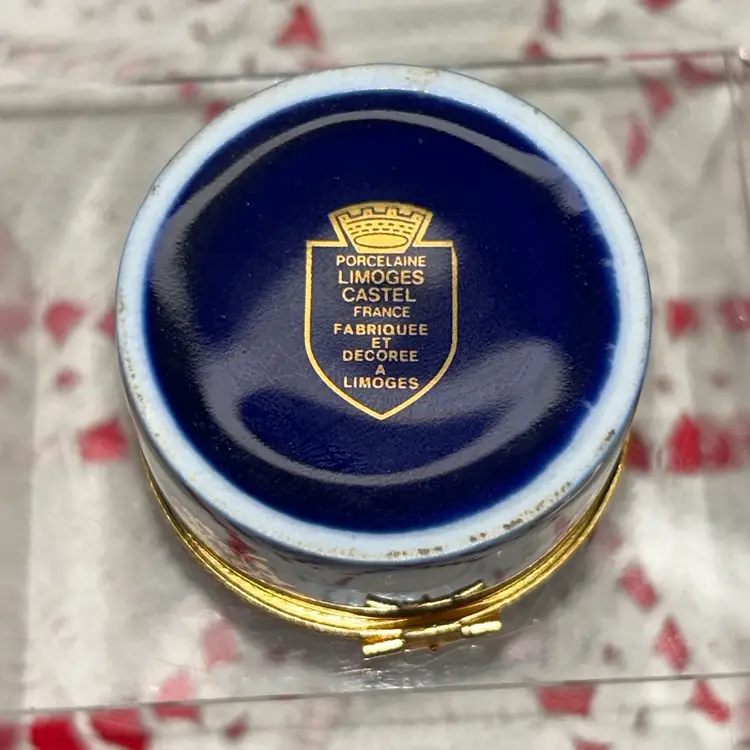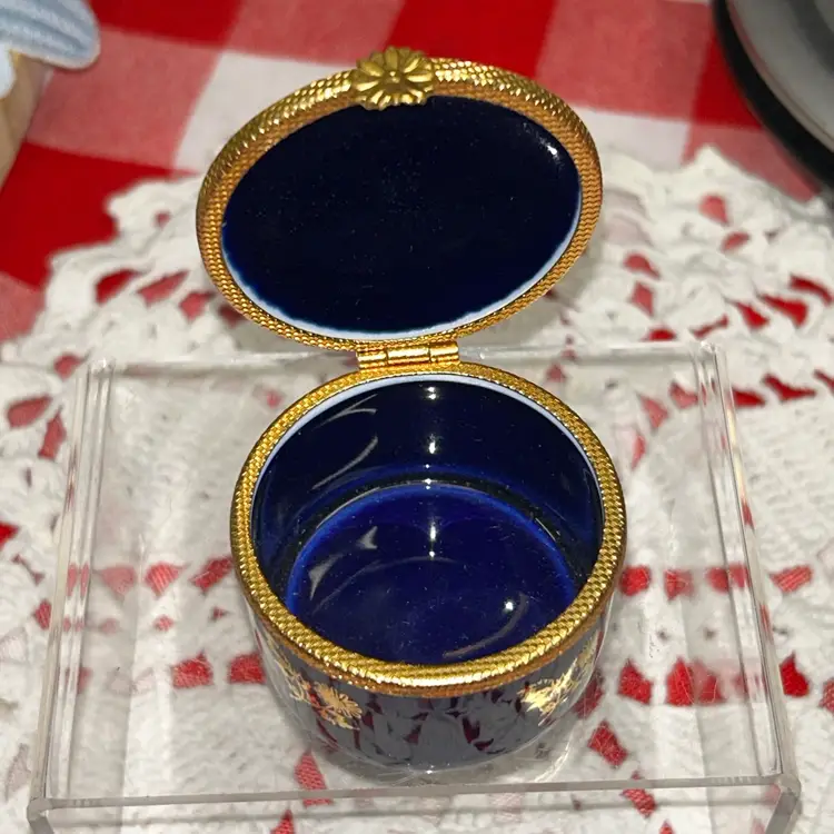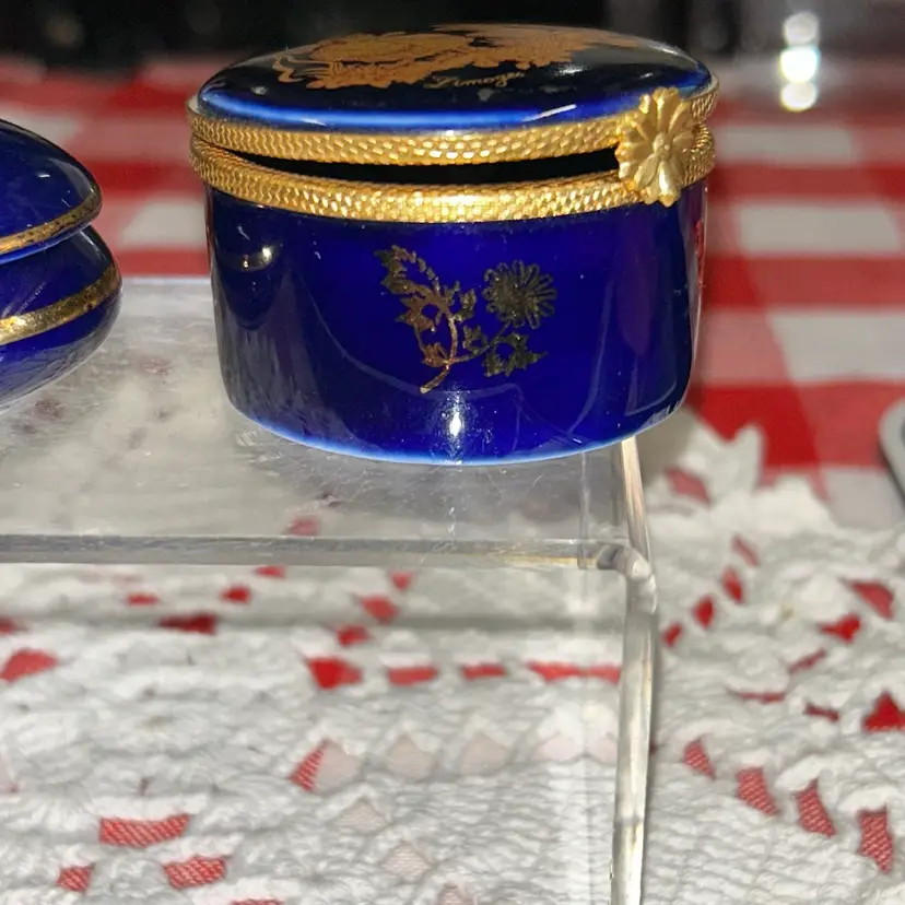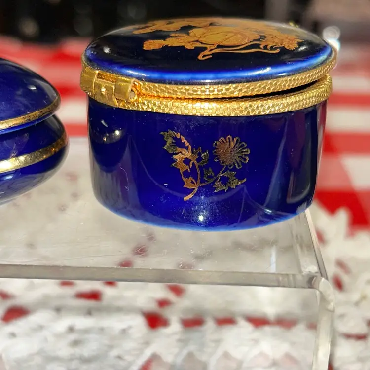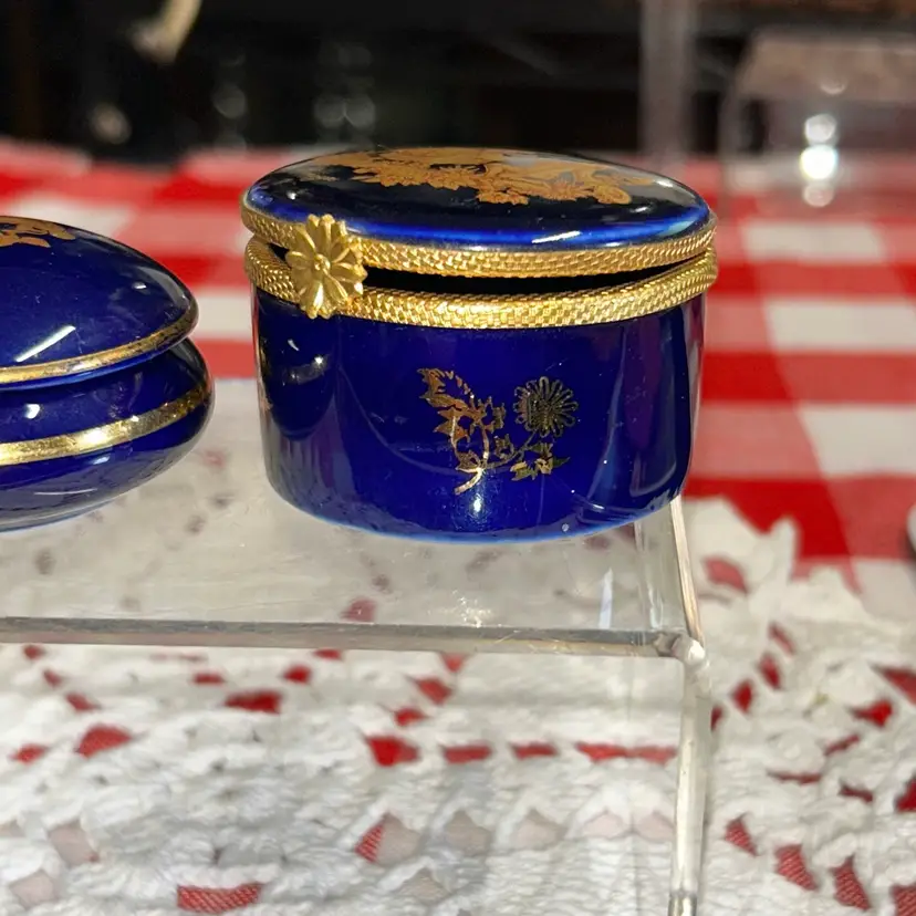 22K gold and cobalt blue trinket box Limoges trinket box. French porcelain hinged lid box with gilt decoration 2 1/8” diameter, 1 1/8” tall, and 1.75” diameter opening. Excellent condition. No chips, cracks, or scratches.