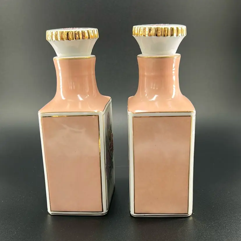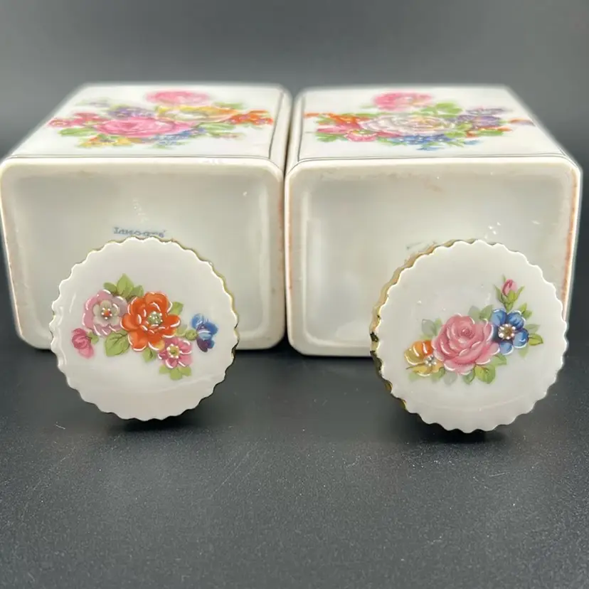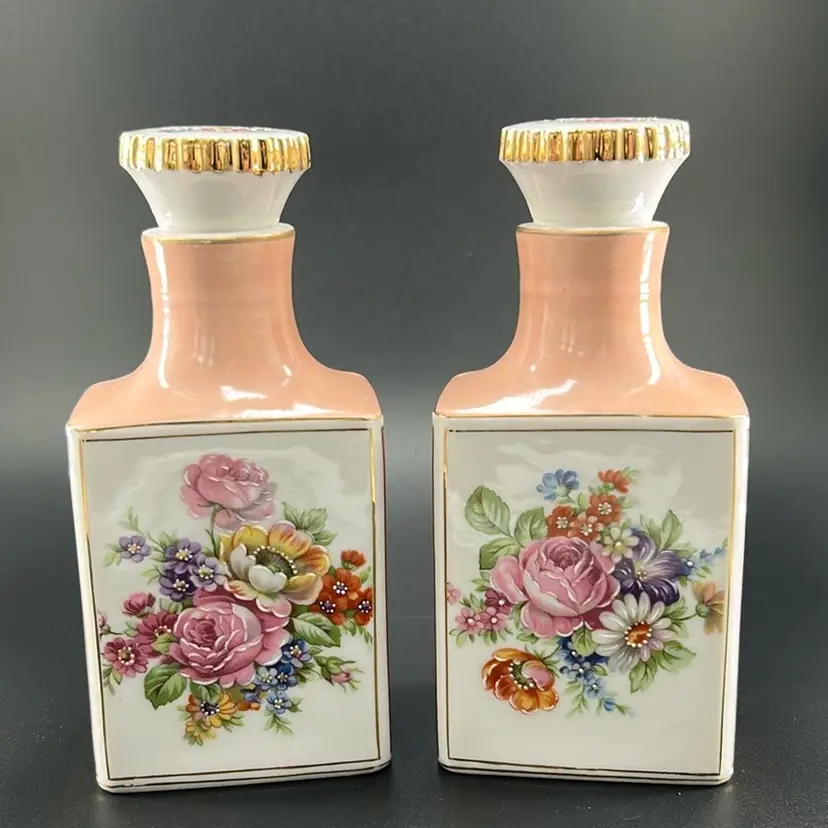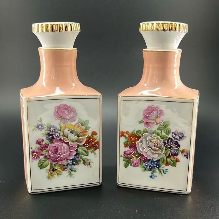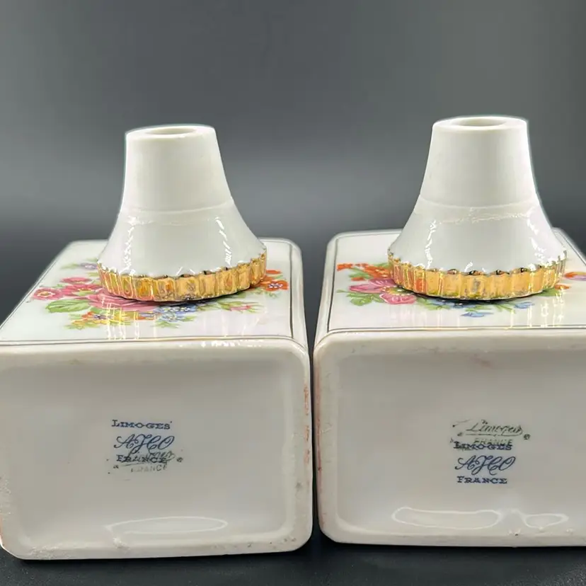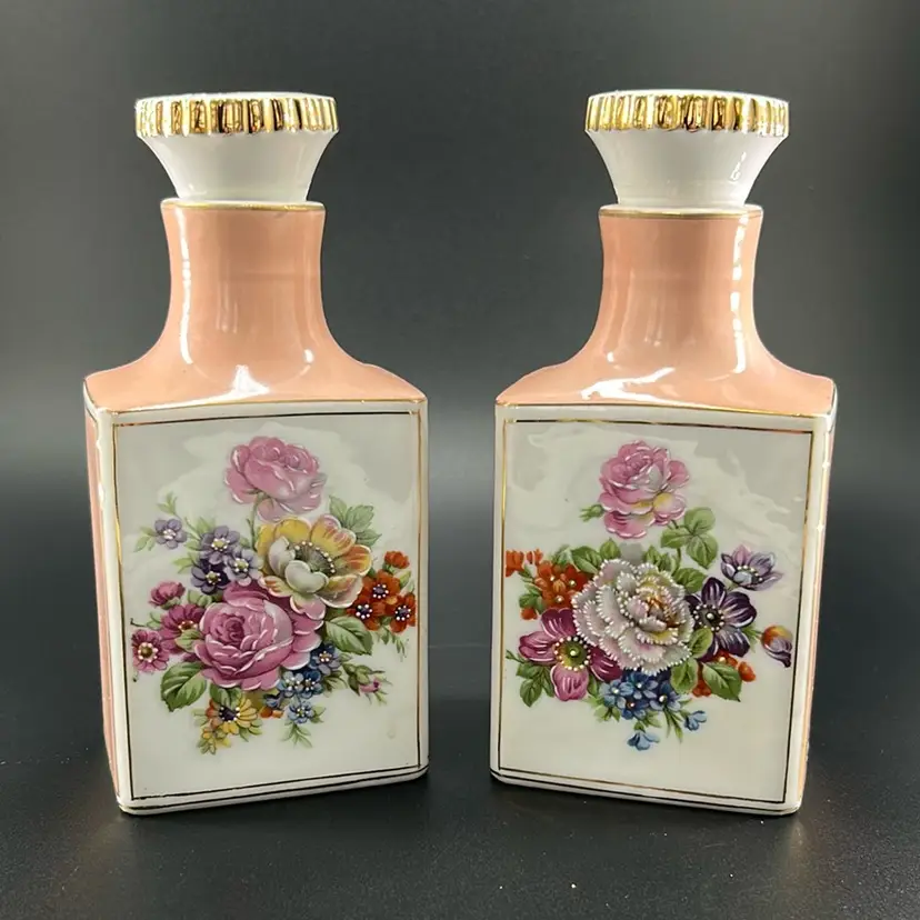 This is a set of vintage French porcelain bottles by Limoge. They feature vibrant flower, motif, and intricate gold detailing. These are in perfect condition. There are no chips or cracks each one stands 5 inches tall and 3 inches wide.