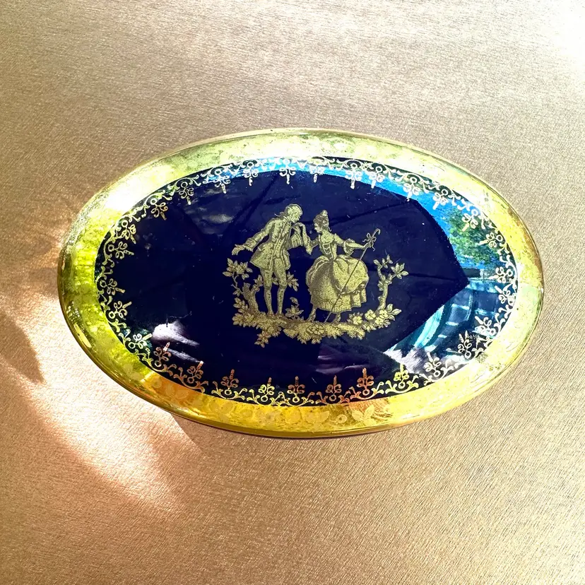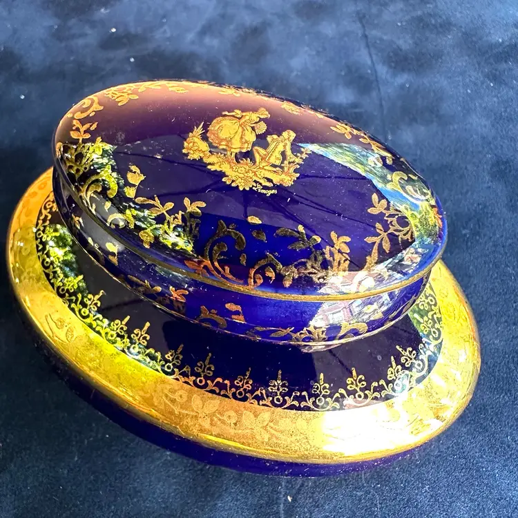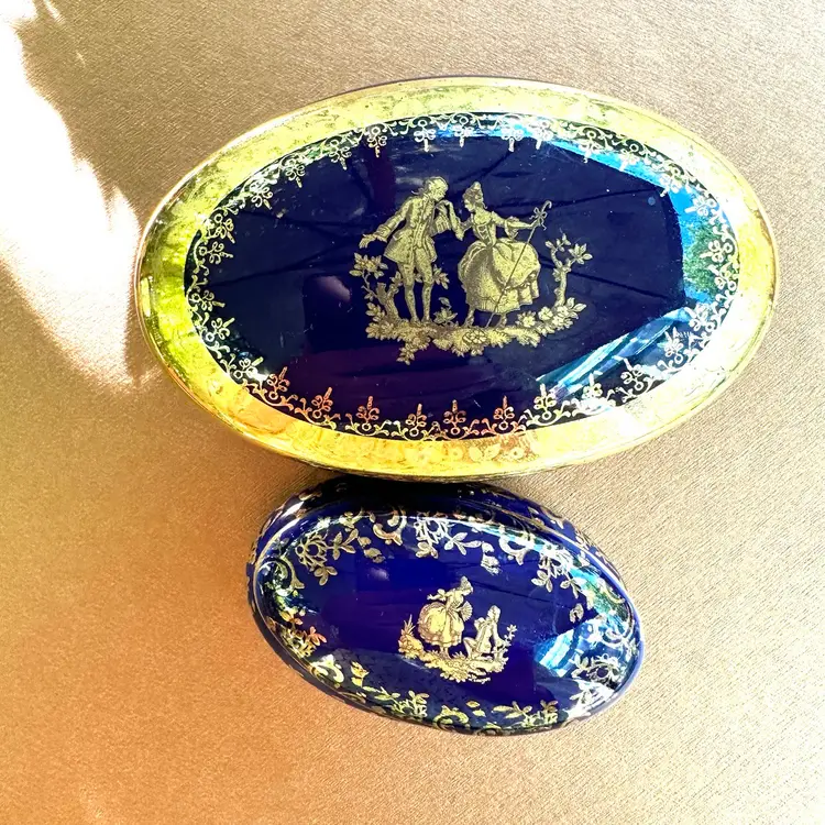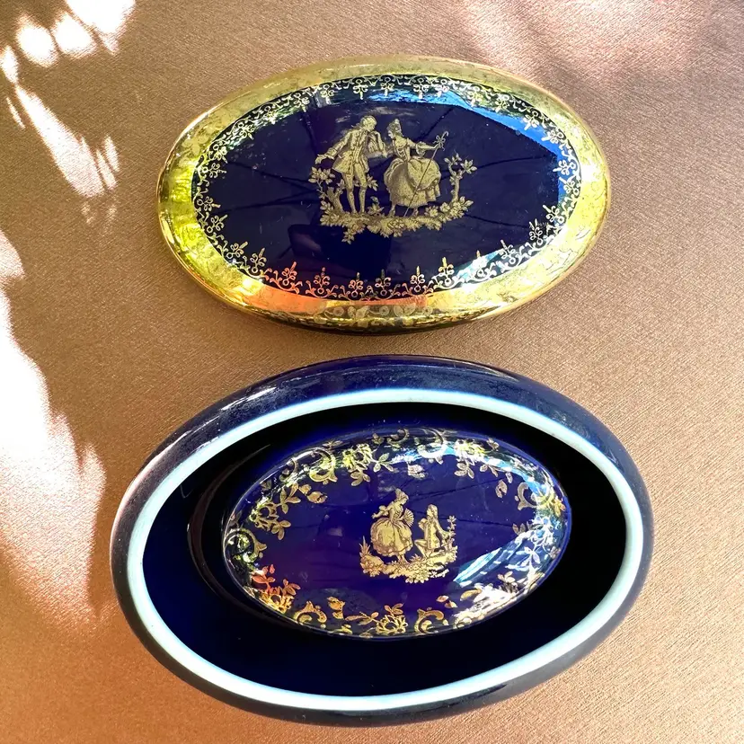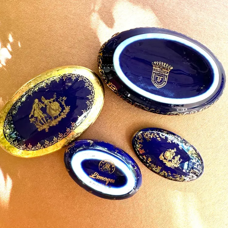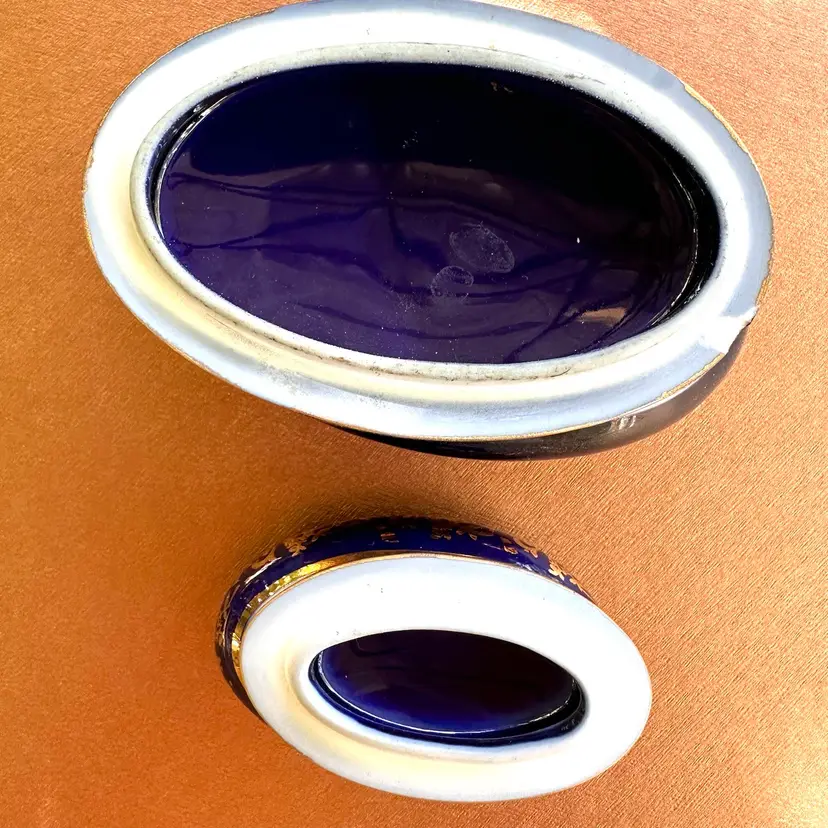 Limoges nesting oval ceramic trinket boxes cobalt with gold accents marked Limoges Very slight chip on inside rim of larger box that does not show on the outside and smaller box is fine♦️ Note Price is firm and includes both boxes♦️