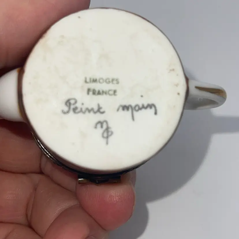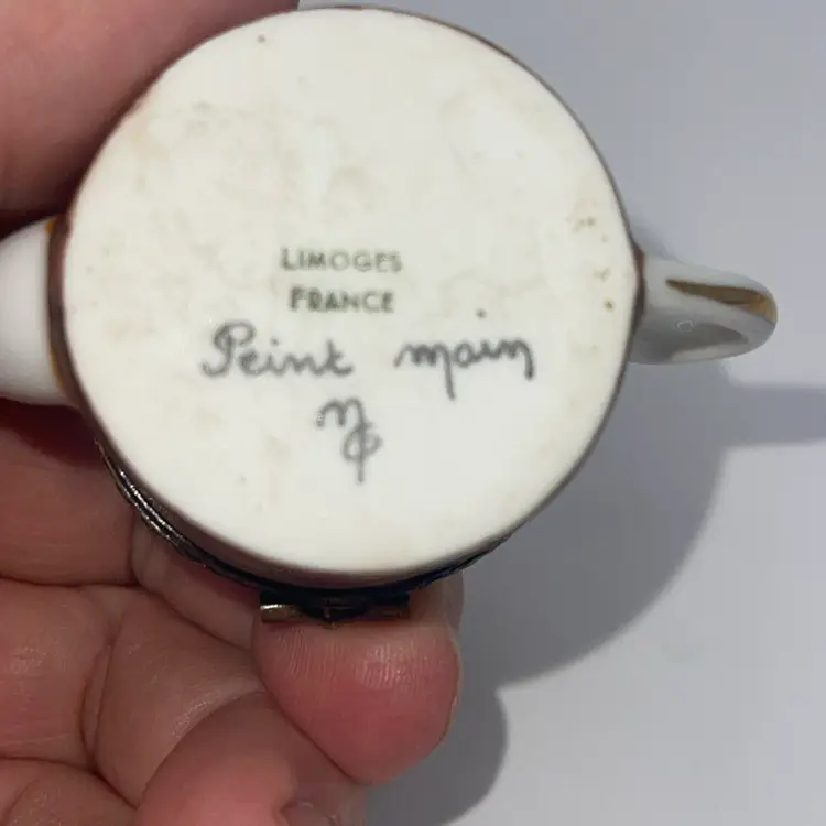 This is one of two very similar LIMOGEST box trinket boxes that I am listing this one has brown and beige around the base. The other one has blue and purple.
