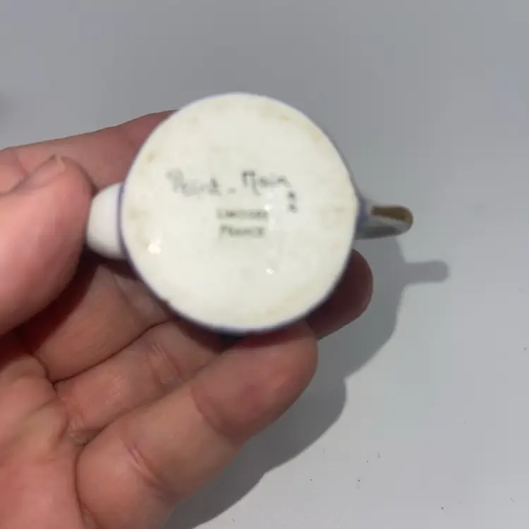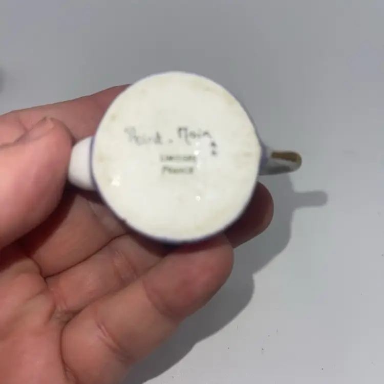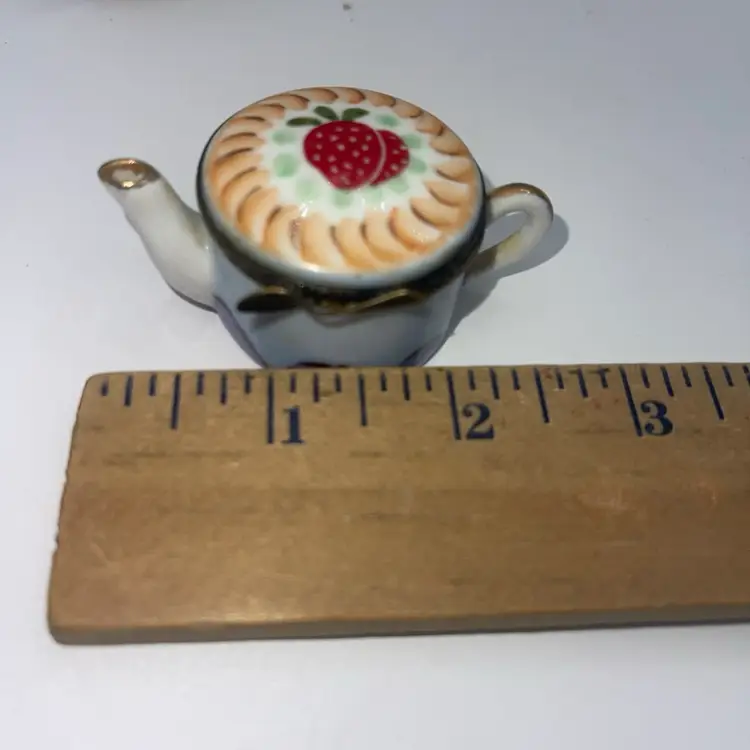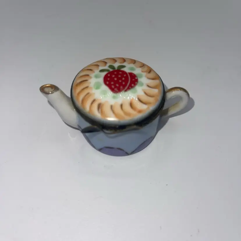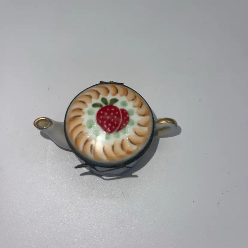 There are no chips or cracks. This has strawberries on the top and then around the base the teapot is blue and a light purple. This is one of two different LIMOGES teapot trinket boxes that I’m listing thank you for looking