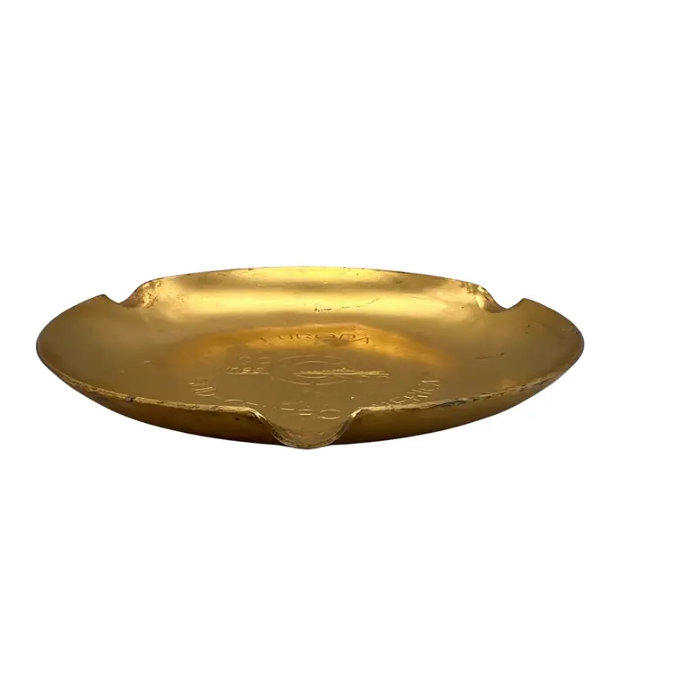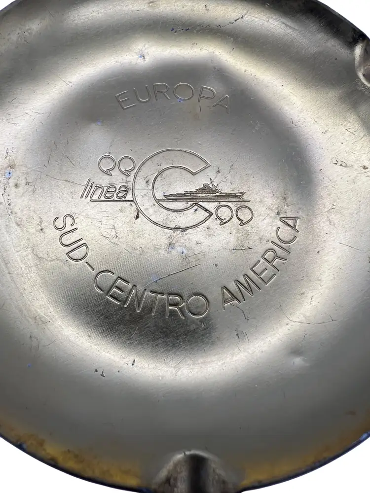 Original vintage metal ashtray from Linea C, a cruise line that served routes between Europe and Central/South America. Embossed with the Linea C logo, a cruise ship image, and the words “Europa” and “Sud-Centro America.” Measures approximately 4.5 inches across. Has a gently concave form with three cigarette rests. A scarce piece of maritime advertising and cruise memorabilia.