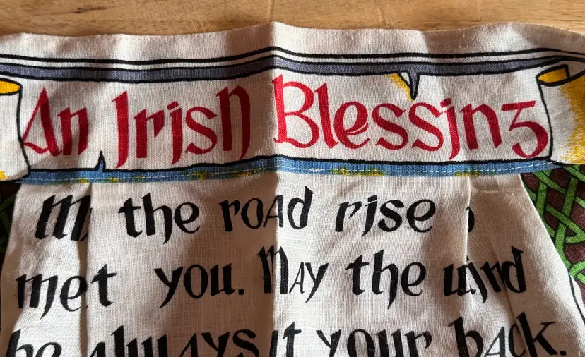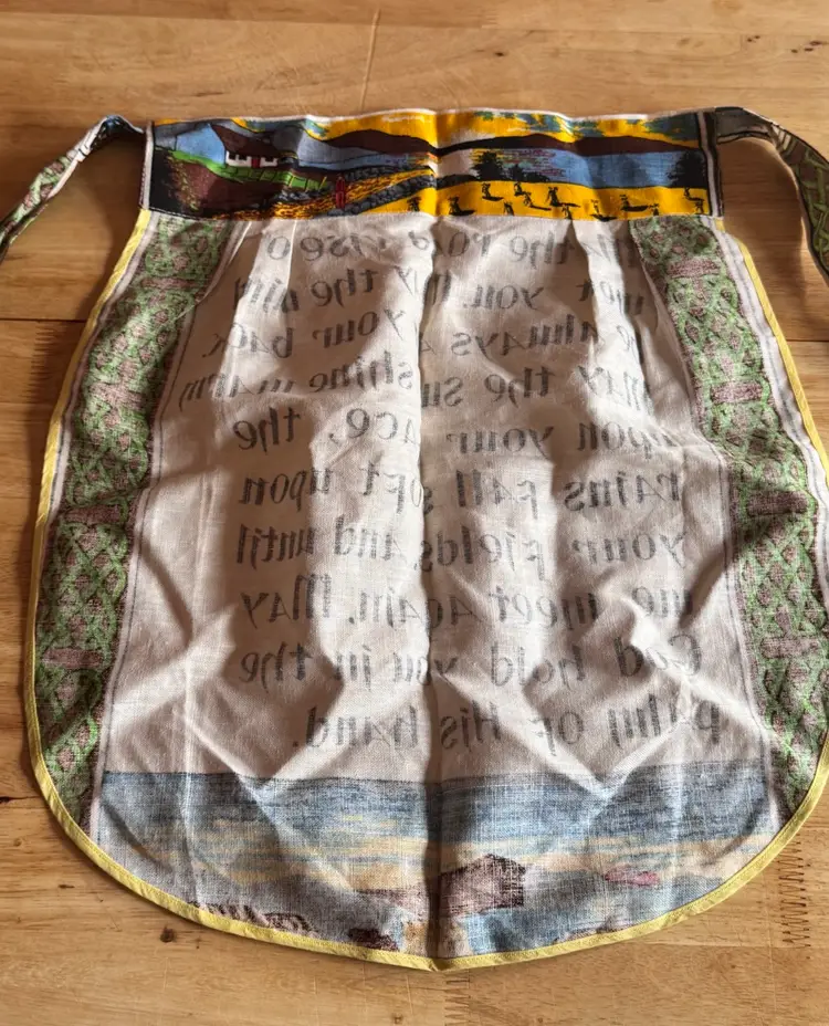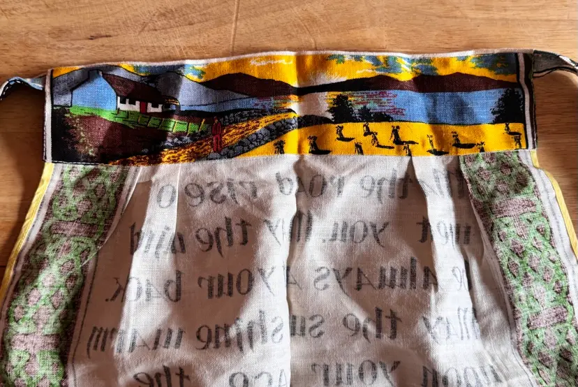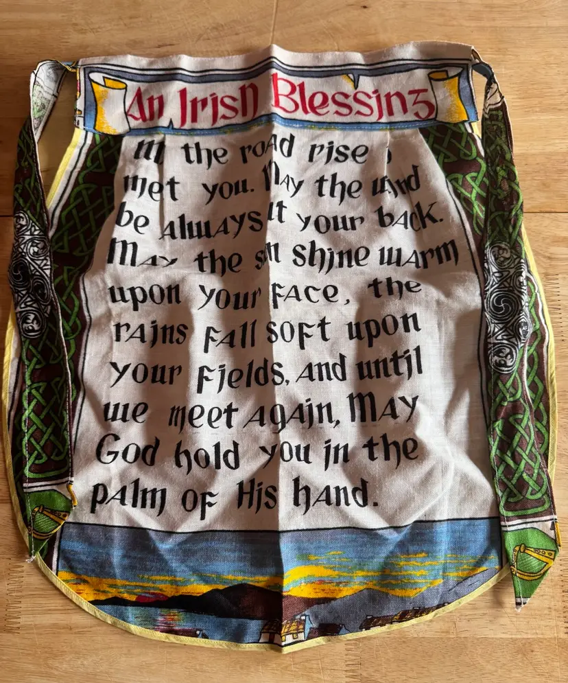 A vintage apron with an Irish Blessing in like new condition. Very clean and vivid colors. Measures approximately 21in wide, 19in long and 52in across with the ties. A very sweet apron