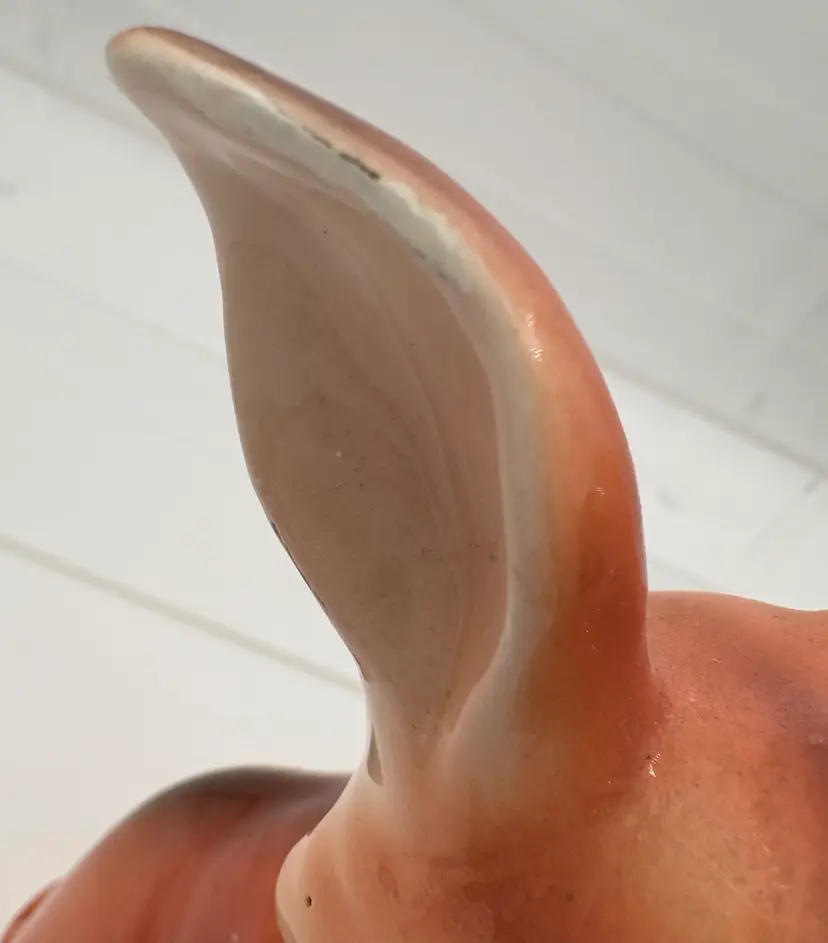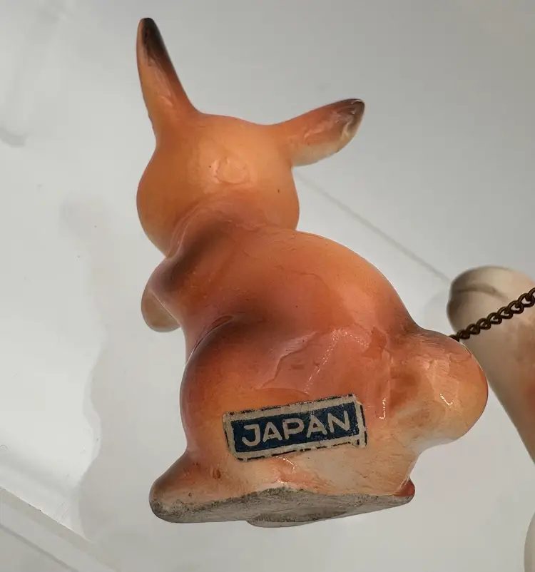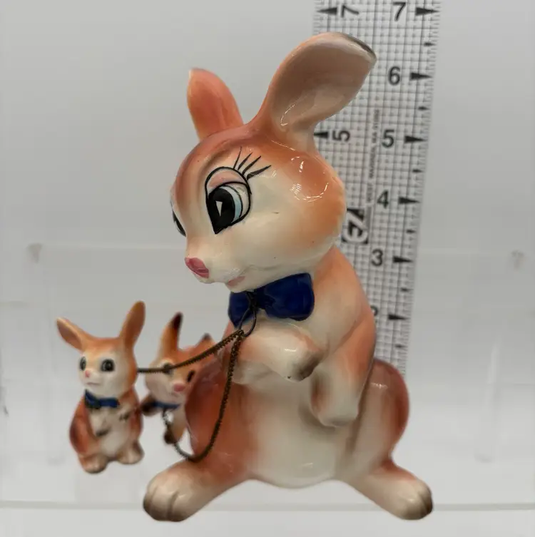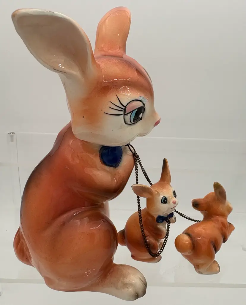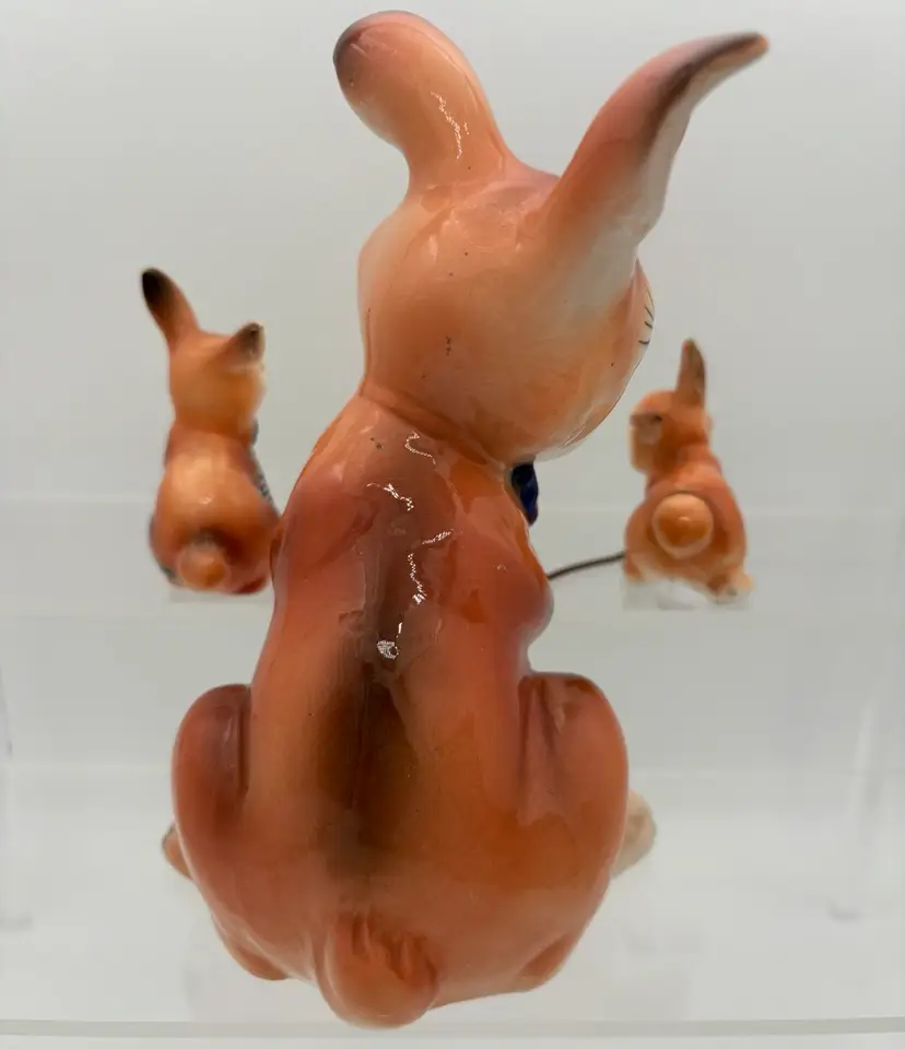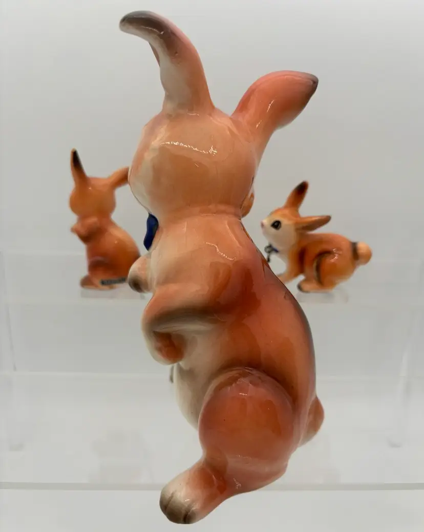 Large rabbit is 6 1/4”H, bunnies are 2”H and 2 1/2”H. No cracks in the pieces, but there are a few defects. The bottom of one of the large rabbit’s feet has a shallow chip, not evident when upright. There is also a glaze scrape by one of this rabbit’s eyes. All of the rabbits appear to have had touch ups on the tips of their ears. Please review images. Getting hard to find with the bunnies intact. Lipper & Mann label on bottom of large rabbit’s feet and a Japan label on one bunny.