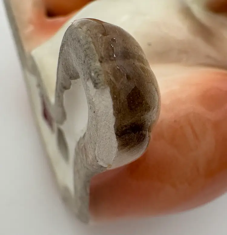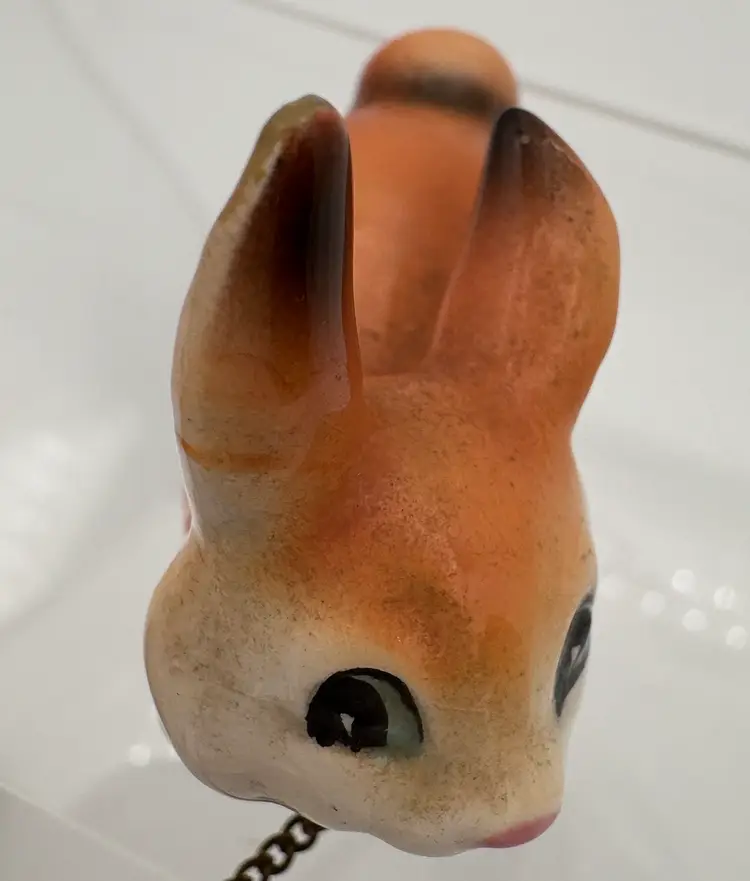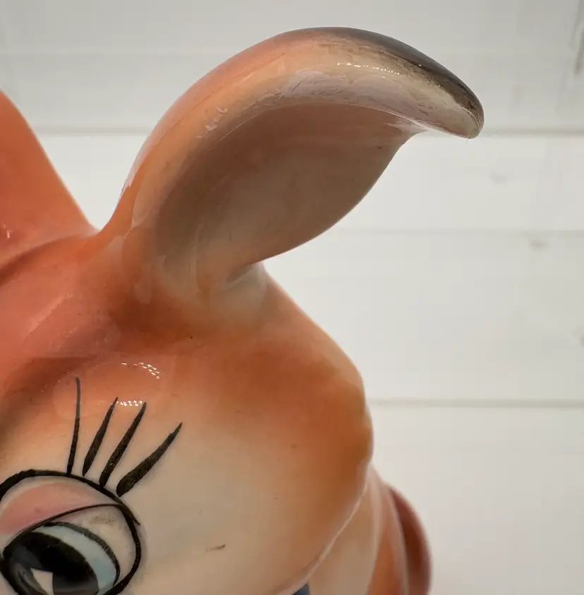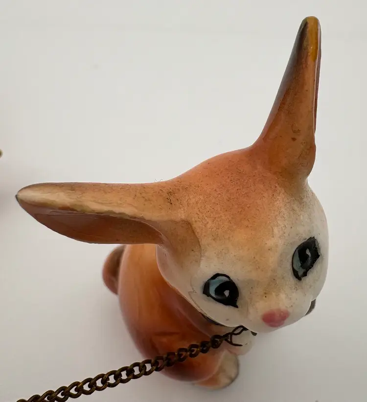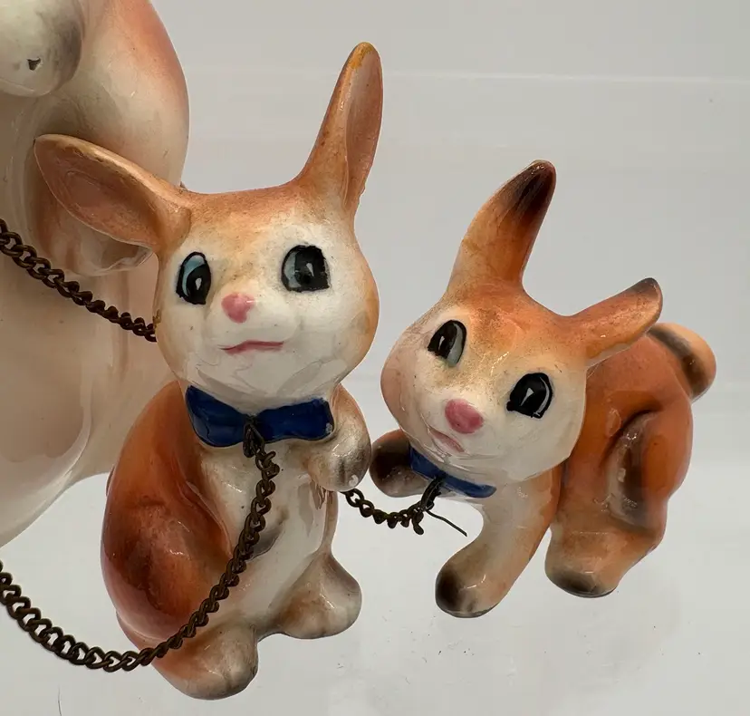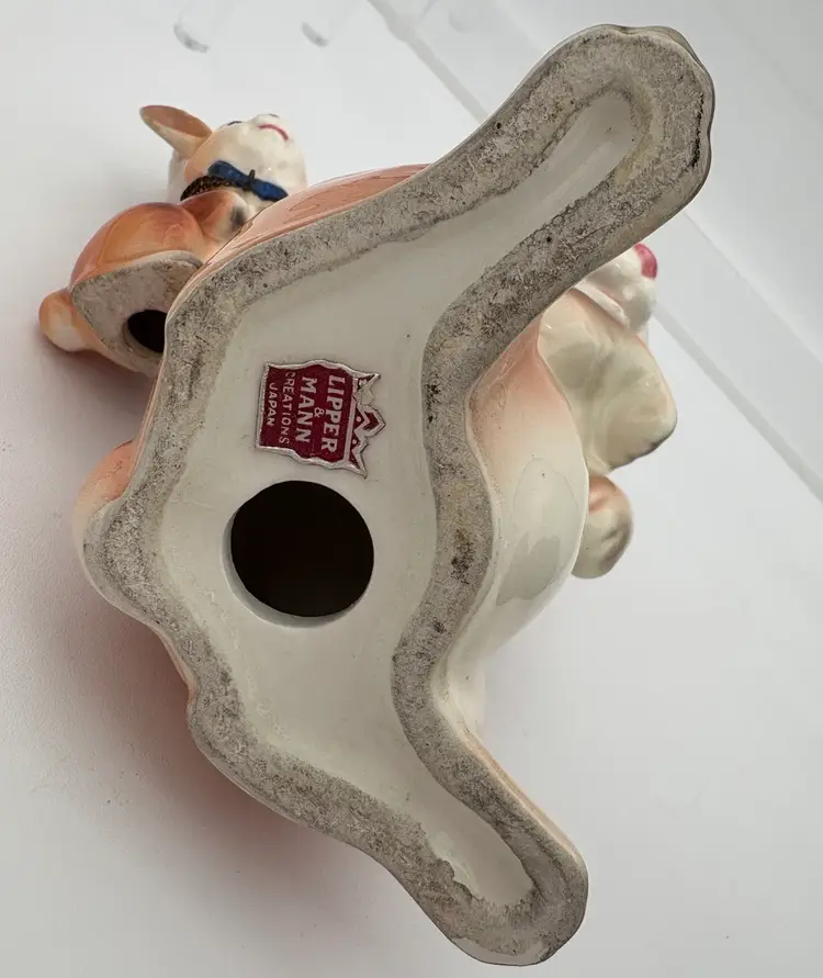 Large rabbit is 6 1/4”H, bunnies are 2”H and 2 1/2”H. No cracks in the pieces, but there are a few defects. The bottom of one of the large rabbit’s feet has a shallow chip, not evident when upright. There is also a glaze scrape by one of this rabbit’s eyes. All of the rabbits appear to have had touch ups on the tips of their ears. Please review images. Getting hard to find with the bunnies intact. Lipper & Mann label on bottom of large rabbit’s feet and a Japan label on one bunny.