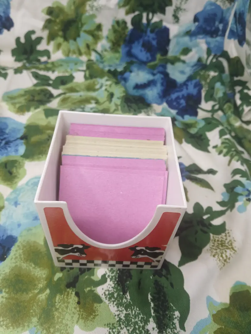 Awesome condition. It contains approx half the original memo pad individuals. Measures approx 3.5x3.5".