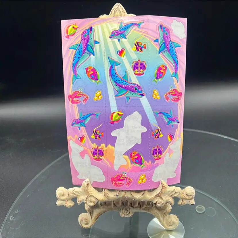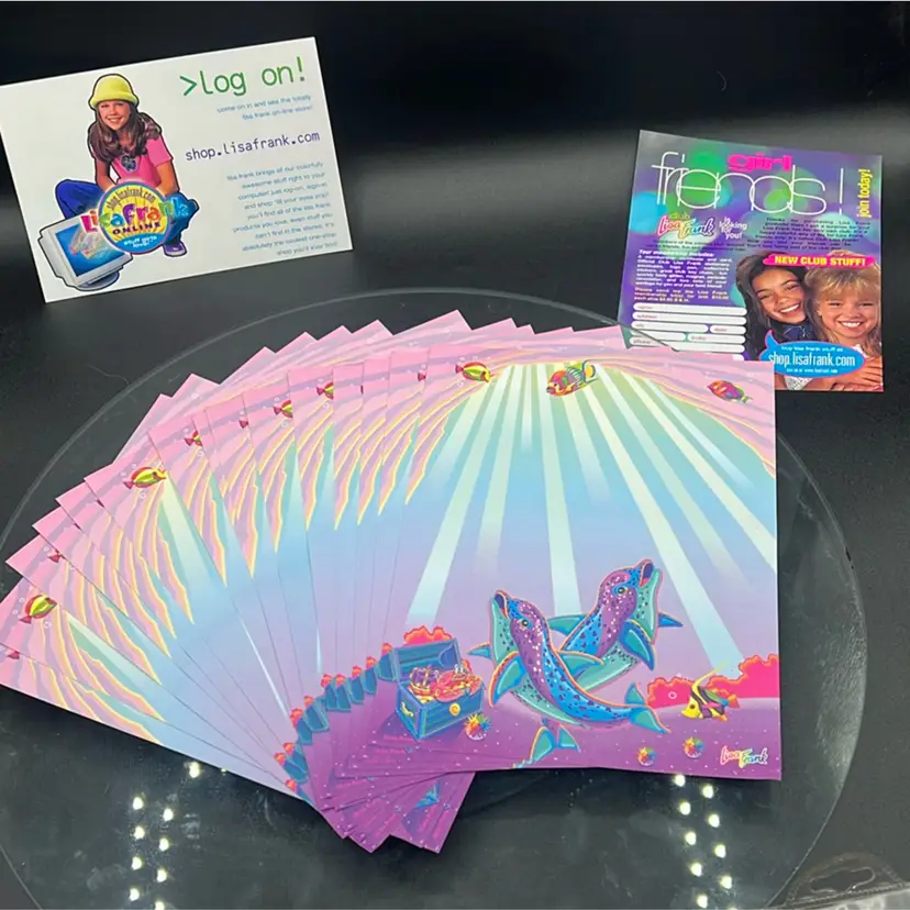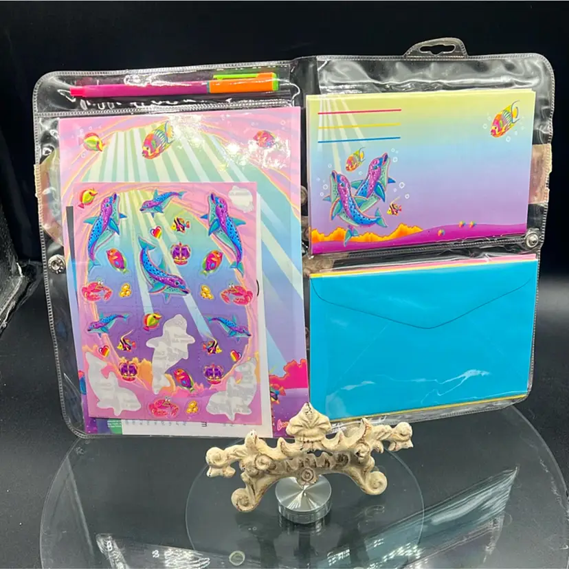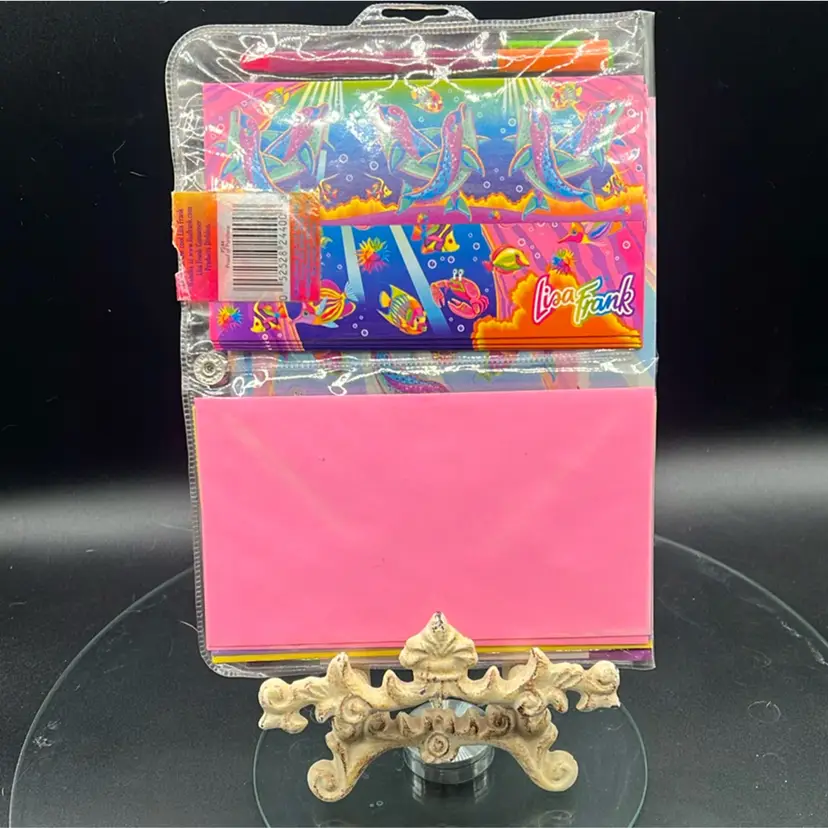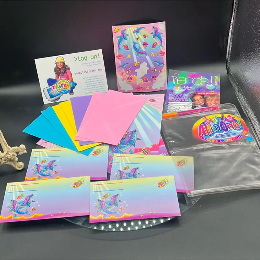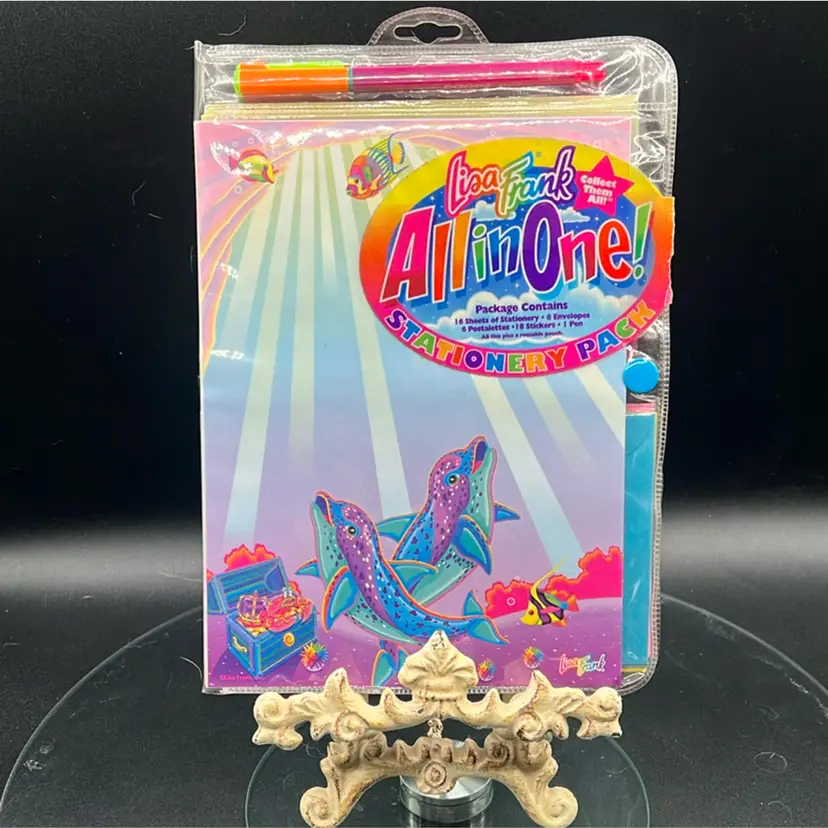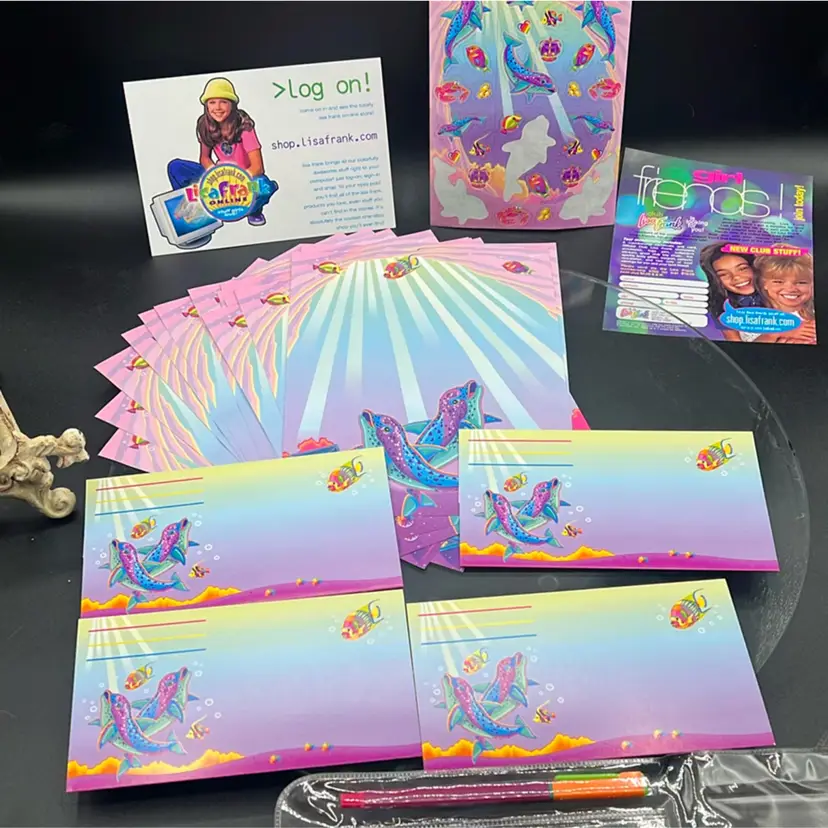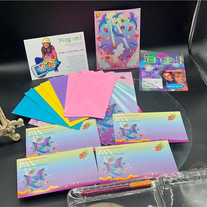 This is a set of Lisa Frank stationery, featuring the Spotted Dolphins Suni & Echo. This set is missing various pieces from when it was brand new. Included is what is shown in the photos -- fifeteen pages of paper, four postalettes, two blue, two pink, two yellow and one purple envelopes and one sheet of stickers, plus the pen.The pieces that are remaining are in great shape! . I haven’t found a heartbeat on the pen so until you give it some love it’s not in working order. Starting bid only $1.00!!!! Please feel free to ask any questions Thank you for your time and interest Blessings, Bonnie & Darren :-)