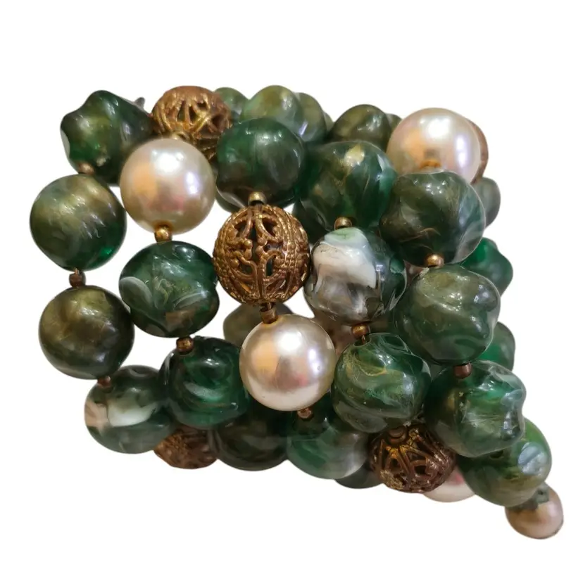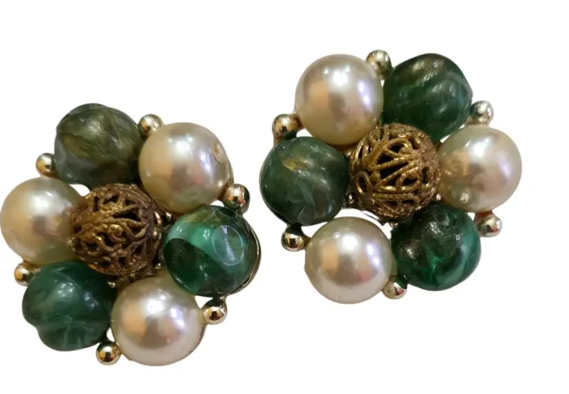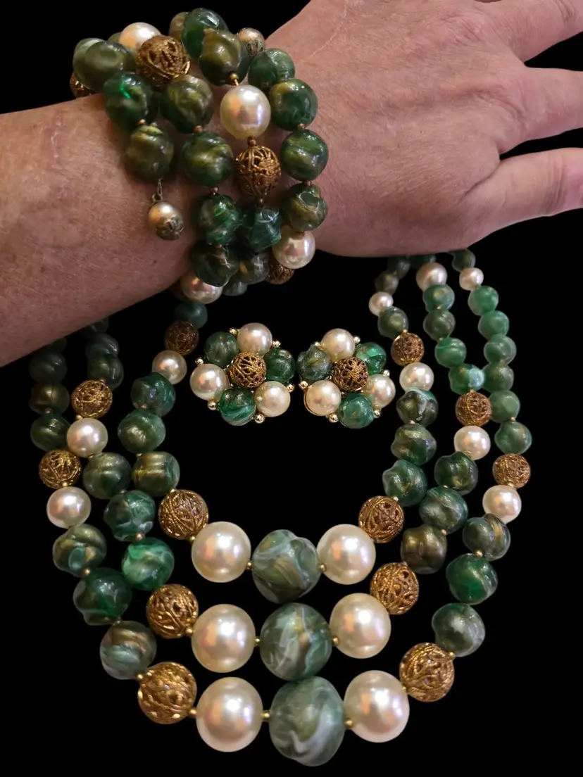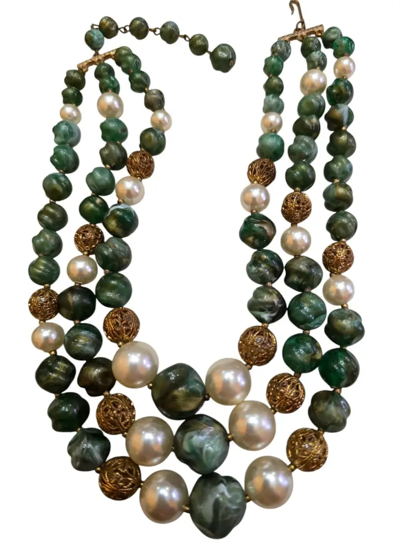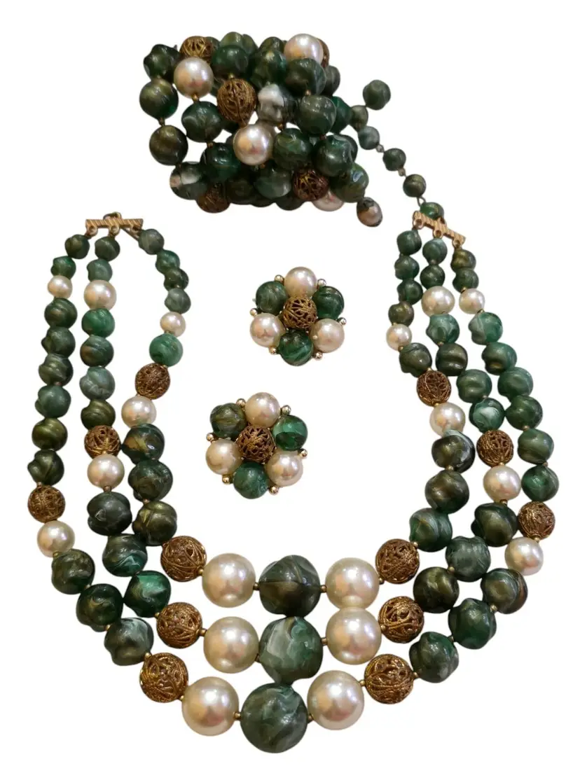 Condition: Very good vintage Signed: Lisner. Only the earrings are signed. Details: In nice condition. All resin except for the filigree brass beads, which have a nice patina
