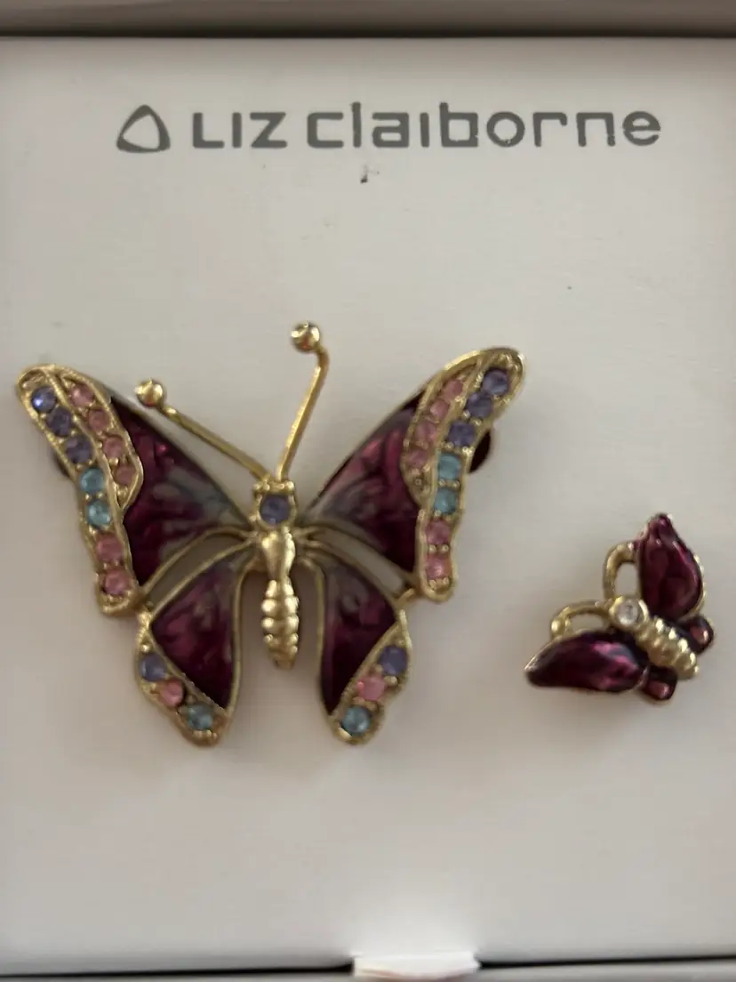 Vintage enamel Liz Claiborne brooch and pin set. Brooch is approximately 1”x 1 1/2” and pin is approximately 1/2”.