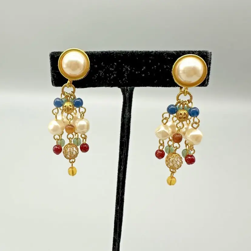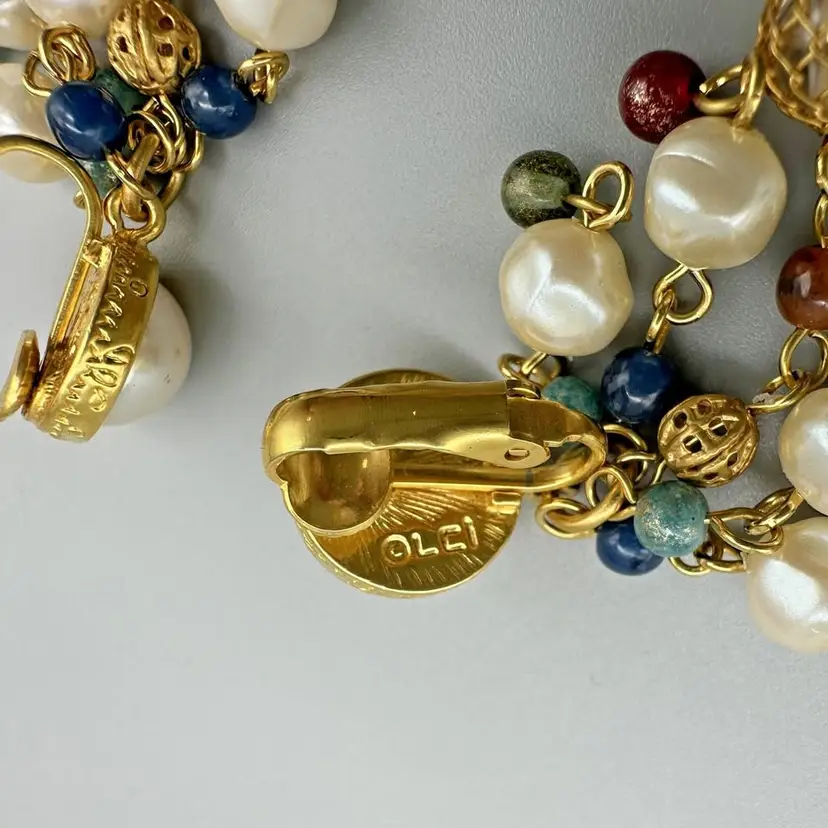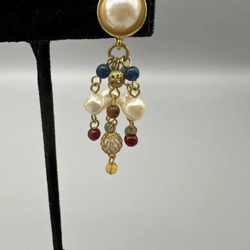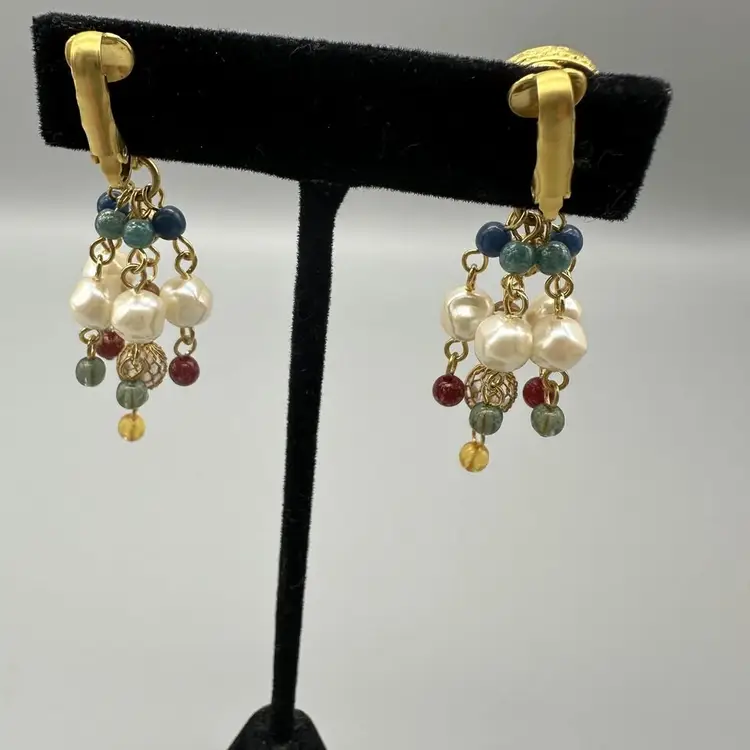 Vintage LCI (Liz Claiborne) Clip On Earrings Dangle Faux Pearl Multi Color Bead Gold Tone Signed Condition: Very Good Condtion-Please See all Photos Gold tone clip-on earrings with large faux pearl tops and multi-strand dangles Dangling beads include faux baroque pearls, filigree gold tone balls, blue, green, red, and yellow glass bead accents Signed LCI on the clip backs Clip on style Secure and functional clasp mechanisms Vintage design with layered bead clusters, excellent for statement looks or collectors Estimated to be from the late 1980s to early 1990s No missing beads