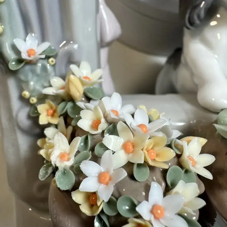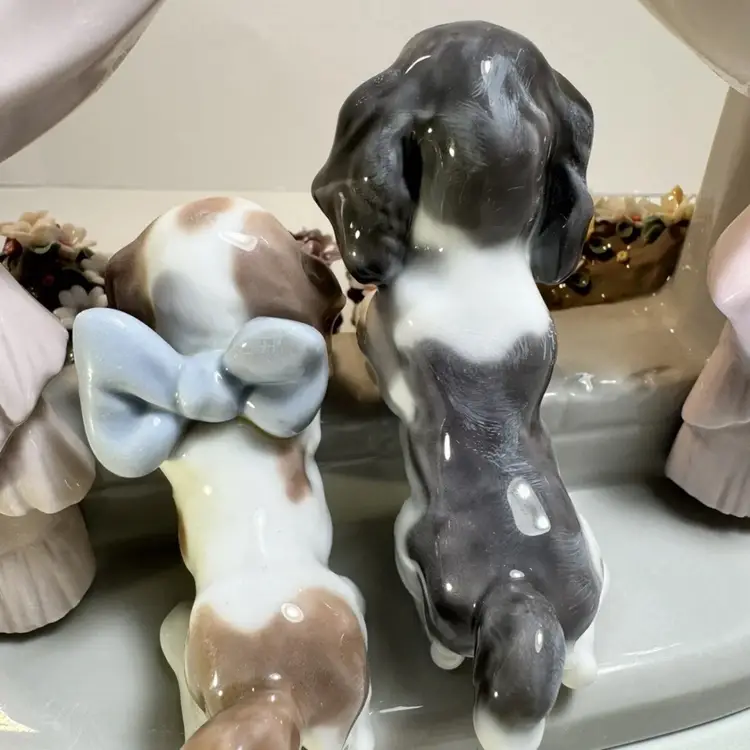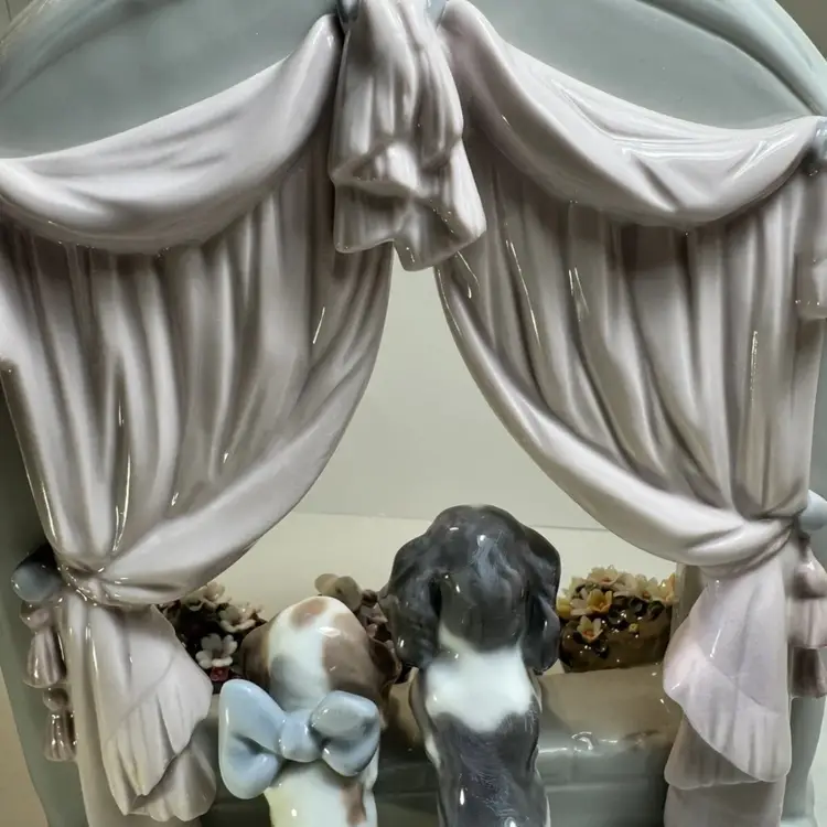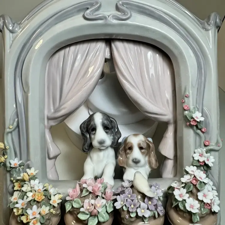This vintage Lladró figurine features two dogs waiting at the window for their parents to come home. The hand-painted porcelain piece is a limited edition and is part of the Lladró Collectors Society collection. It was manufactured in Spain in 1997 and has since been retired. Puppies, flowers and birds. The window provides the frame for a world of eternal spring, sweetness and joy in which twopuppies await us, eager to play. A glossy porcelain piece, decorated in pastel colors, ideal as a gift, collectible or decoration. The figurine stands at 9 inches tall, with a length of 7 inches and a width of 4 inches. It is multicolored with an all-over pattern and a glazed finish. The piece is perfect for any room and occasion, making it a great addition to any collection. Vintage Lladró “Please Come Home” Two Dogs Waiting At Window For Parents 6502 Nice, no cracks, few chipped petals (see pics), but very small, not noticeable, very beautiful. NO ORIGINAL BOX.