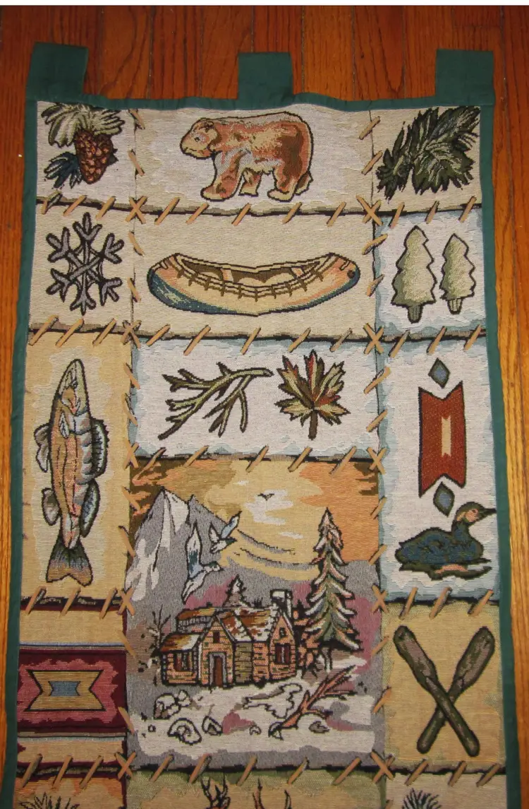 Bring lodge-inspired warmth to your space with this vintage-style embroidered tapestry wall hanging. Featuring a grid of nature motifs — including a bear, canoe, pine trees, snowflakes, and a cozy cabin scene — this piece evokes the spirit of wilderness retreats and winter getaways. Earthy tones of green, brown, and red are stitched into a soft textile base, with three sturdy loops across the top for easy rod-style hanging. Perfect for cabin decor, holiday styling, or rustic gallery walls.