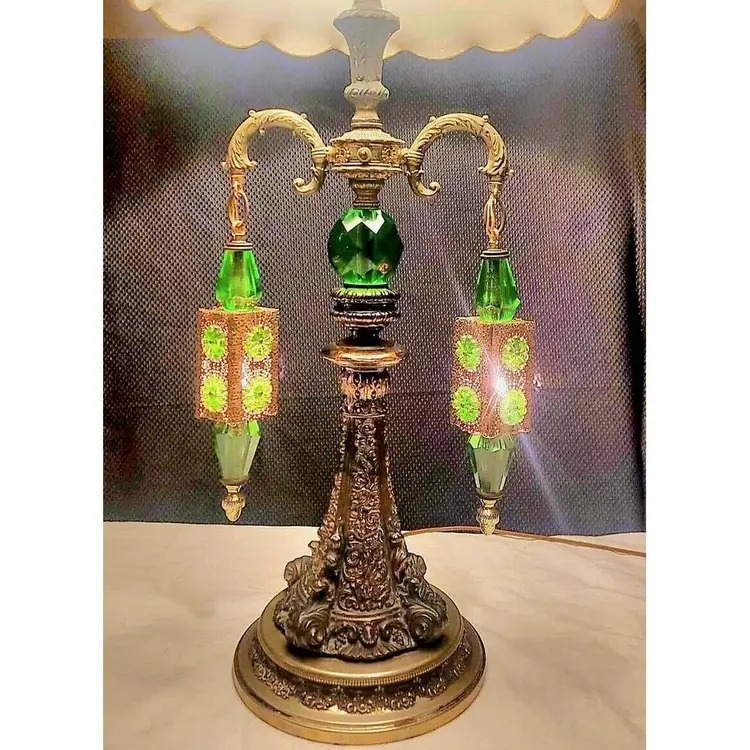 Loevsky and Loevsky Vintage Table Lamp in Hollywood Regency Style, with 2 Hanging Pendant Lights and Green Accents