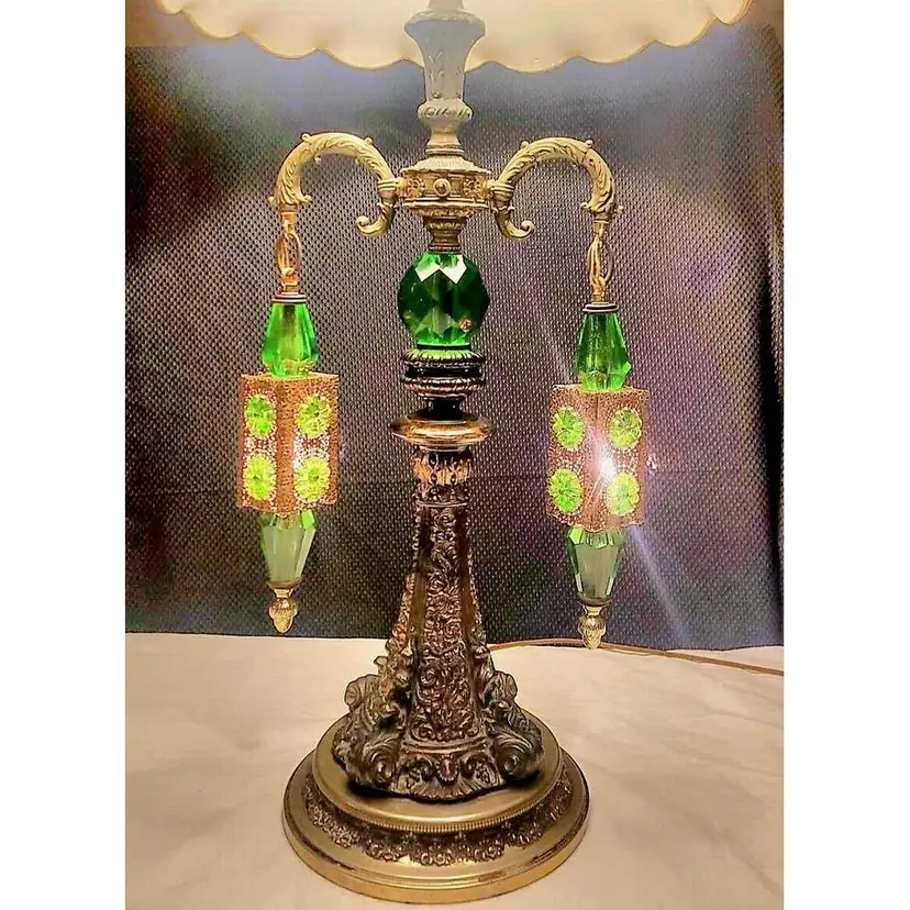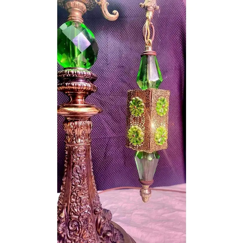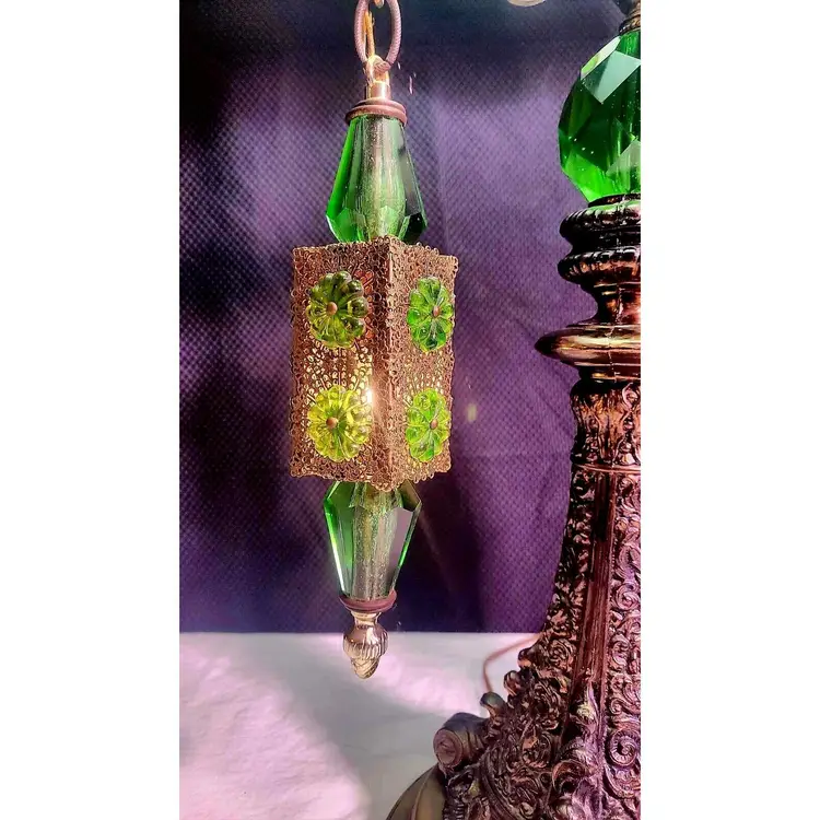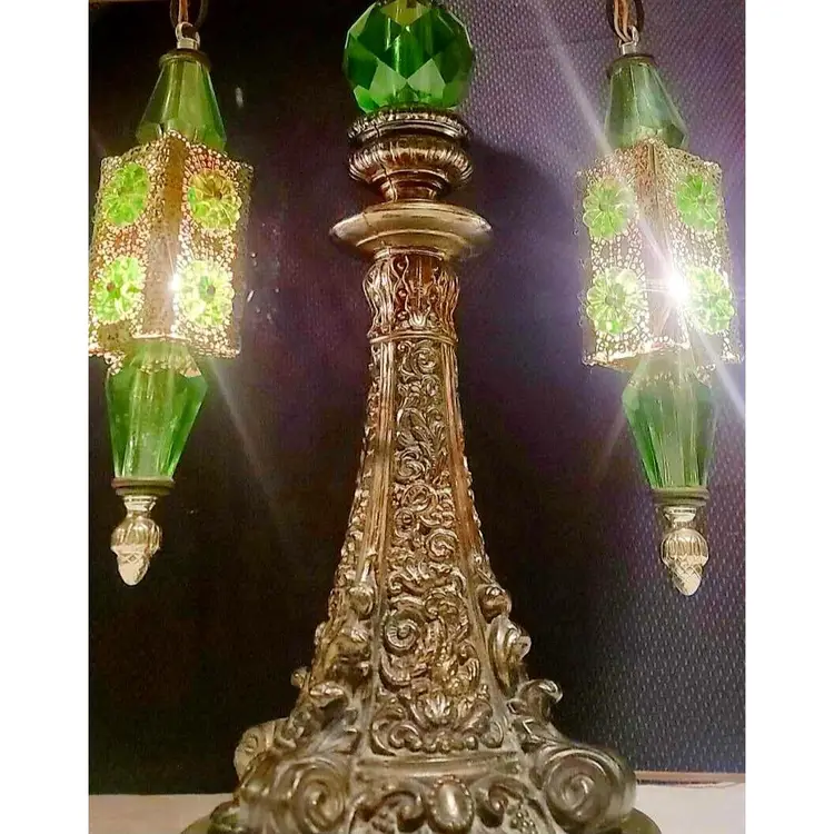This lamp has the main light switch with a 3 way switch and 2 filigreed hanging pendant lights on the side of the main body of the lamp. Both pendants light separately. You can turn just the main light on, or have the pendant lights on as well, and / or just light the pendant lights with the main light off. This lamp has green jeweled pieces, colorful green acrylic accents, the beautiful filigree and intricate design all add up to a gorgeous table lamp that will make a real statement in any room!