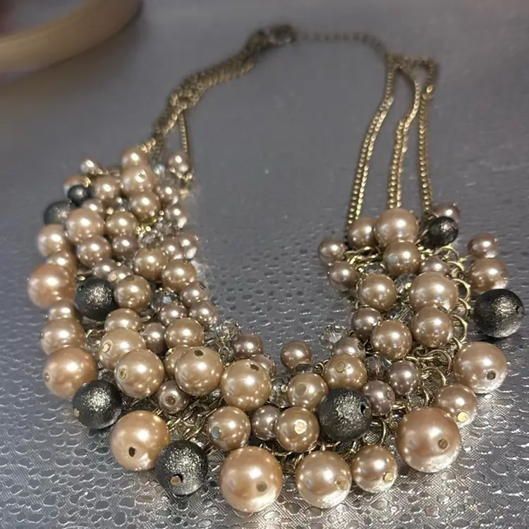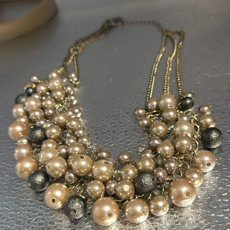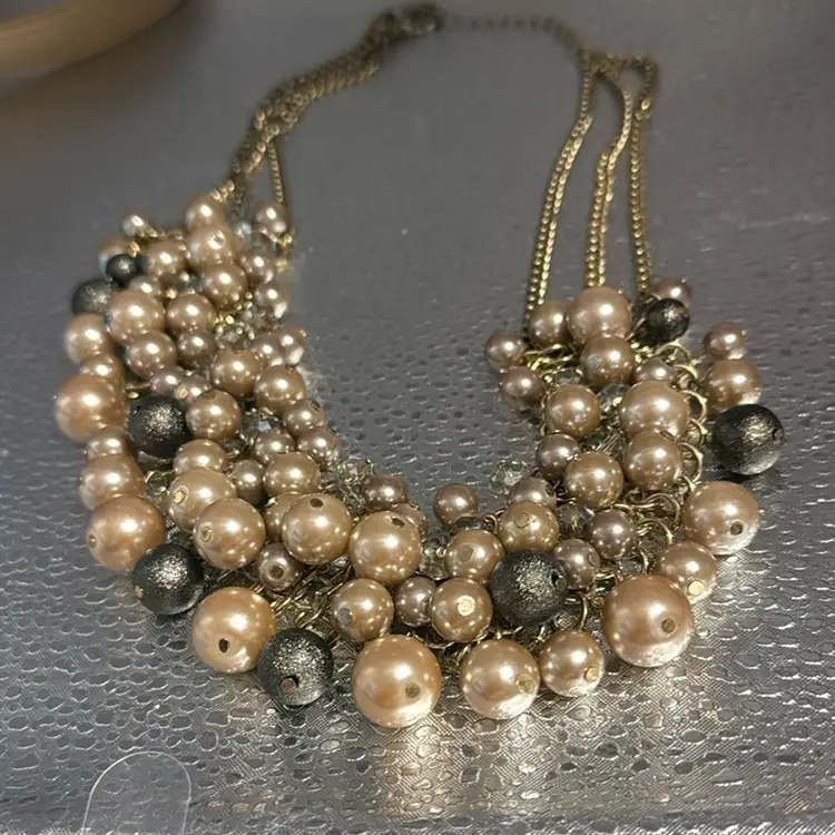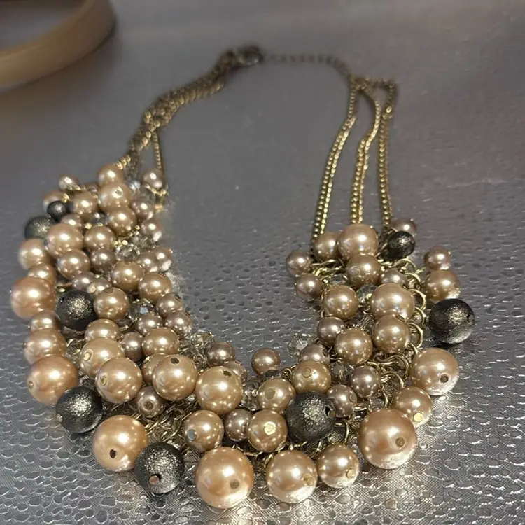 The beads are silver , clear, and peach colors. There is a tag that says Loft. This is a beautiful piece. This is a statement piece. It’s gorgeous. Make it a Vintage Christmas.