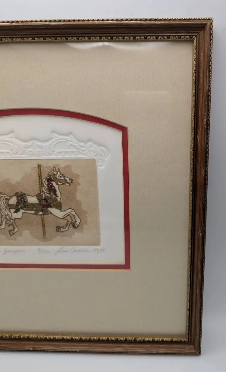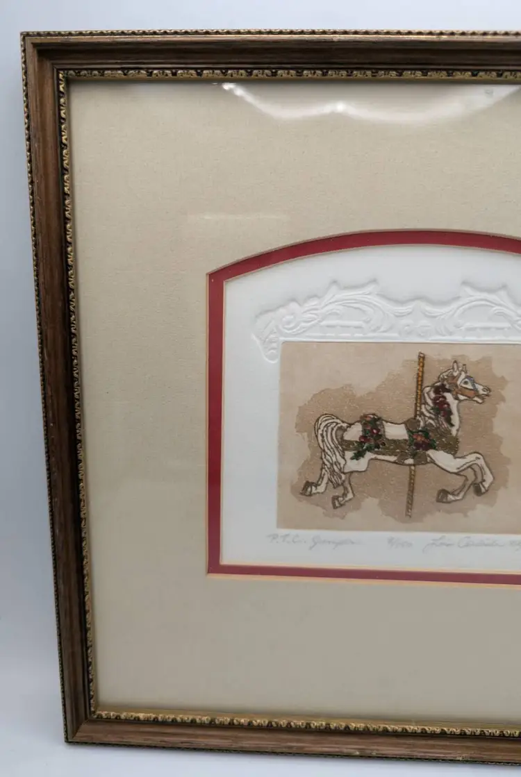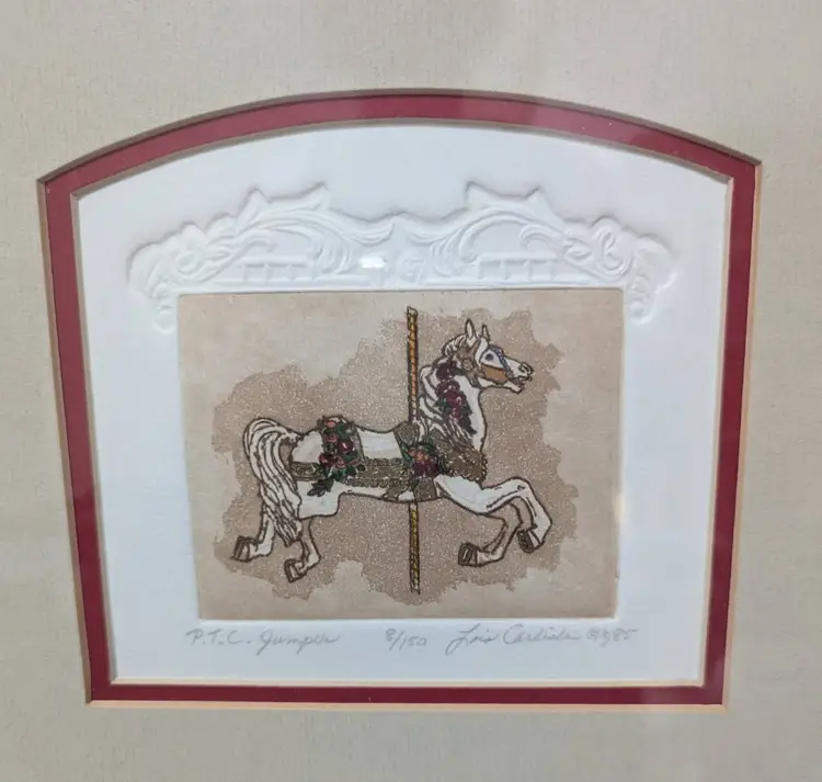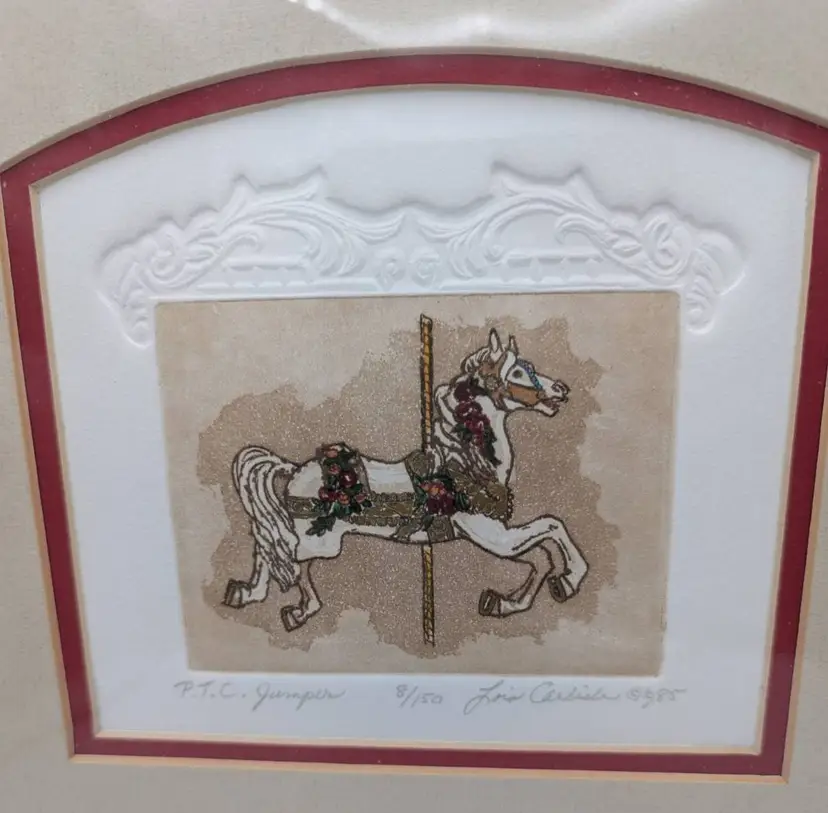 This is a hard to find- embossed etching on paper design of the PTC Jumper - Carousel Horse- by the late Lois Carlisle. PTC is – Philadelphia Toboggan Co. Hand-colored intaglio etching on 100% rag paper It is dated, hand signed and numbered. It is numbered 8/150. Very unique art-Very Nice! It is framed- The frame has some bruising. Please see photos. It is double matted. Glass over artwork. Measures: Frame outside-10.5 x 10.5 inches Inside red matting: 5.5 x 5 inches.