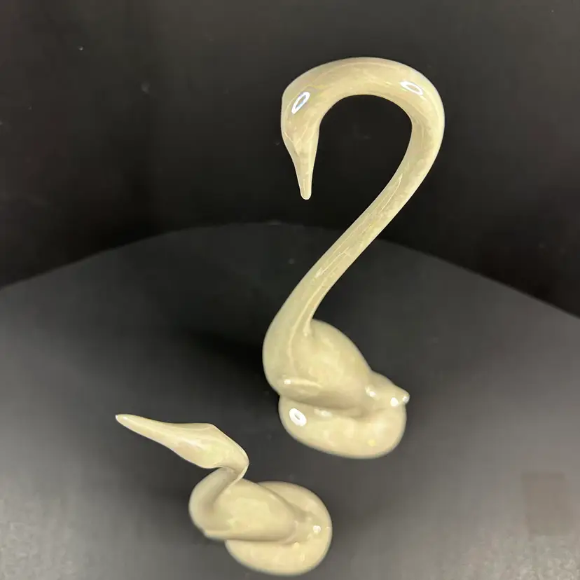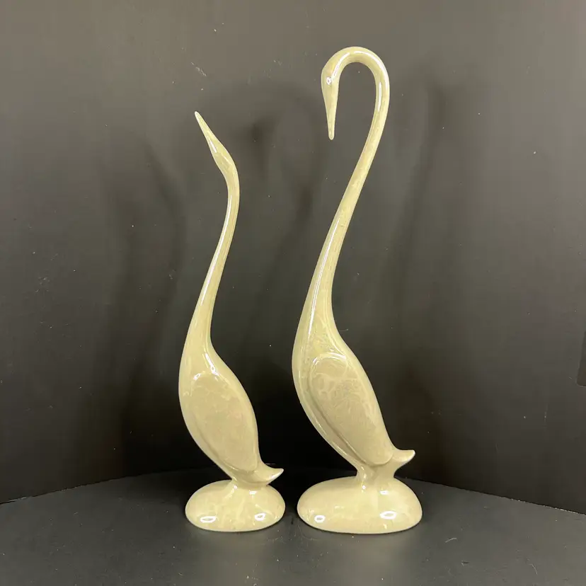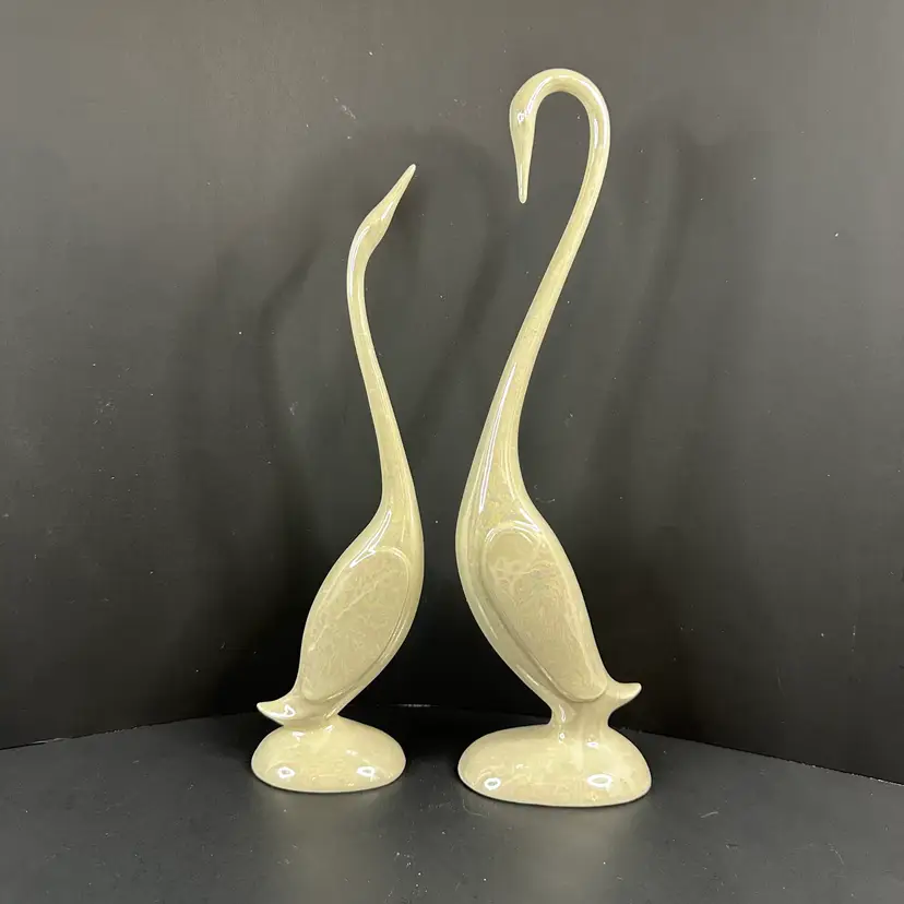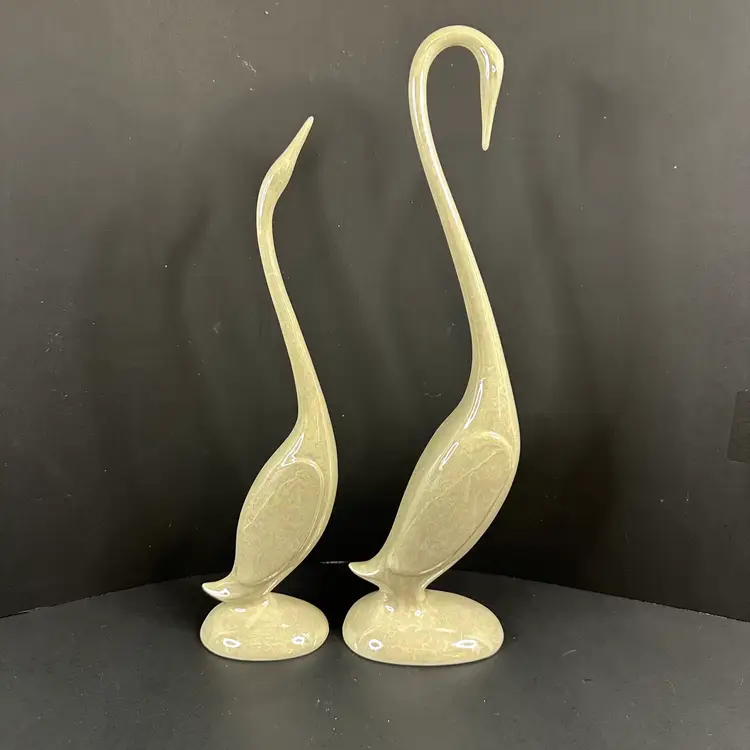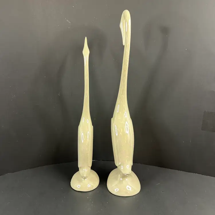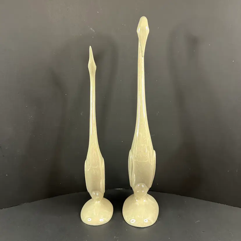 Vintage Long Necked Swan Egret Figurines Pearlized Iridescent Luster Ceramic in good preowned condition. The tallest figure is approximately 15.5 inches tall, the shorter is 13.5 inches tall. No chips, nicks or cracks. Please see photos for all the details.