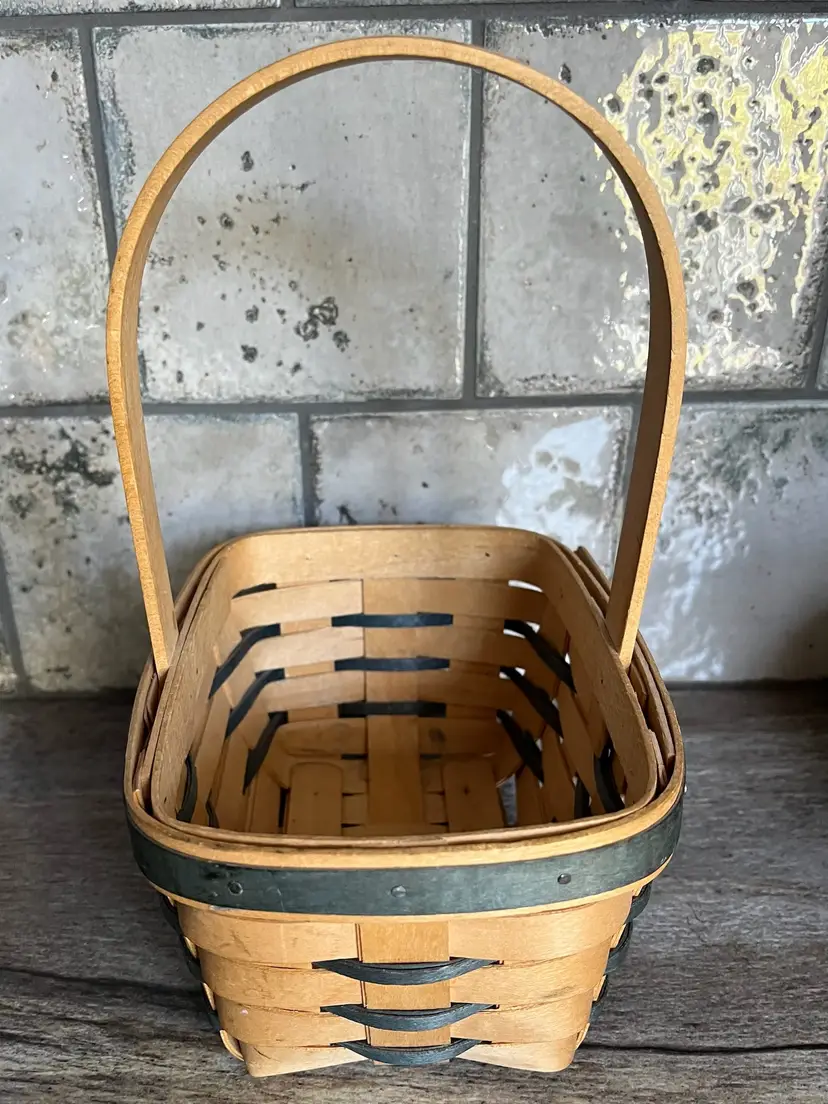 A vintage handcrafted Longaberger basket. Approximately 9 inches tall, 5 inches wide and a length of 7 inches. I think this is maplewood but I can't be certain. It is marked on the bottom with the Longaberger stamp and NC 1993. It has dirt in some spots and could use a gentle cleaning. No broken areas.