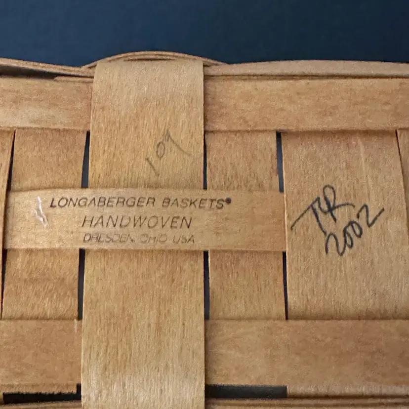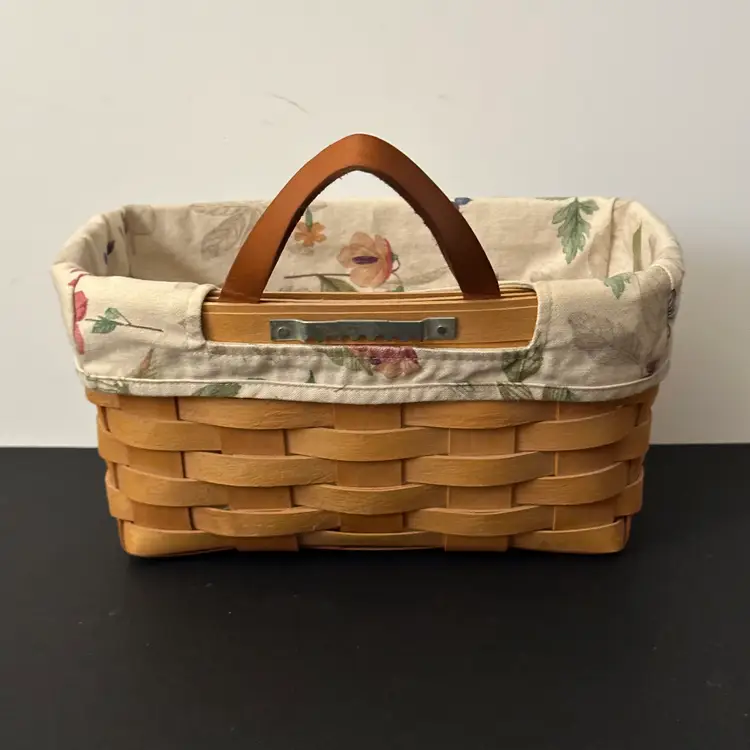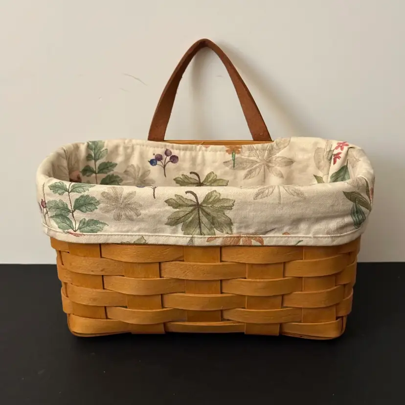 This is a Longaberger wooden basket, commonly identified as a mail or key basket, paired with a botanical or floral liner and a stationary handle. Rectangular shape with a woven structure and a protective cloth liner. Frequently utilized for home decor, organization, or as a collectible item. Dated 2002.