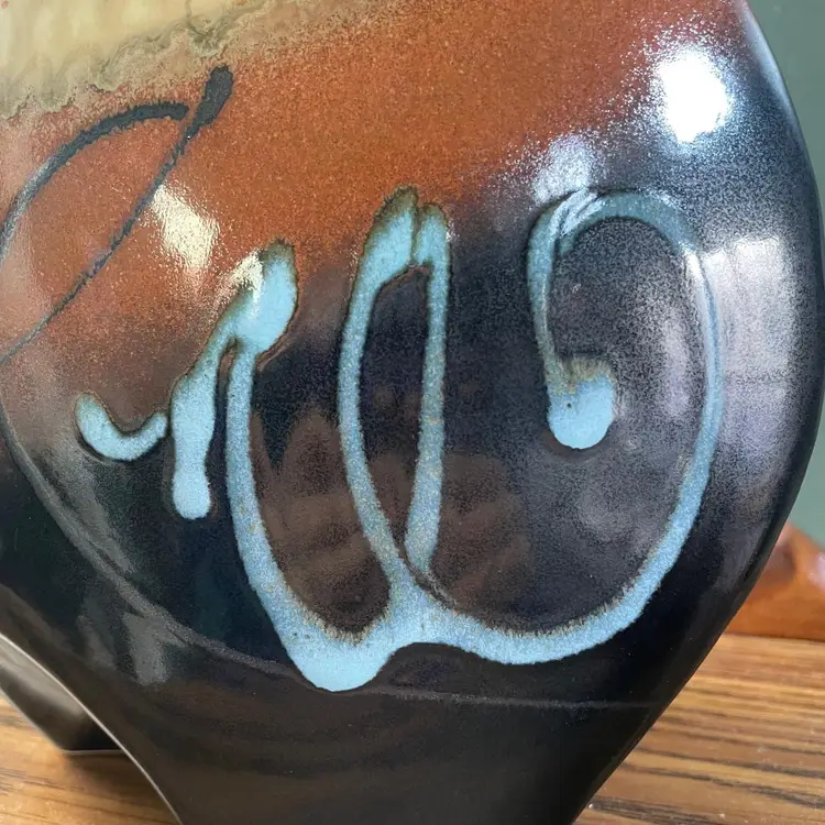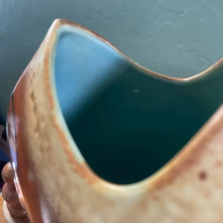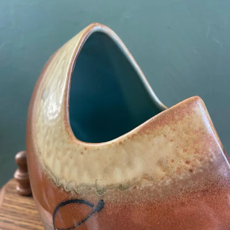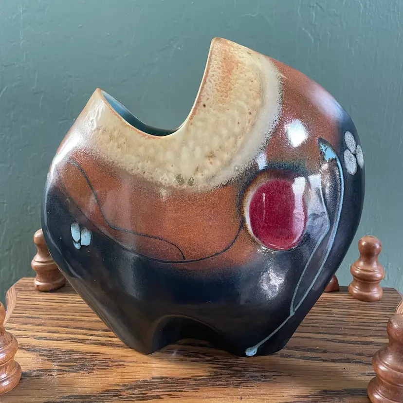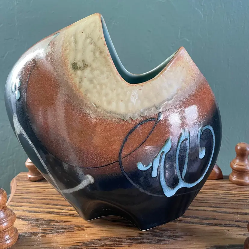 A beautiful studio pottery vase with abstract design made by Seattle artist Loren Lukens. It measures about 9 inches in height, 9.5 inches wide at its widest point, and around 5 inches wide at its base. Its dramatic irregular shape and unique robin's egg blue inner glaze makes this vase an excellent statement piece for a collector.