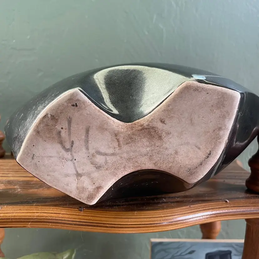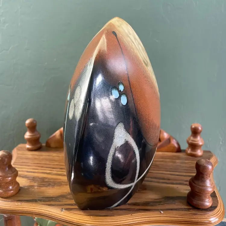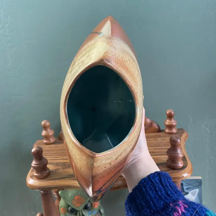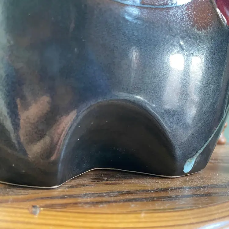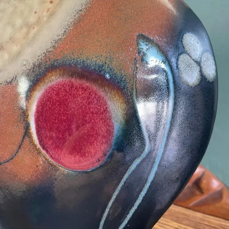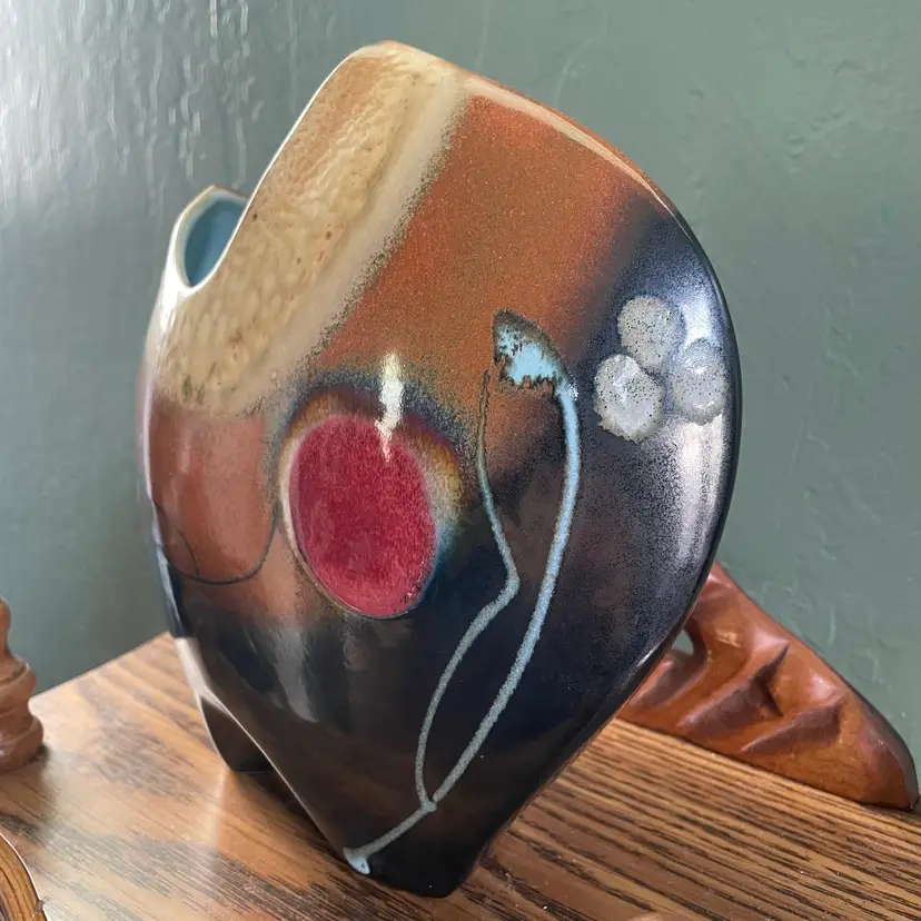 A beautiful studio pottery vase with abstract design made by Seattle artist Loren Lukens. It measures about 9 inches in height, 9.5 inches wide at its widest point, and around 5 inches wide at its base. Its dramatic irregular shape and unique robin's egg blue inner glaze makes this vase an excellent statement piece for a collector.