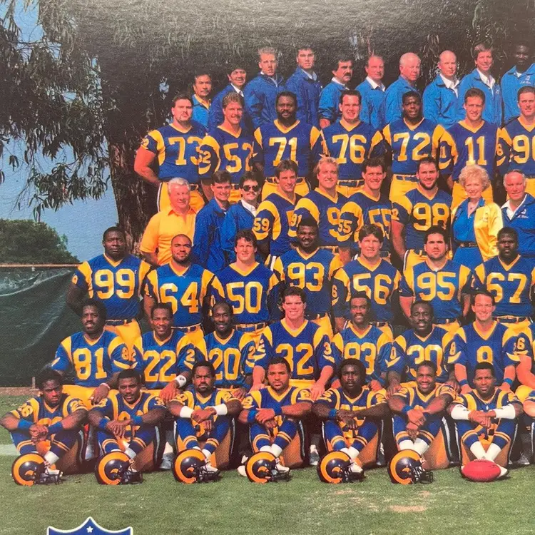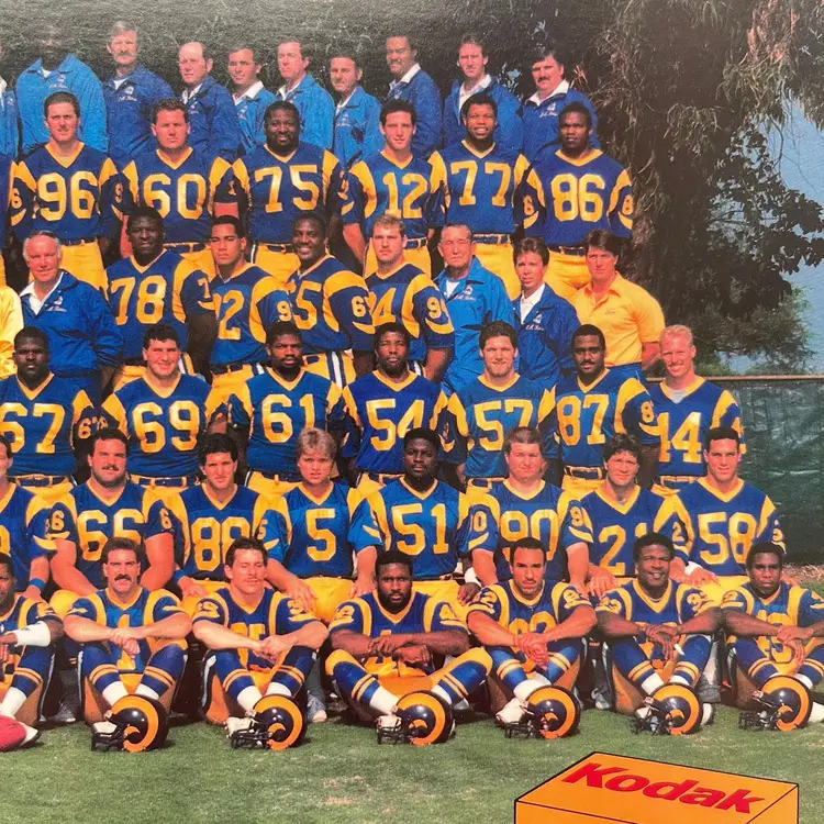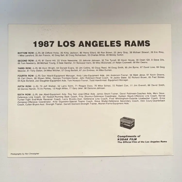 1987 Los Angeles Rams NFL Football Photo John Robinson Jim Everett Charles White Vintage 1980s Rams Team Players Regular Season Clifford Hicks, Kirby Jackson, Henry Ellard, Ron Brown, Jerry Gray, Michael Stewart, Eric Riley, Mike Lansford, Jon Francis, Greg Bell, Craig Richardson, Charles White, Mickey Sutton David Hill, Vince Newsome, Johnnie Johnson, Tim Tyrell, Kevin House, Owen Gill, Steve Dils, Tom Newberry, Michael Young, Dale Hatcher, Norwood Vann, Mike McDonald, Nolan Cromwell, Mel Owens Alvin Wright, Donald Evans, Jim Collins, Doug Reed, Doug Smith, Jim Byrne, Duval Love, Greg Meisner, Tony Slaton, Mike Wilcher, Doug Bartlett, Jon Embree, Mike Guman Mark Jerue, Kevin Greene, Carl Ekern, Shawn Miller, Georgia Frontiere (Owner), John Robinson (Head Coach), Jackie Slater, Richard Brown, Fred Stokes, Kyle Borland Jeff Walker, Larry Kelm, Reggie Doss, Mike Schad, Robert Cox, Jim Everett, David Smith, Dennis Harrah, Irv Pankey, Hugh Millen, Gary Jeter, Damone Johnson 8x10 Picture Kodak Film Promo Photography by Ron Christopher Condition: Good condition Packaged in a plastic sleeve inside a rigid envelope Visit my store to see more vintage ephemera, advertising, novelties, gifts, estate sale and yard sale finds https://district.net/u/finderspickerspaper SKU B28