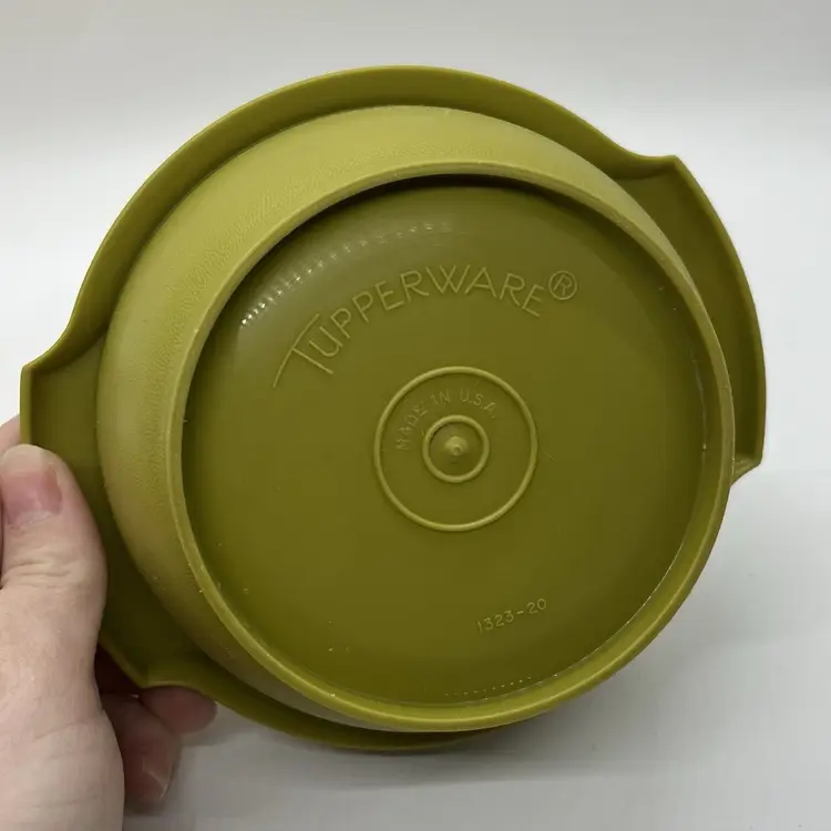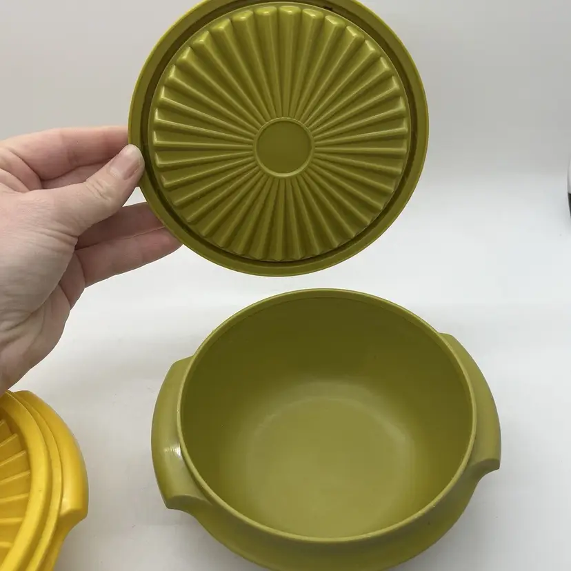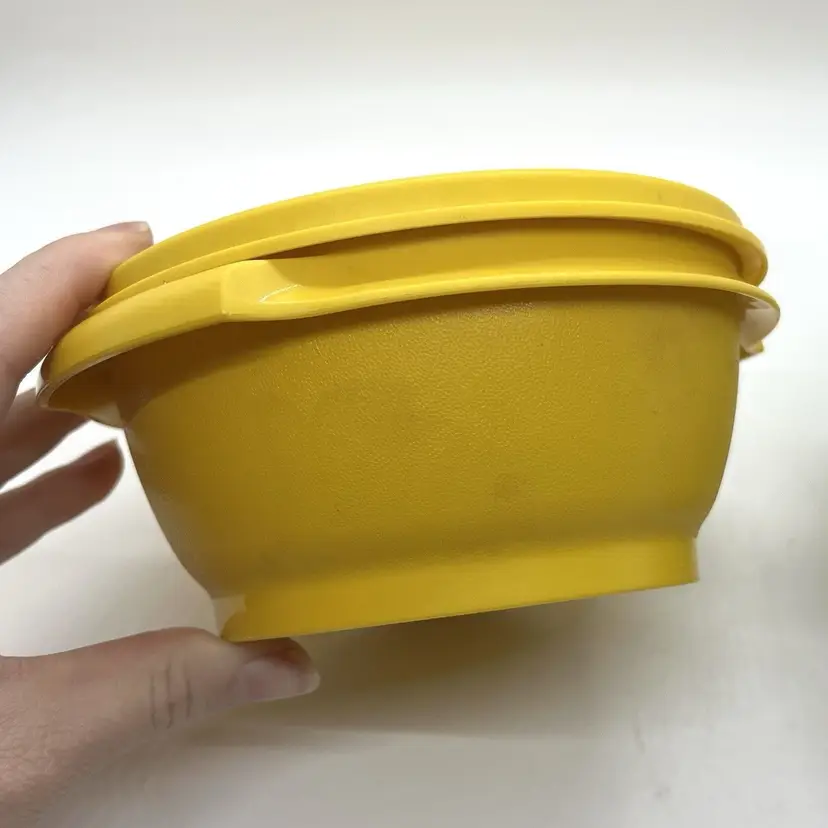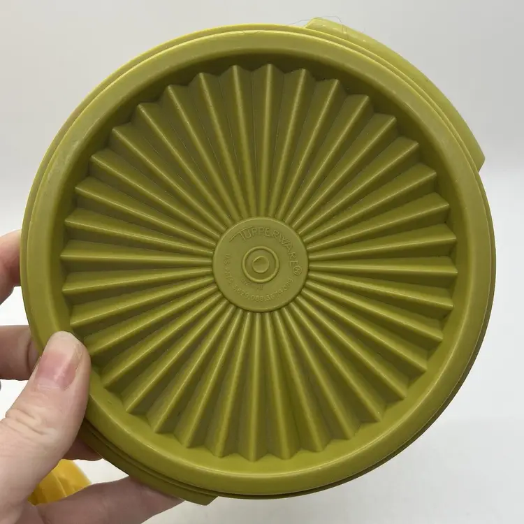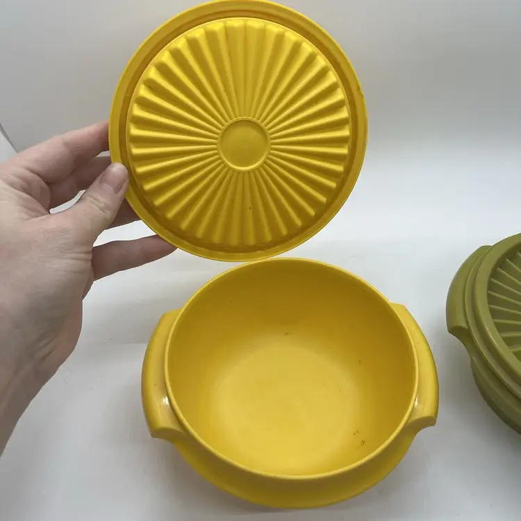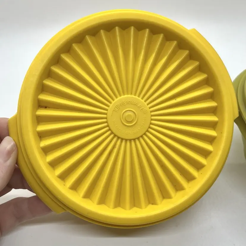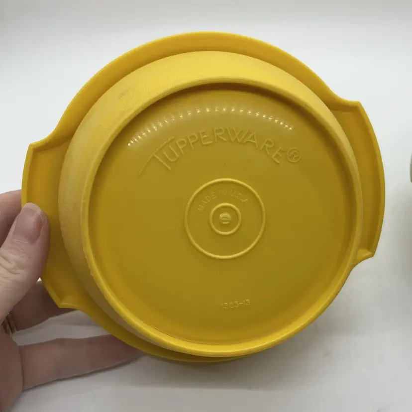 A set of two small servalier containers by Tupperware. The yellow one does have schmutz on it as pictured, I scrubbed both of them and that was as clean as I could get them.