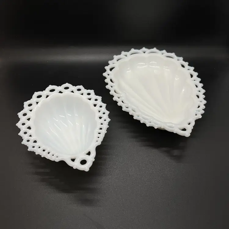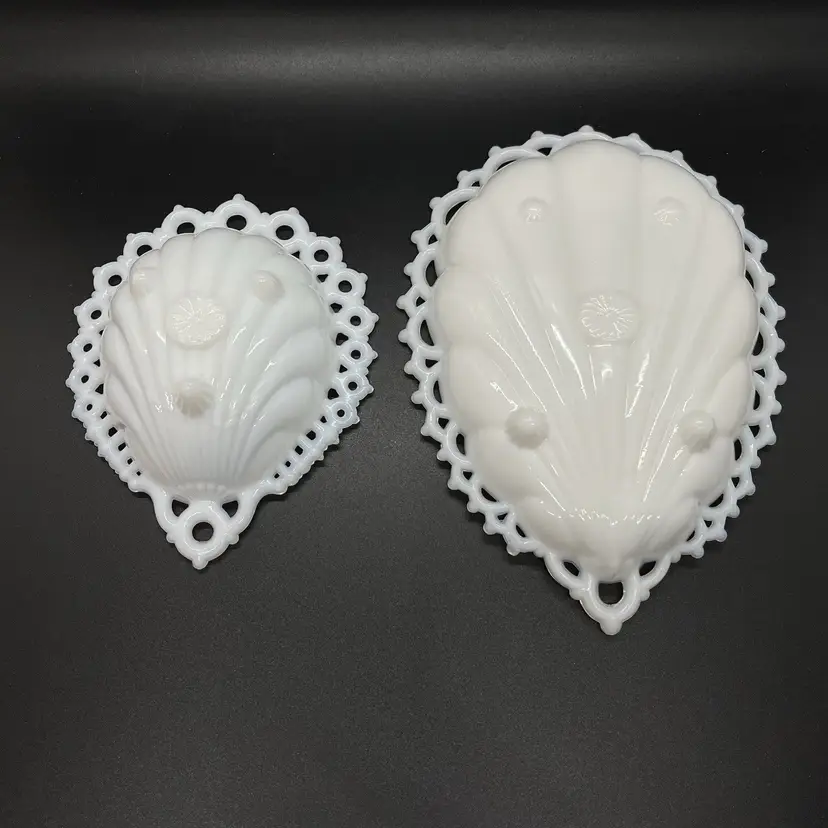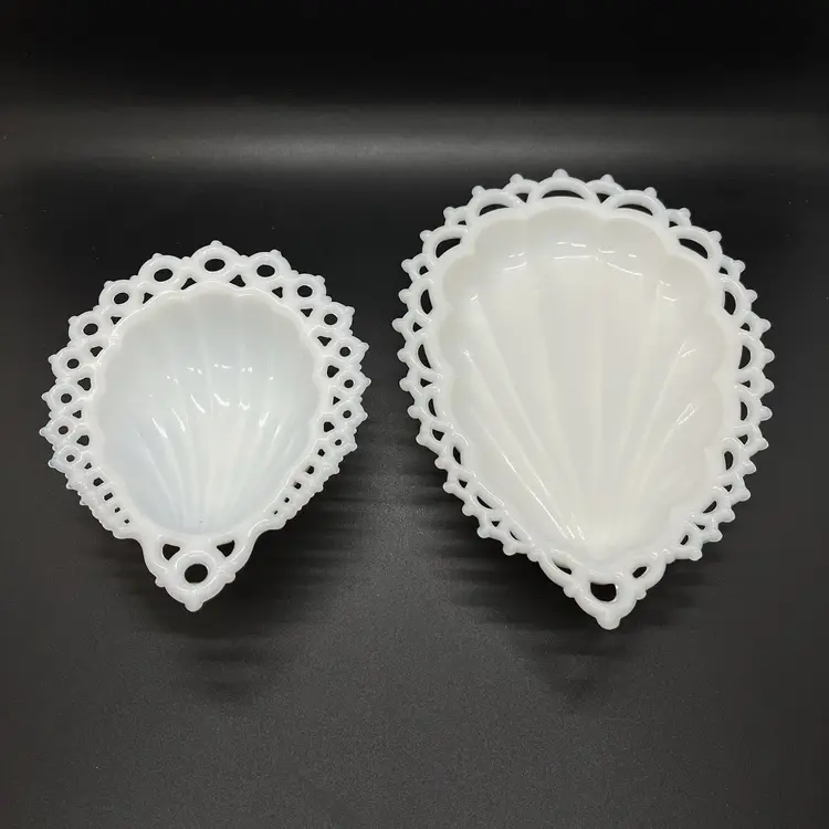 This is a pair of Westmoreland milk glass catch all dishes. Both have no chips or cracks, the larger one measures about 7x5 and smaller one about 5x4.