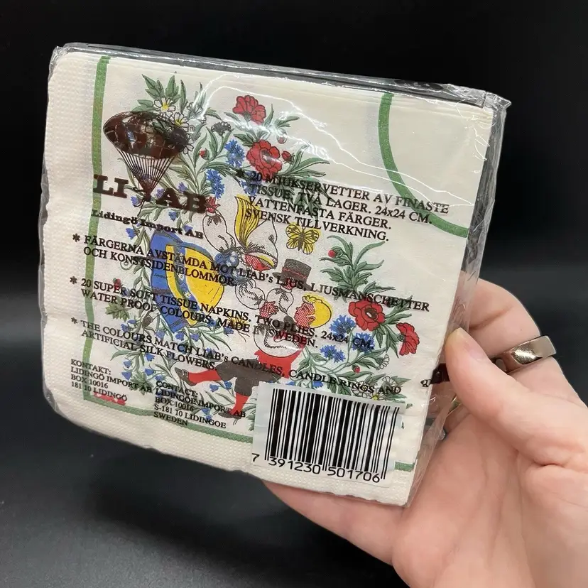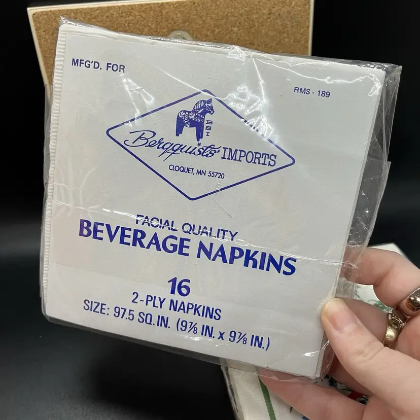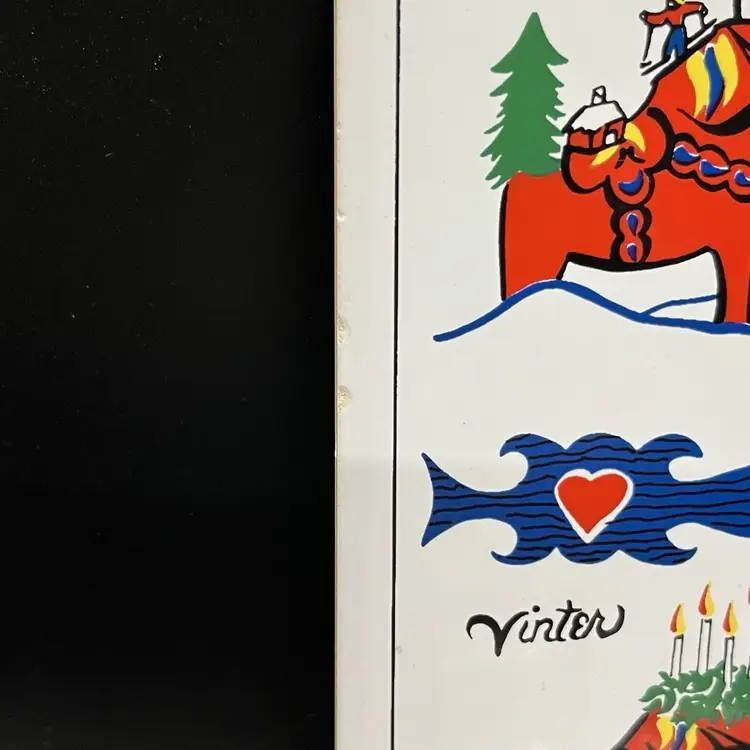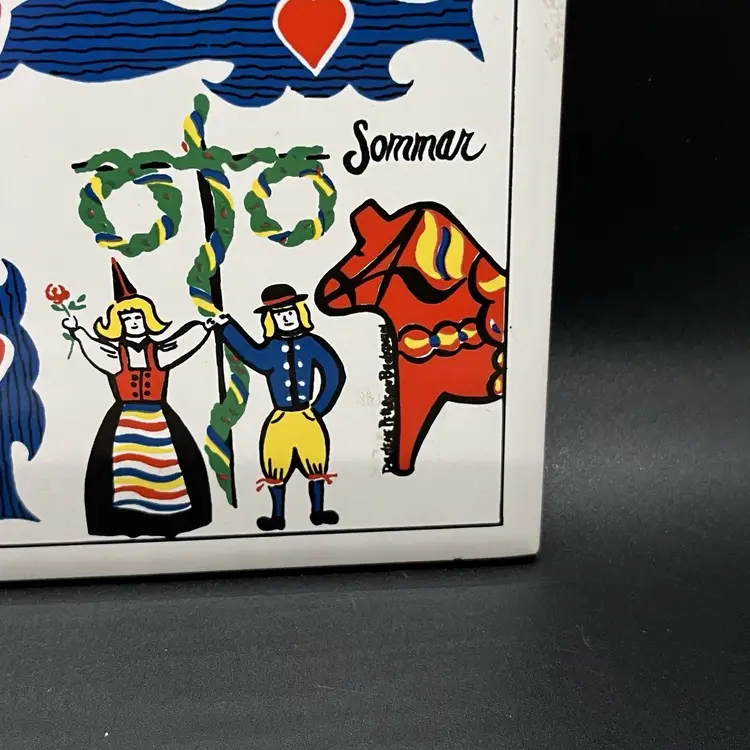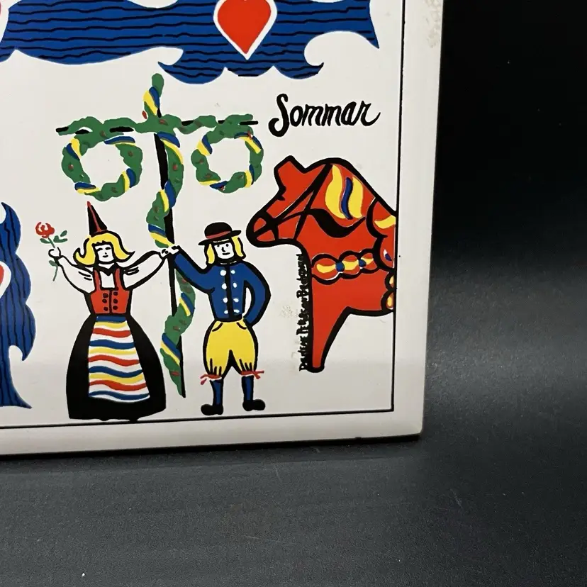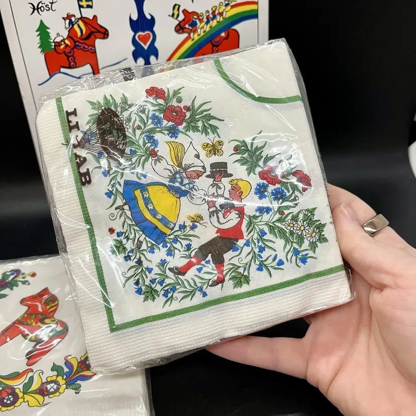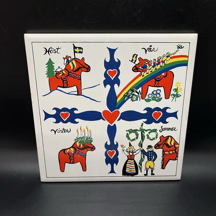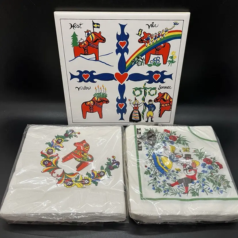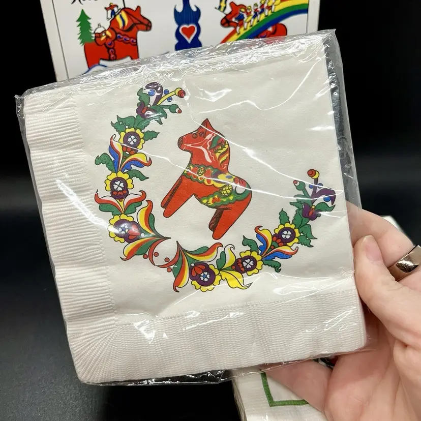 This is a lot of vintage Scandinavian kitchen wares. Includes a Dala horse ceramic tile trivet and two sealed packs of paper napkins, one with Dala horses and the other with a traditional folk art design. There's a couple small chips on the trivet as pictured, trivet measures 6" across and napkins are about 5" across.