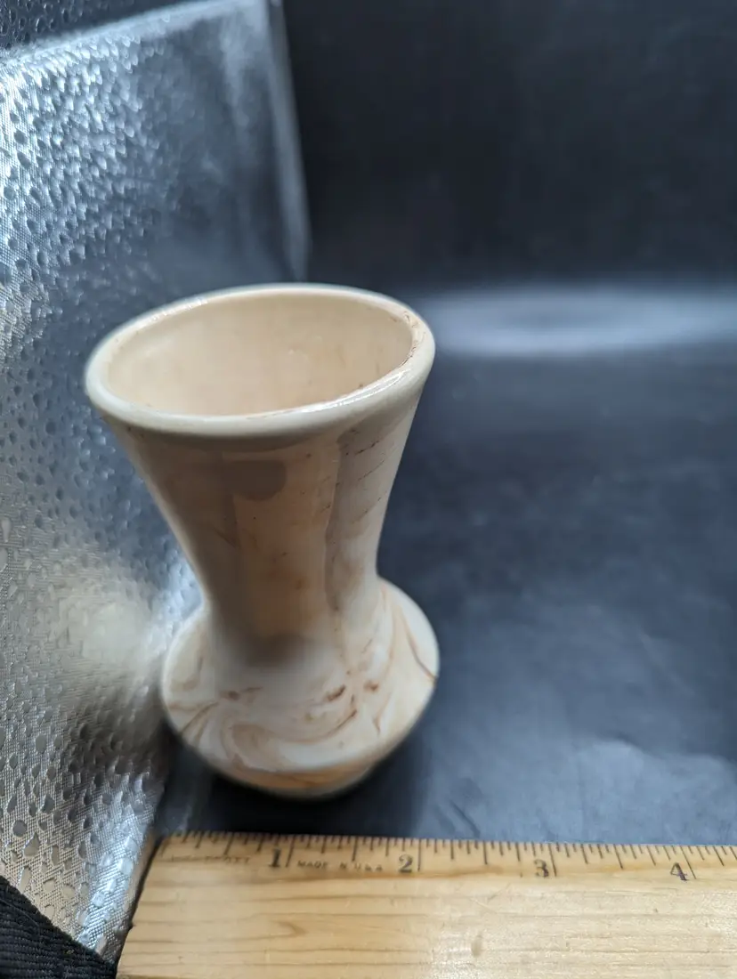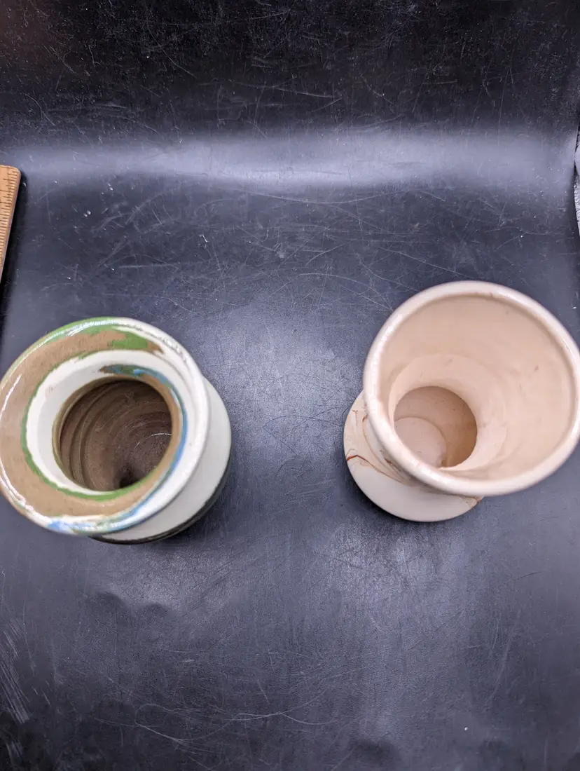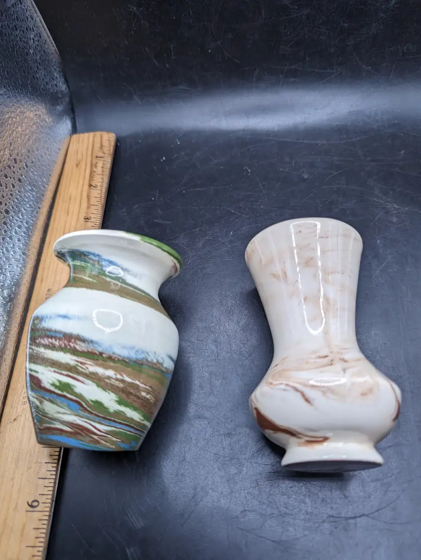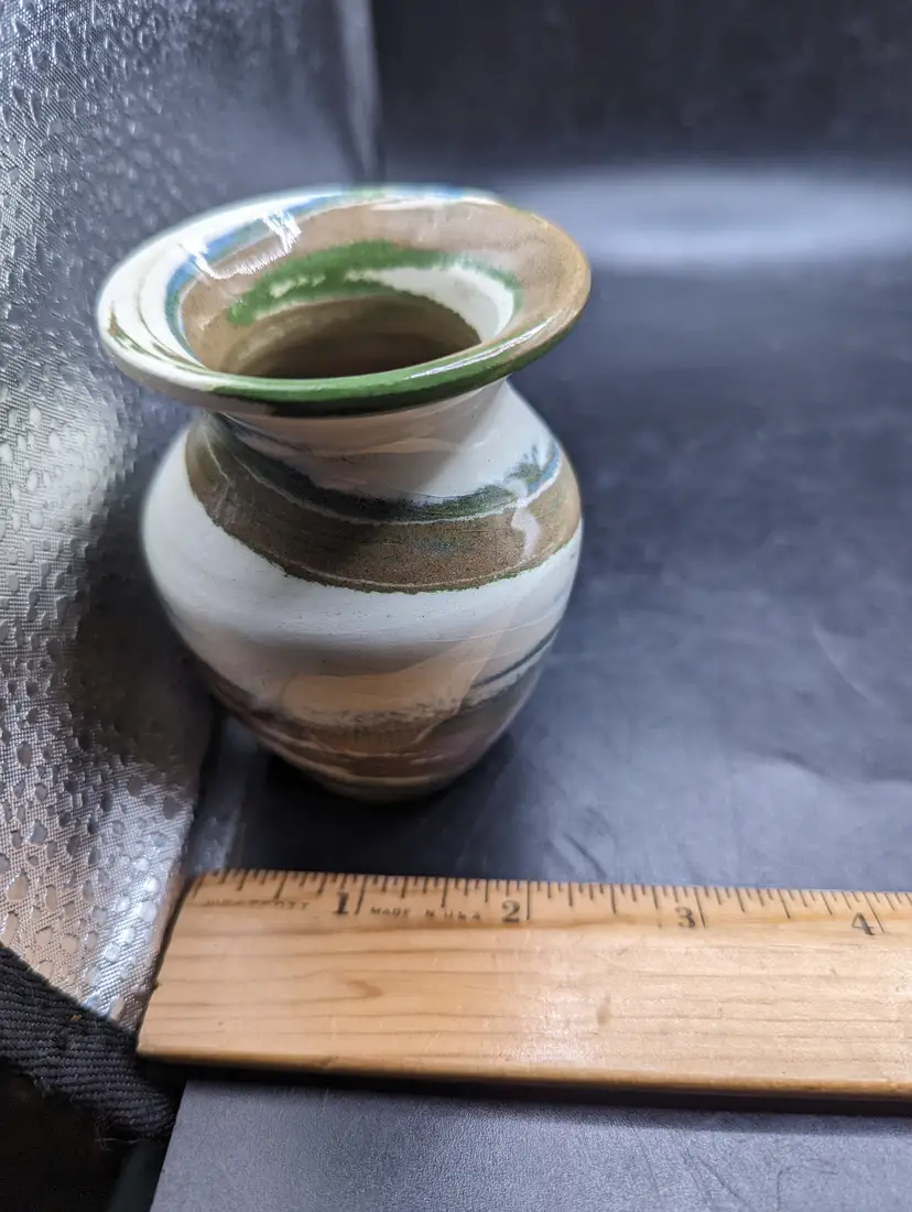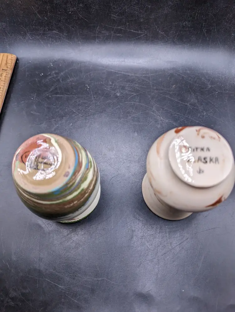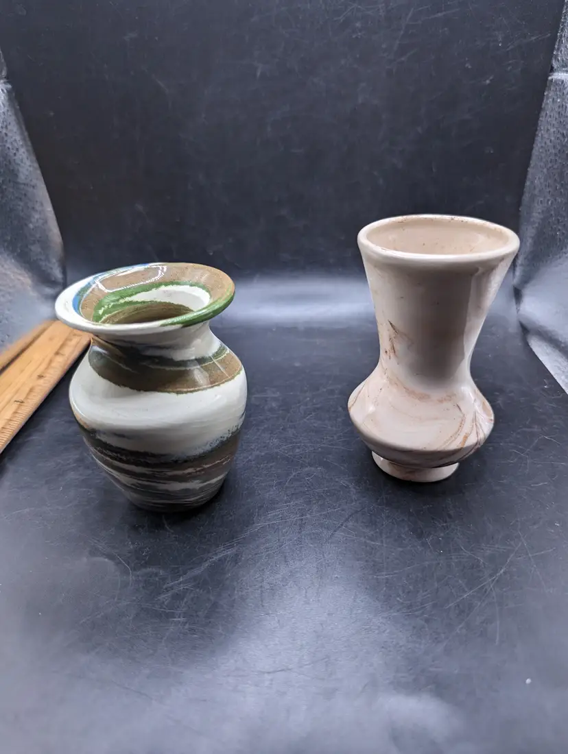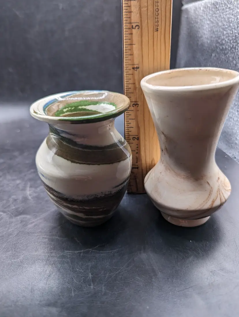 This is a lovely Vintage Lot of 2 Hand Made Pottery Vases - Desert Sands And Sitka Alaska. The Desert Sands is done in a brown, blue and green swirl design. The Sitka case is done in a rusty brown clay swirl design. Please see all pictures for condition and measurements
