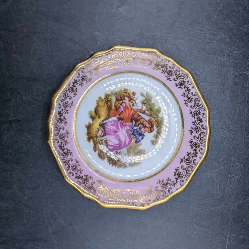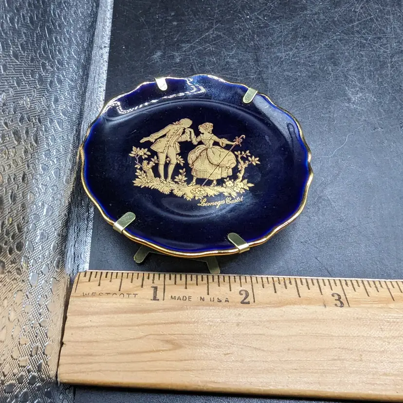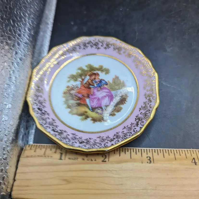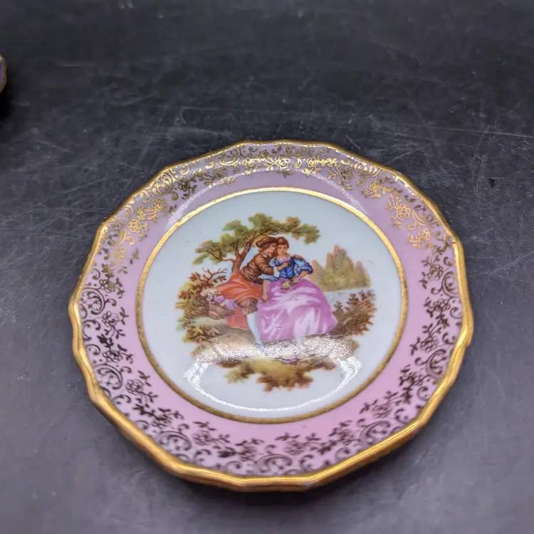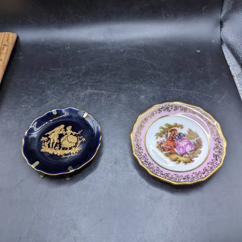 This is a lovely Vintage Lot of 2 Limoges Miniature Porcelain Courting Couple Plates One Cobalt Castel and One Pink and Gold. The Cobalt Castel has it's own attached Limoges plate stand. No chips or cracks. Please see all pictures for condition and measurements.
