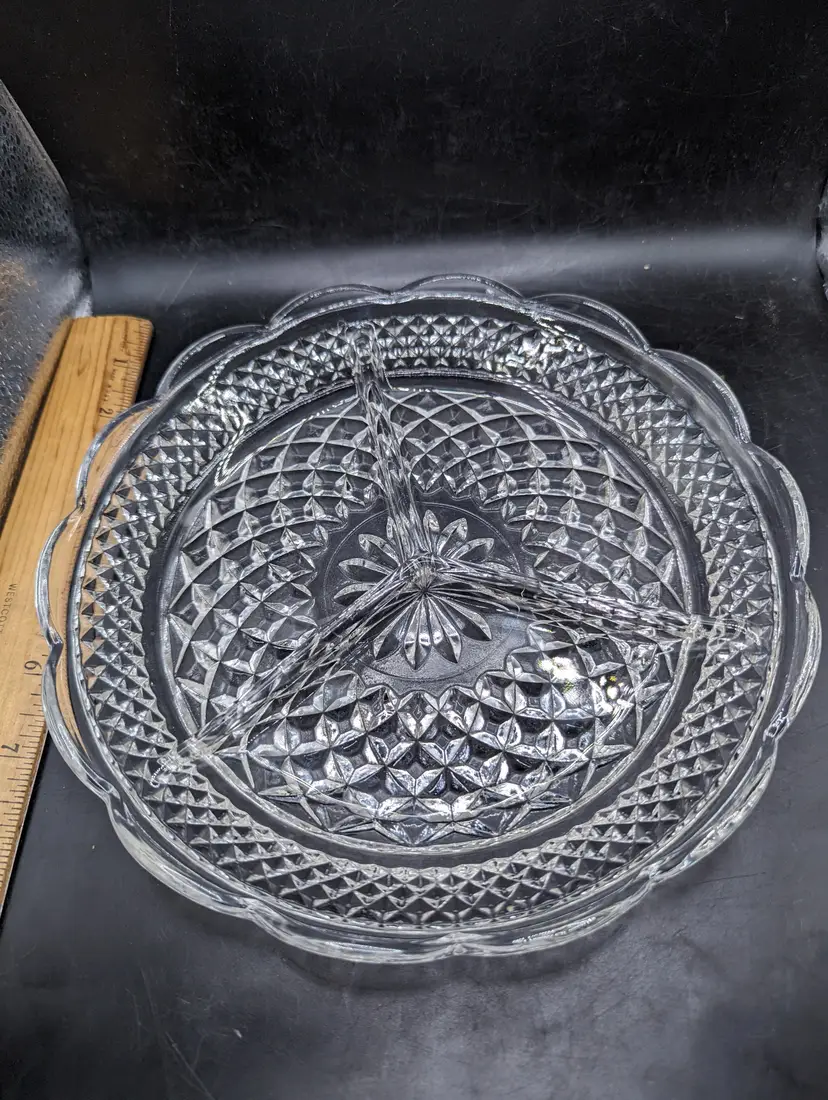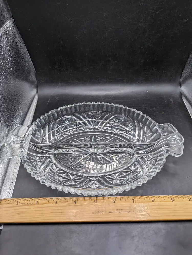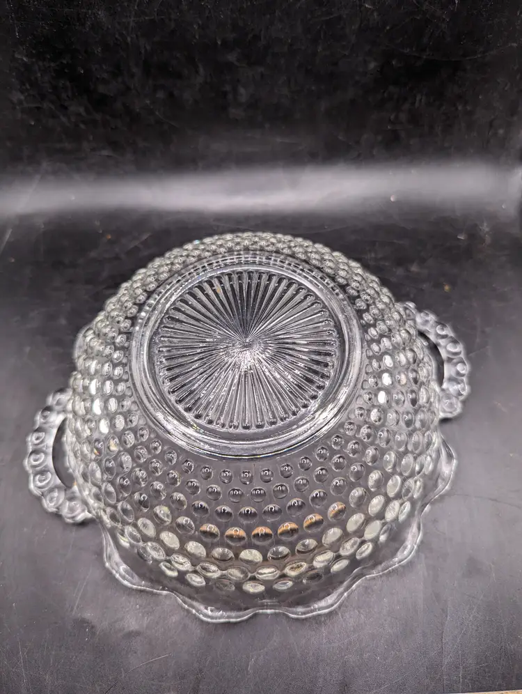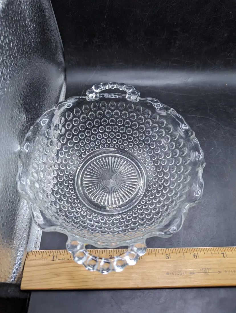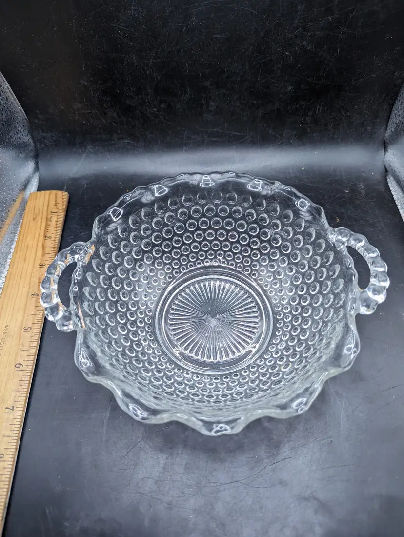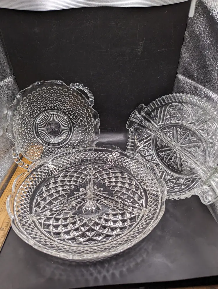 This is a lovely Vintage Lot of 3 Anchor Hocking Glass Serving Dishes. They include round acalloped edge hobnail bowl with handles, stars and bars divided relish dish and a Wexford design 3 part dish. No chips or cracks. Please see all pictures for condition and measurements.