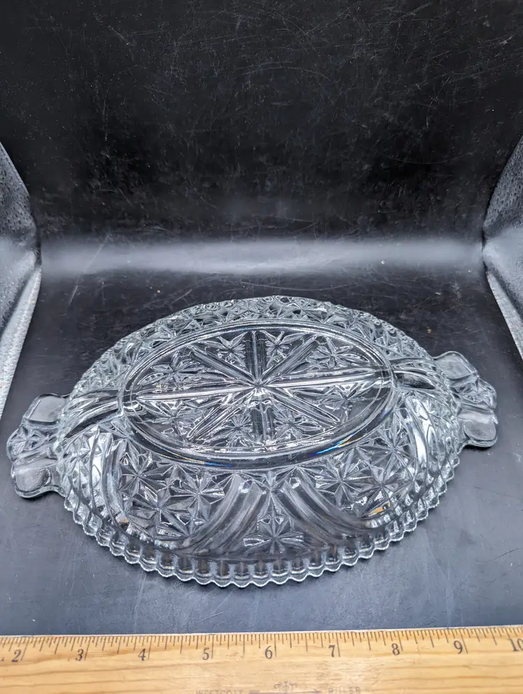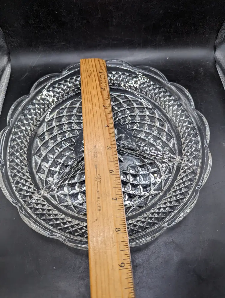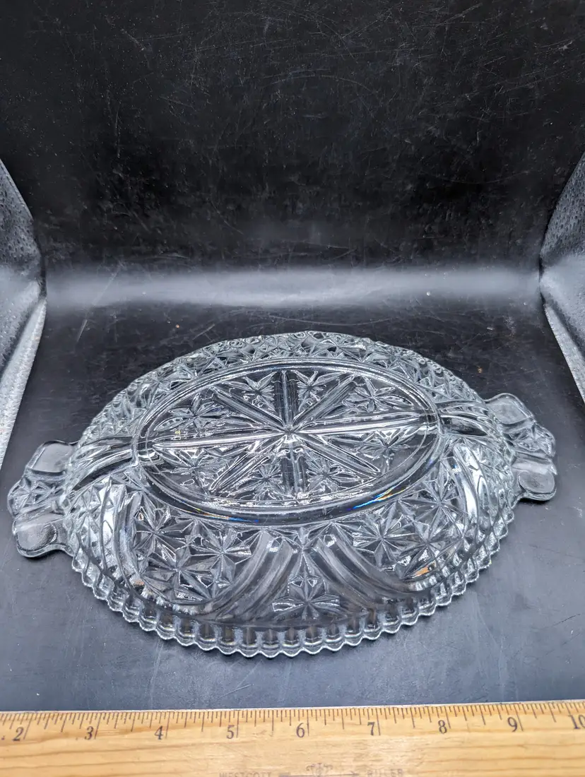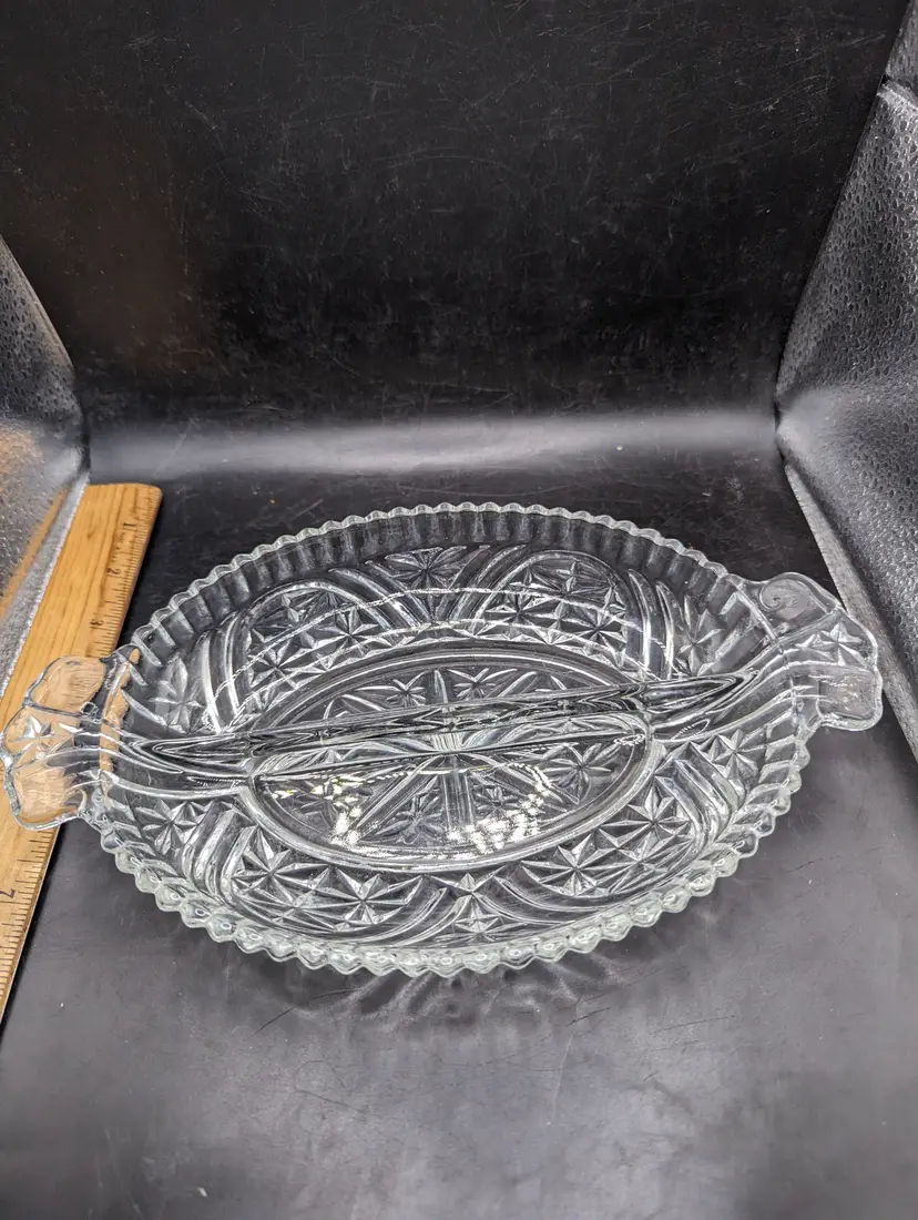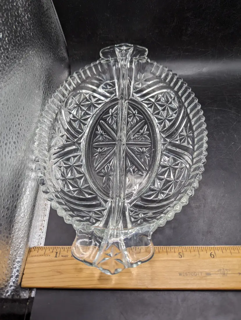 This is a lovely Vintage Lot of 3 Anchor Hocking Glass Serving Dishes. They include round acalloped edge hobnail bowl with handles, stars and bars divided relish dish and a Wexford design 3 part dish. No chips or cracks. Please see all pictures for condition and measurements.