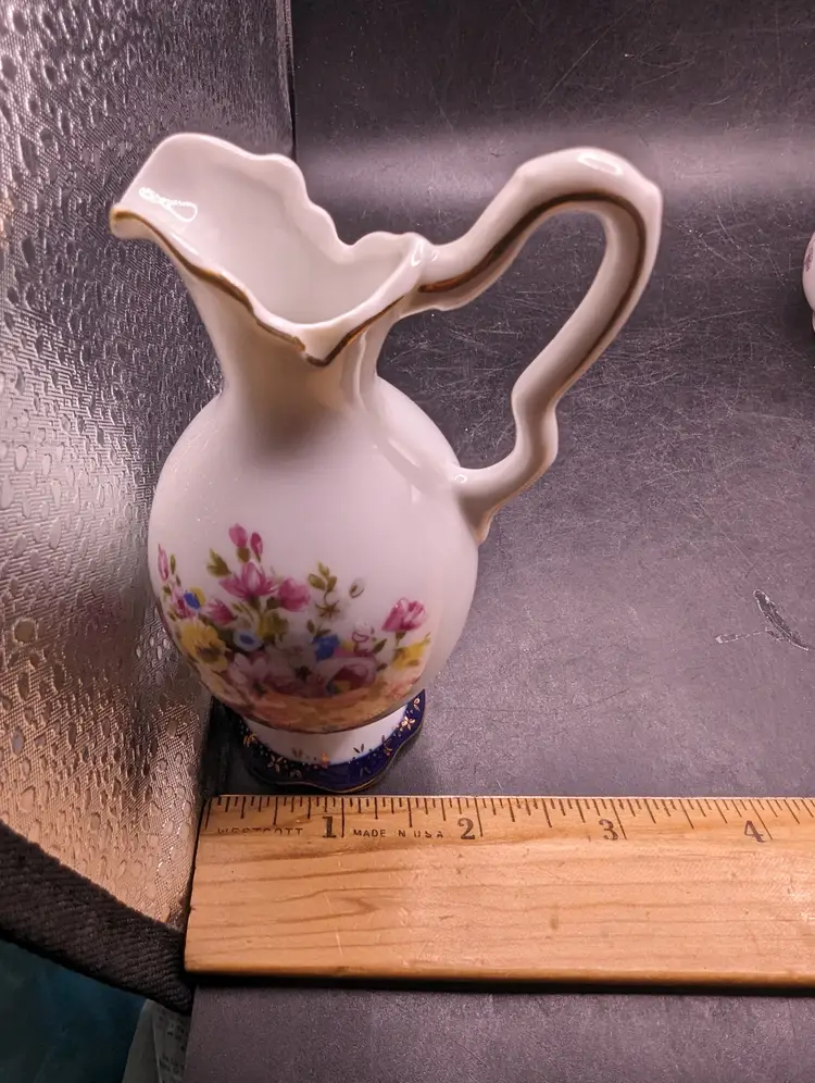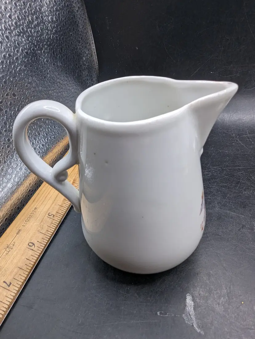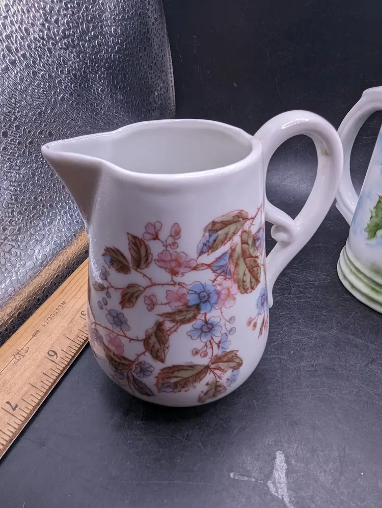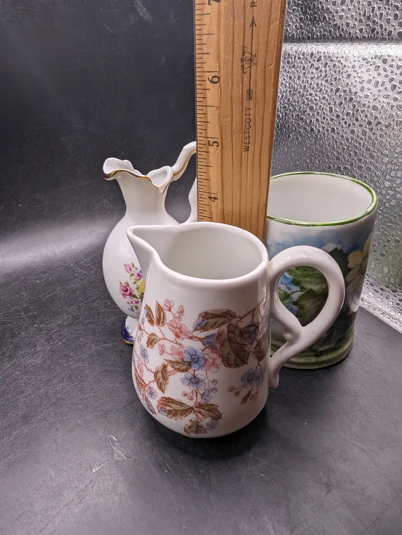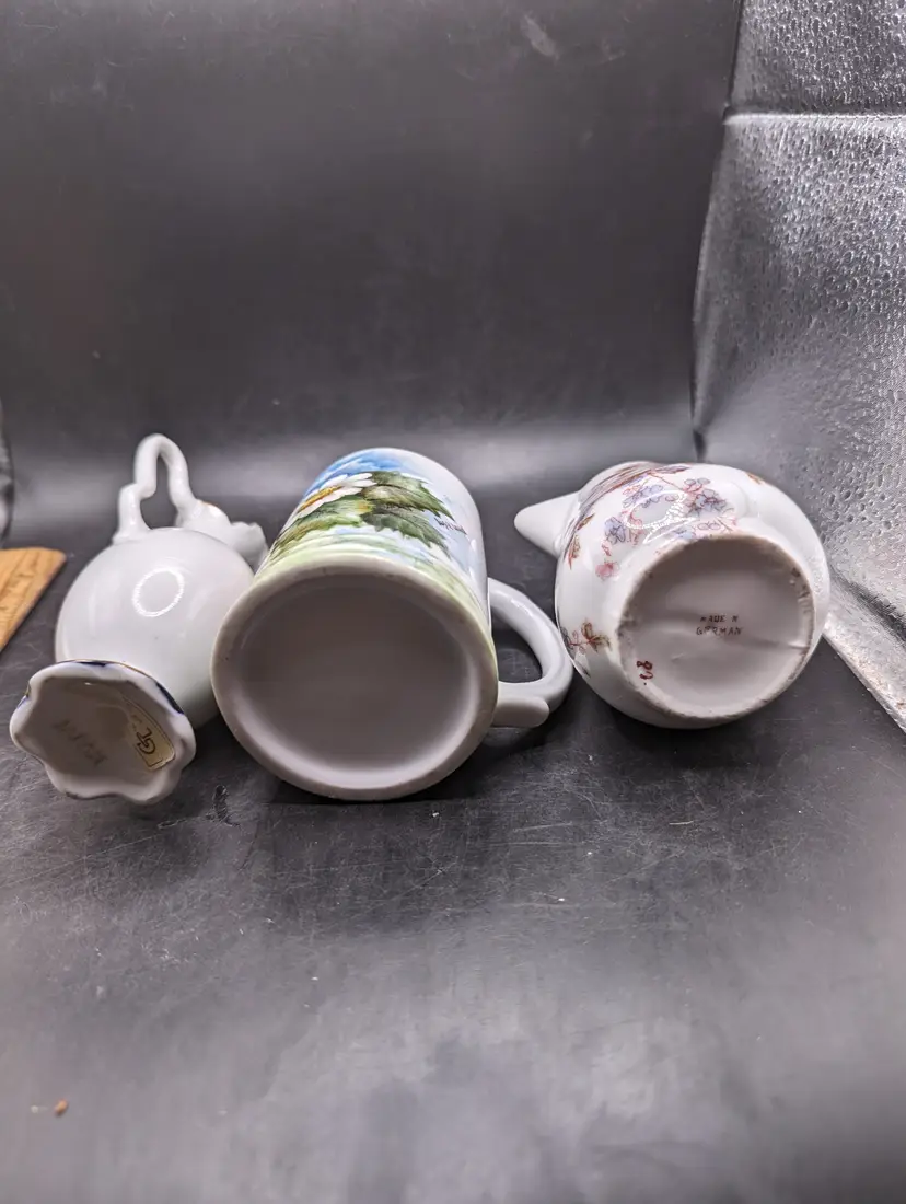 This is a lovely Vintage Lot of 3 Porcelain Pieces Two Creamers and One Cup. The two creamers are marked Japan. The cup seems to be hand painted and signed on the front. Please see all pictures for condition and measurements.
