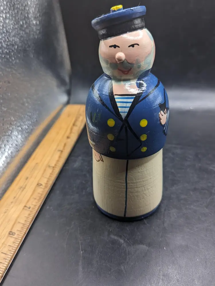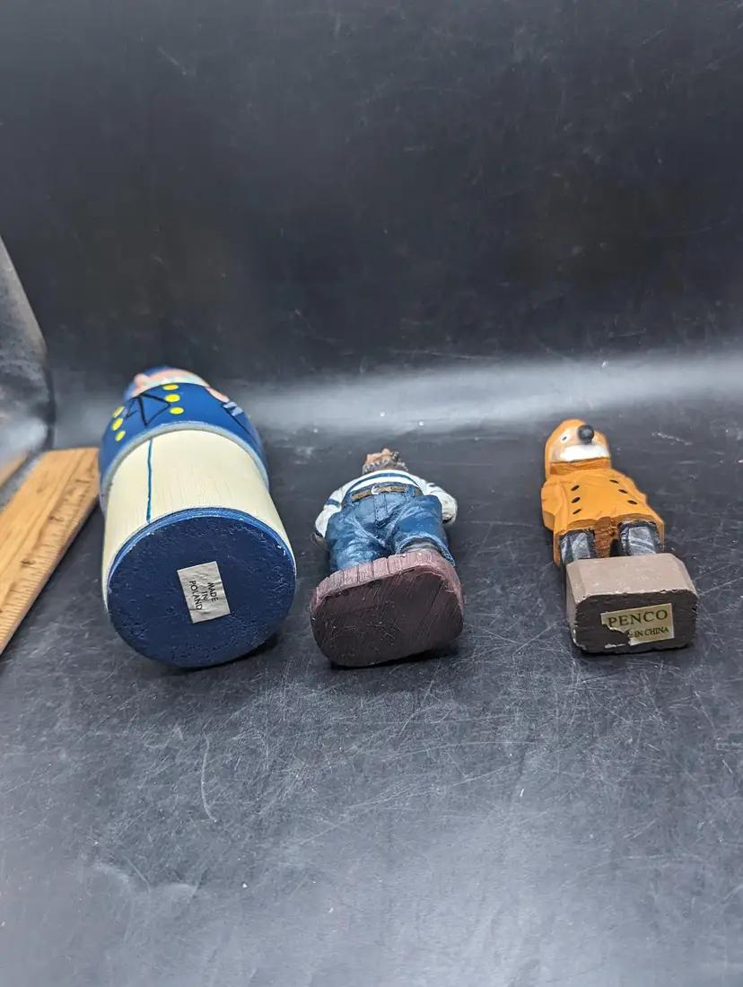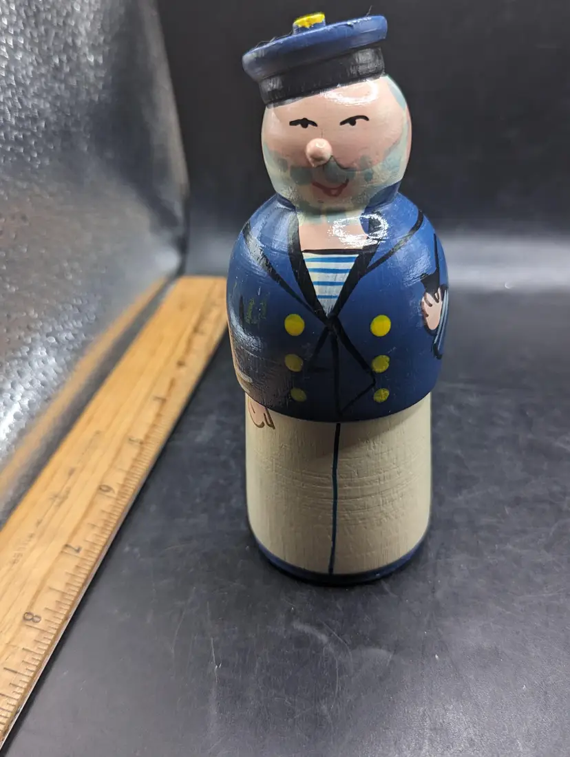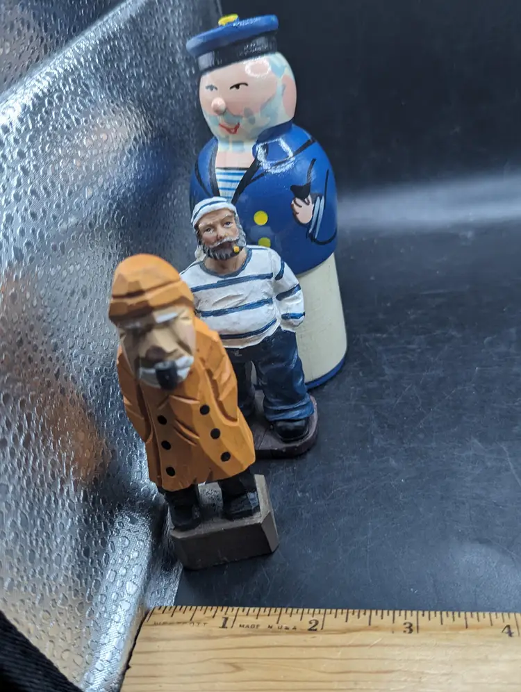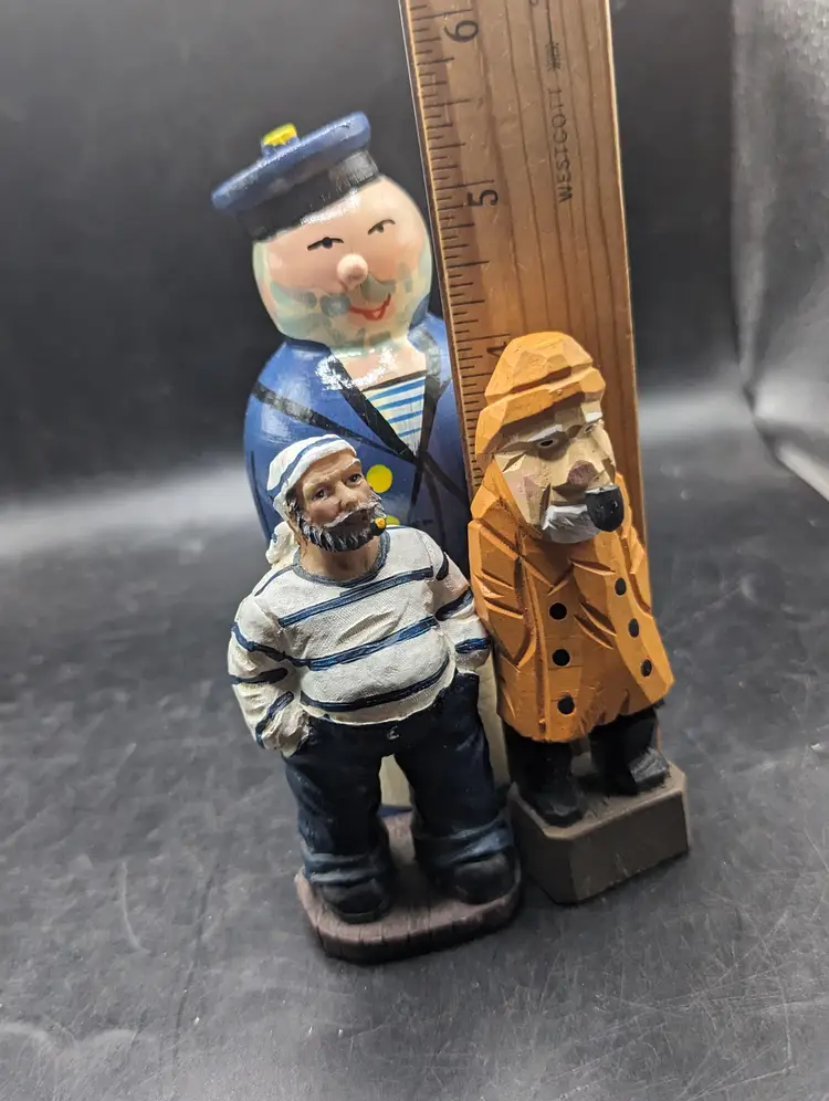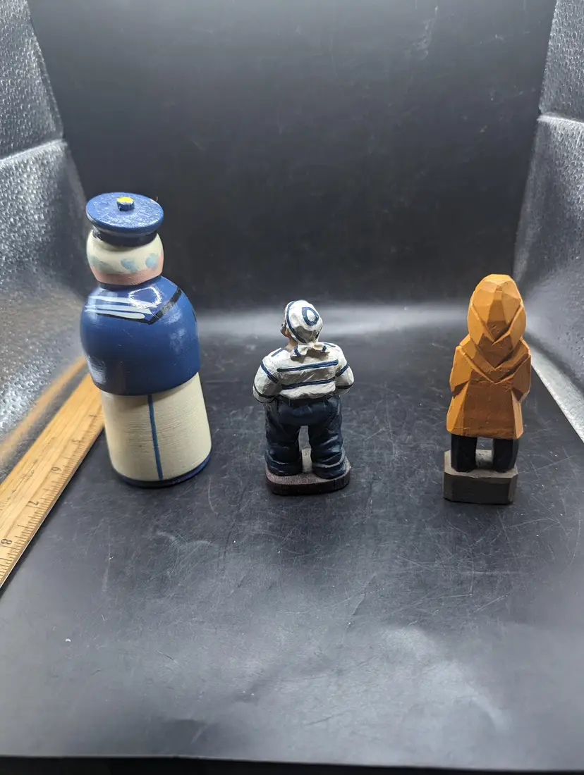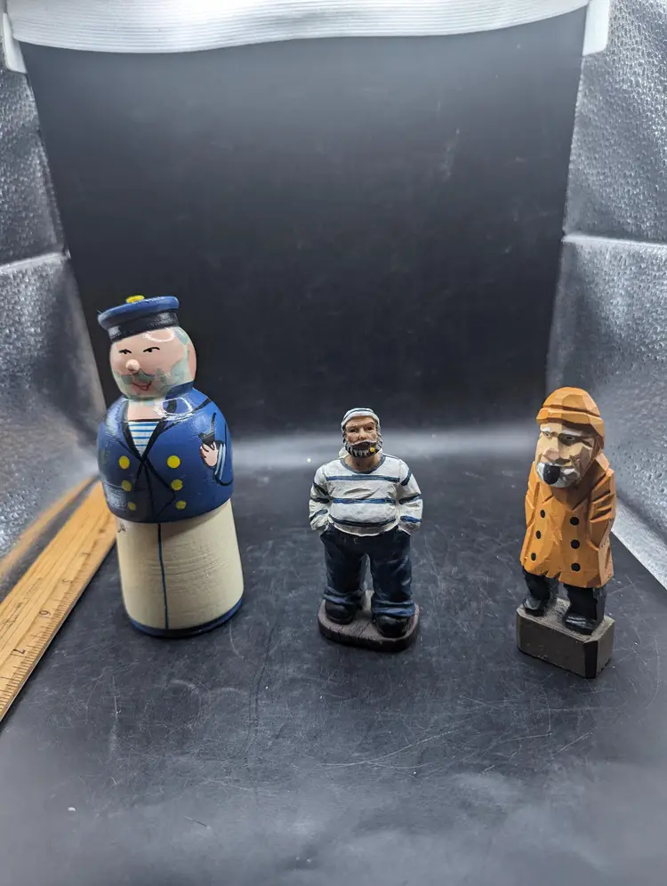 Set sail with this delightful trio of wooden sailor figurines. Each piece showcases unique craftsmanship, perfect for adding a nautical touch to your decor. Please see all pictures for condition and measurements.